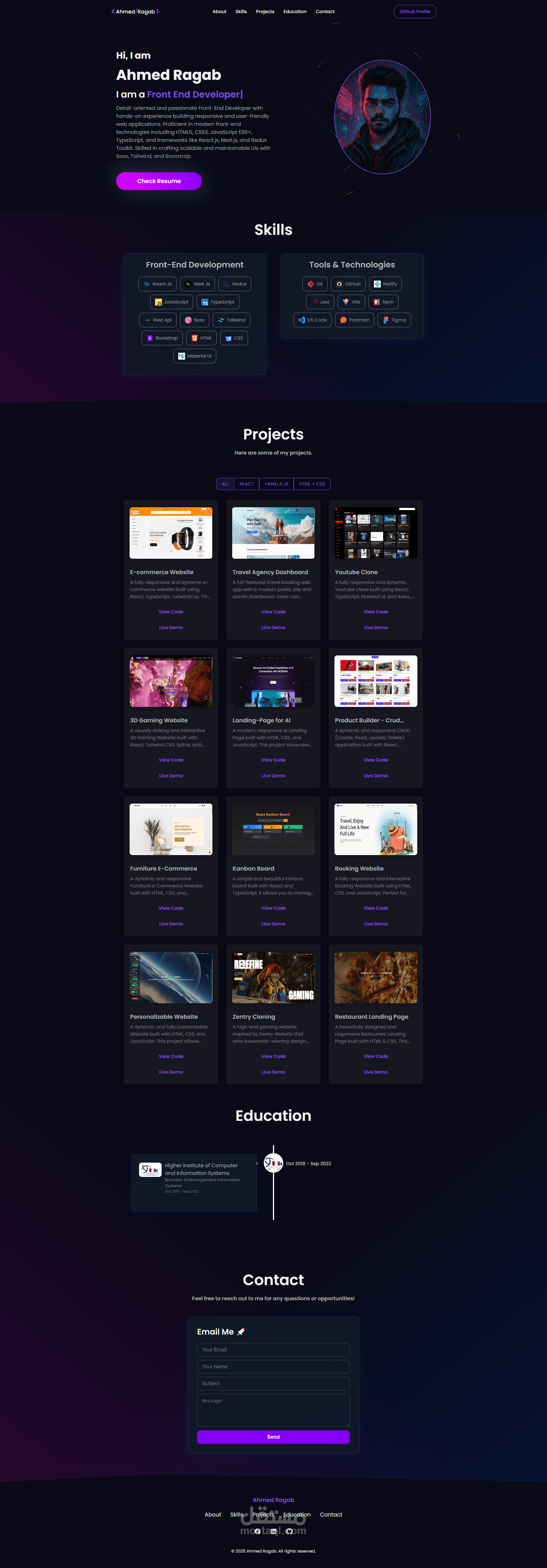 استخدمت فيه Material UI لتصميم واجهة نظيفة ومرتبة، وFramer Motion لتحريكات سلسة، وThree.js لإضافة عناصر ثلاثية الأبعاد مبهرة تضمن تجربة مستخدم حديثة ومميزة.