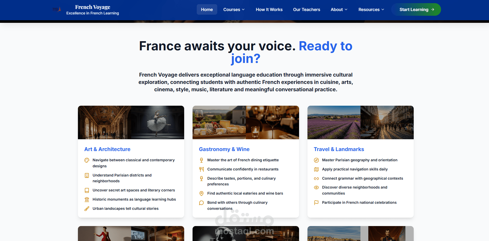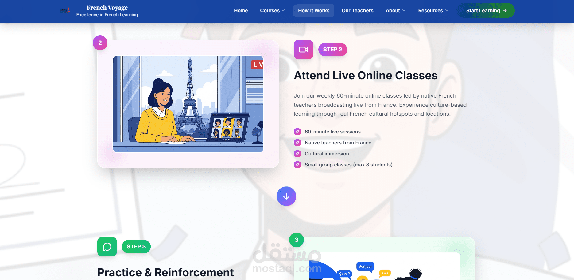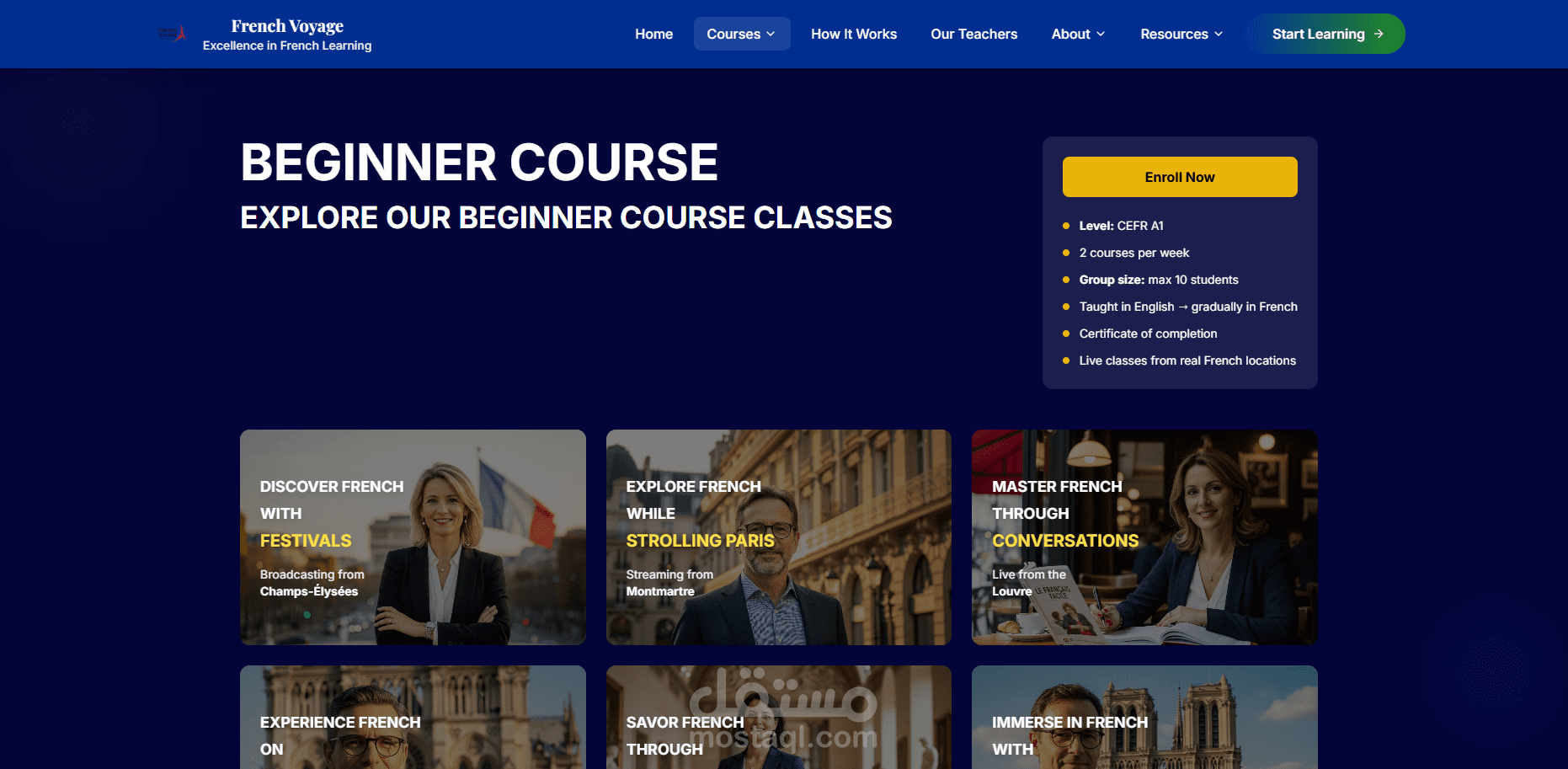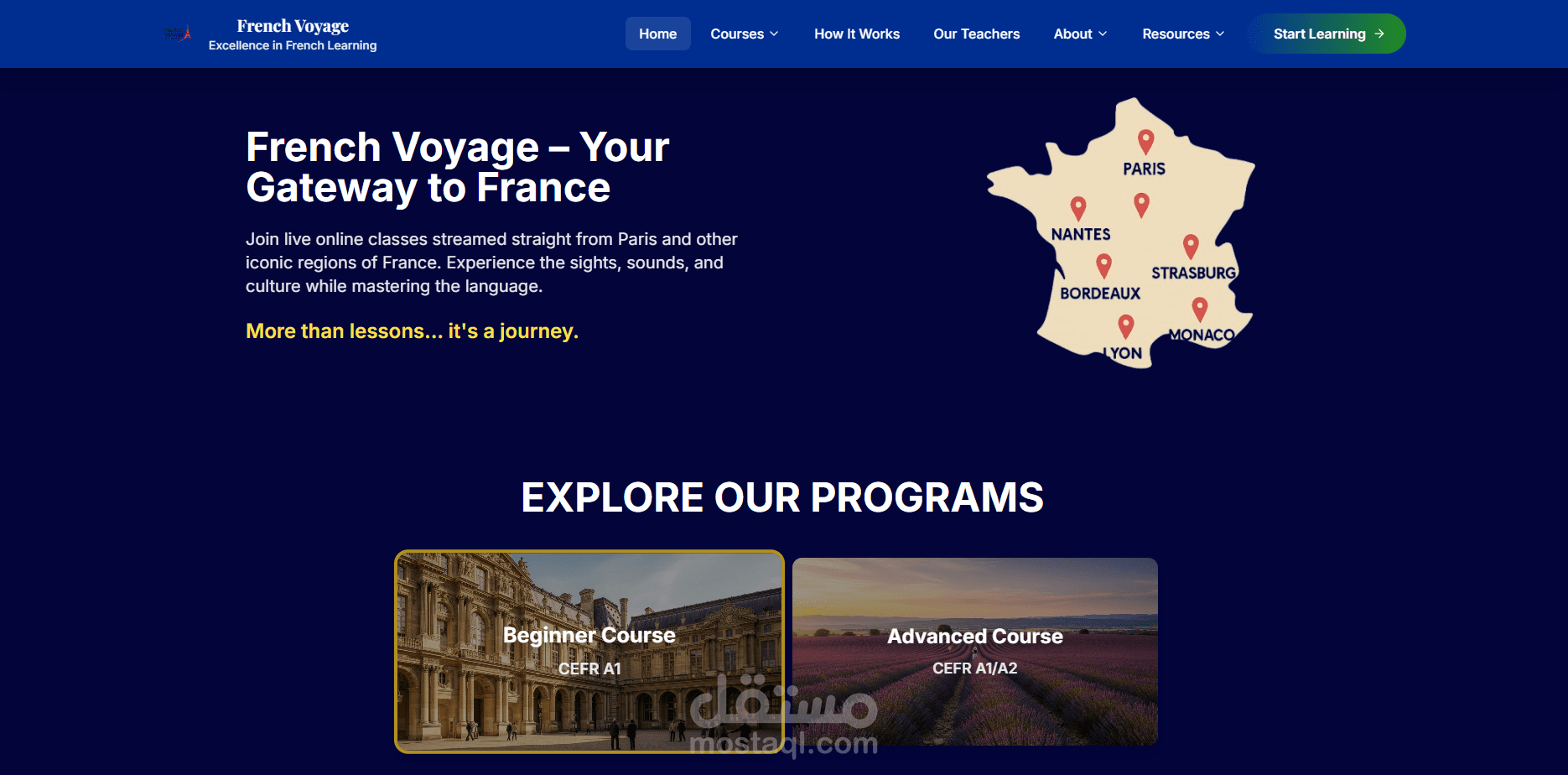 منصة تعليمية فريدة تقدم دروس فرنسية مباشرة من فرنسا! يتميز الموقع بتجربة تعلم ثقافية حقيقية حيث يتم بث الدروس مباشرة من المتاحف والمطاعم والمواقع الأثرية الفرنسية. المنصة تضم مستويين (مبتدئ ومتقدم) مع نظام دفع متكامل وواجهة مستخدم أنيقة بتصميم فرنسي أصيل.