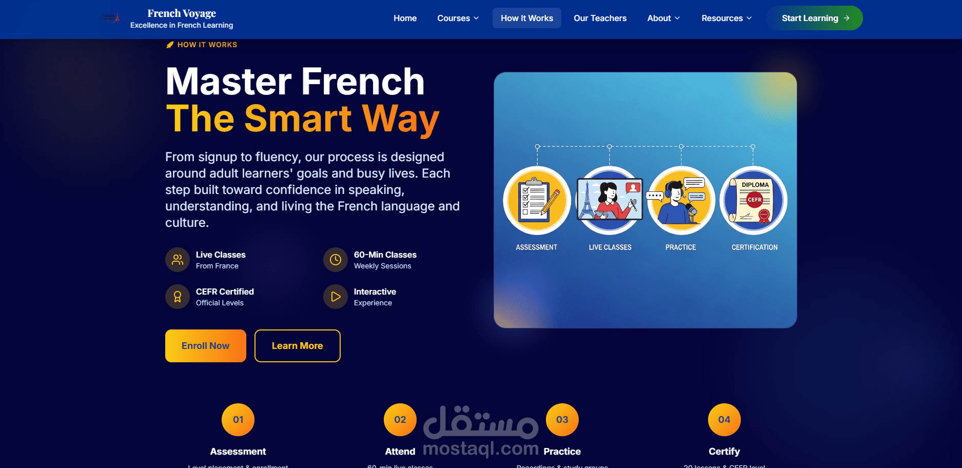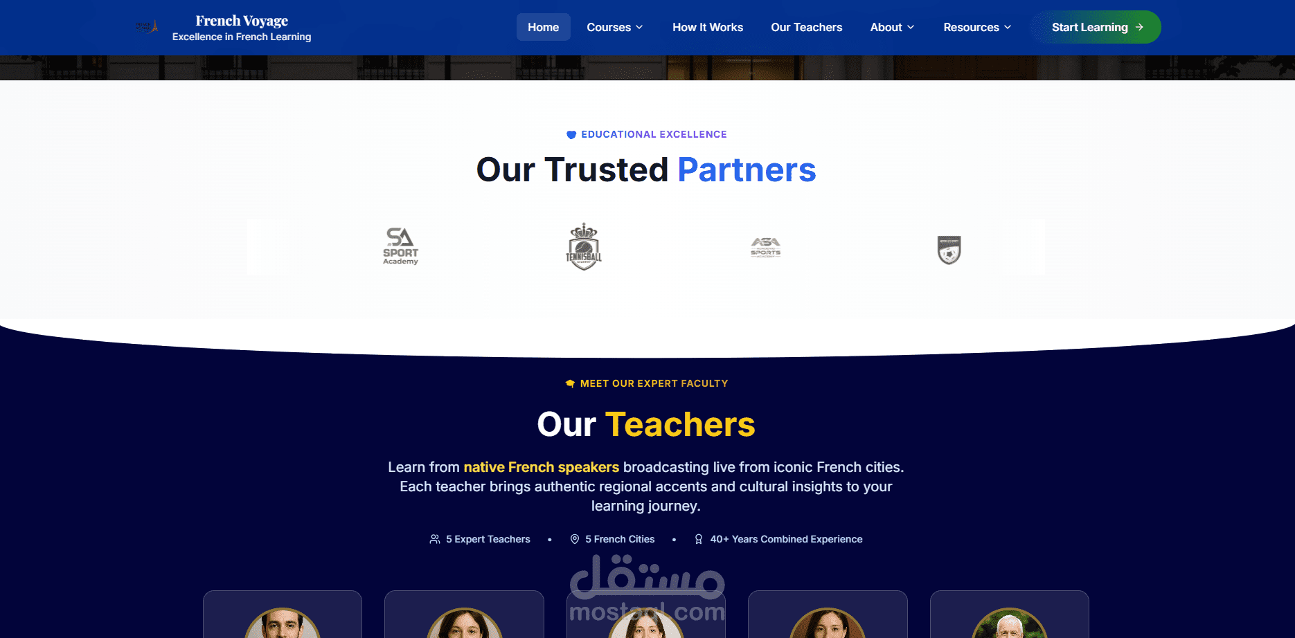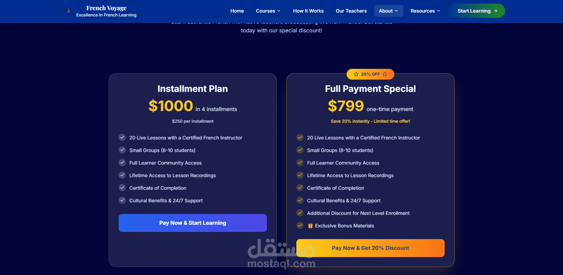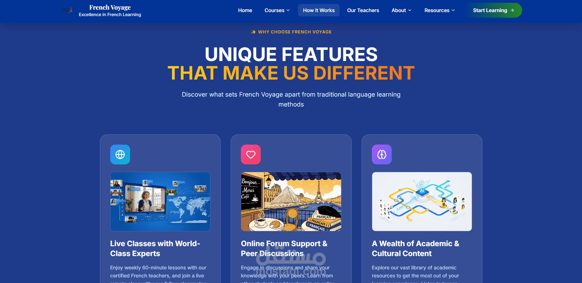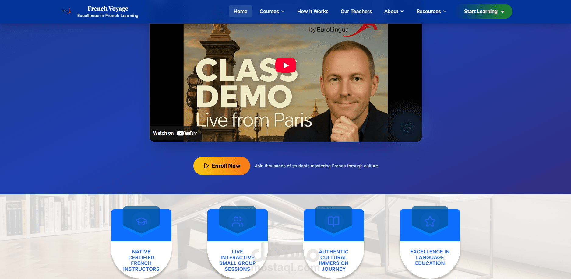 منصة تعليمية فريدة تقدم دروس فرنسية مباشرة من فرنسا! يتميز الموقع بتجربة تعلم ثقافية حقيقية حيث يتم بث الدروس مباشرة من المتاحف والمطاعم والمواقع الأثرية الفرنسية. المنصة تضم مستويين (مبتدئ ومتقدم) مع نظام دفع متكامل وواجهة مستخدم أنيقة بتصميم فرنسي أصيل.