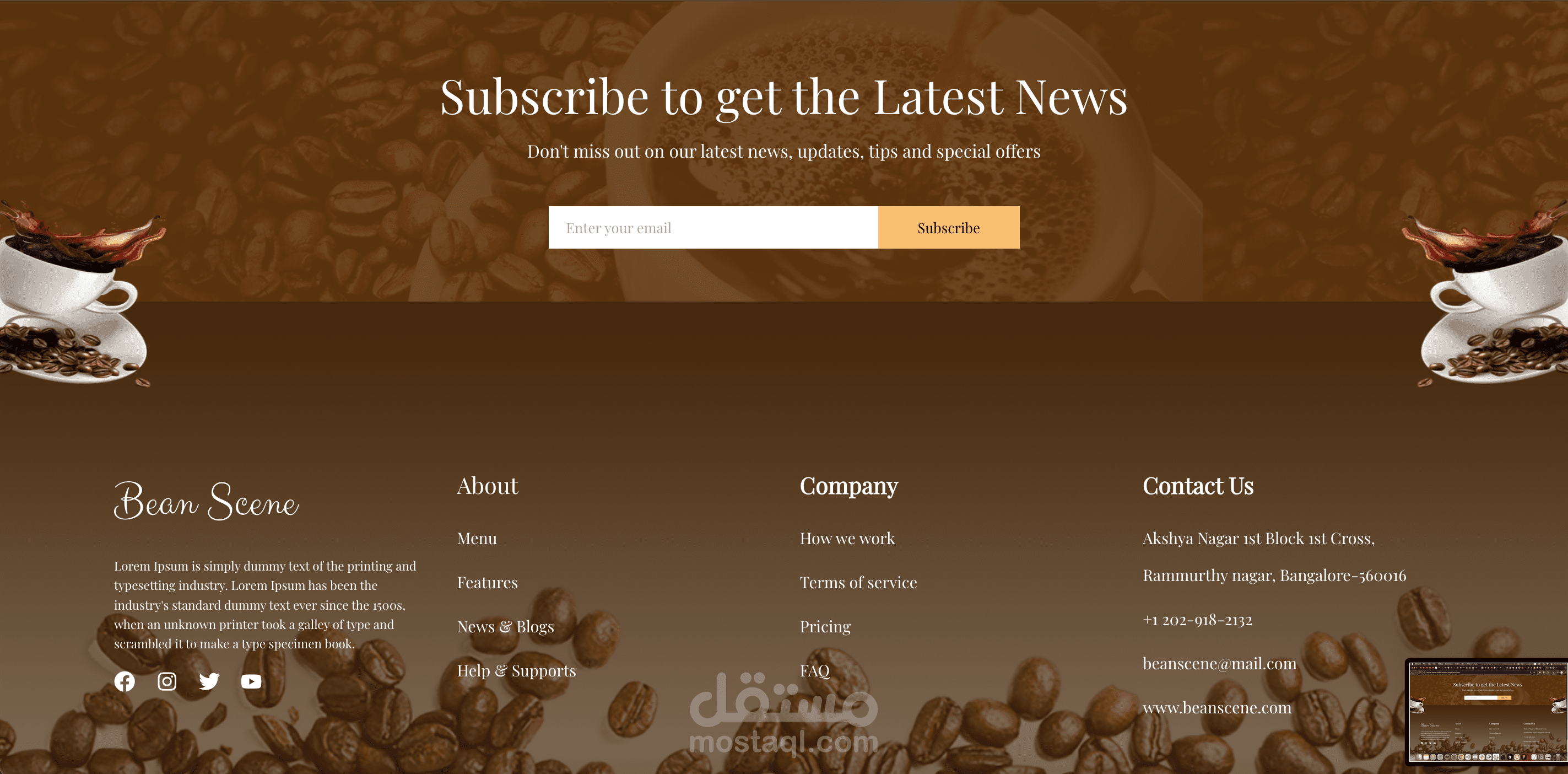 Bean Scene هي صفحة هبوط عصرية ومتجاوبة لمقهى، مبنية باستخدام Next.js وTypeScript وTailwind CSS. كان الهدف هو إضفاء الحيوية على تصميم Figma بواجهة مستخدم أنيقة، واستجابة سريعة تُركّز على الأجهزة المحمولة، وأداء قوي. نفّذتُ مكونات تفاعلية، وهيكلًا مُحسّنًا لمحركات البحث، وأقسامًا قابلة لإعادة الاستخدام مثل "الرئيسية"، و"حول"، و"المنتجات المميزة"، و"النشرة الإخبارية". يُبرز هذا المشروع مهاراتي في بناء صفحات ويب سريعة وسهلة الوصول وجذابة بصريًا.