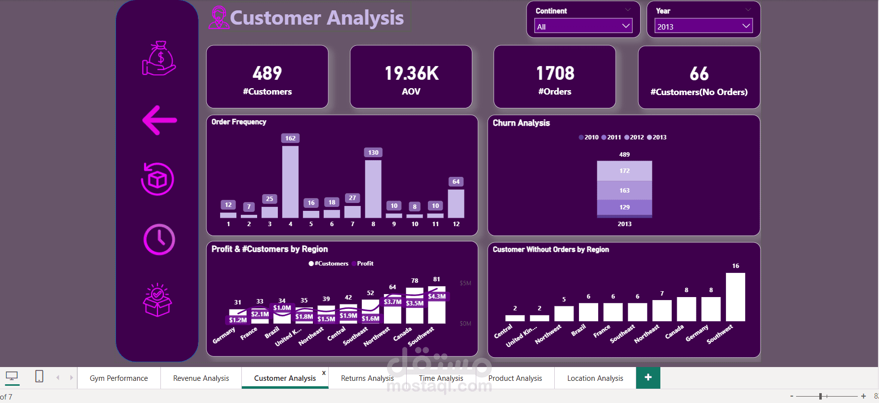 يحلل تكرار الطلبات (Order Frequency)، ومعدل التغيير (Churn Analysis) خلال السنوات.