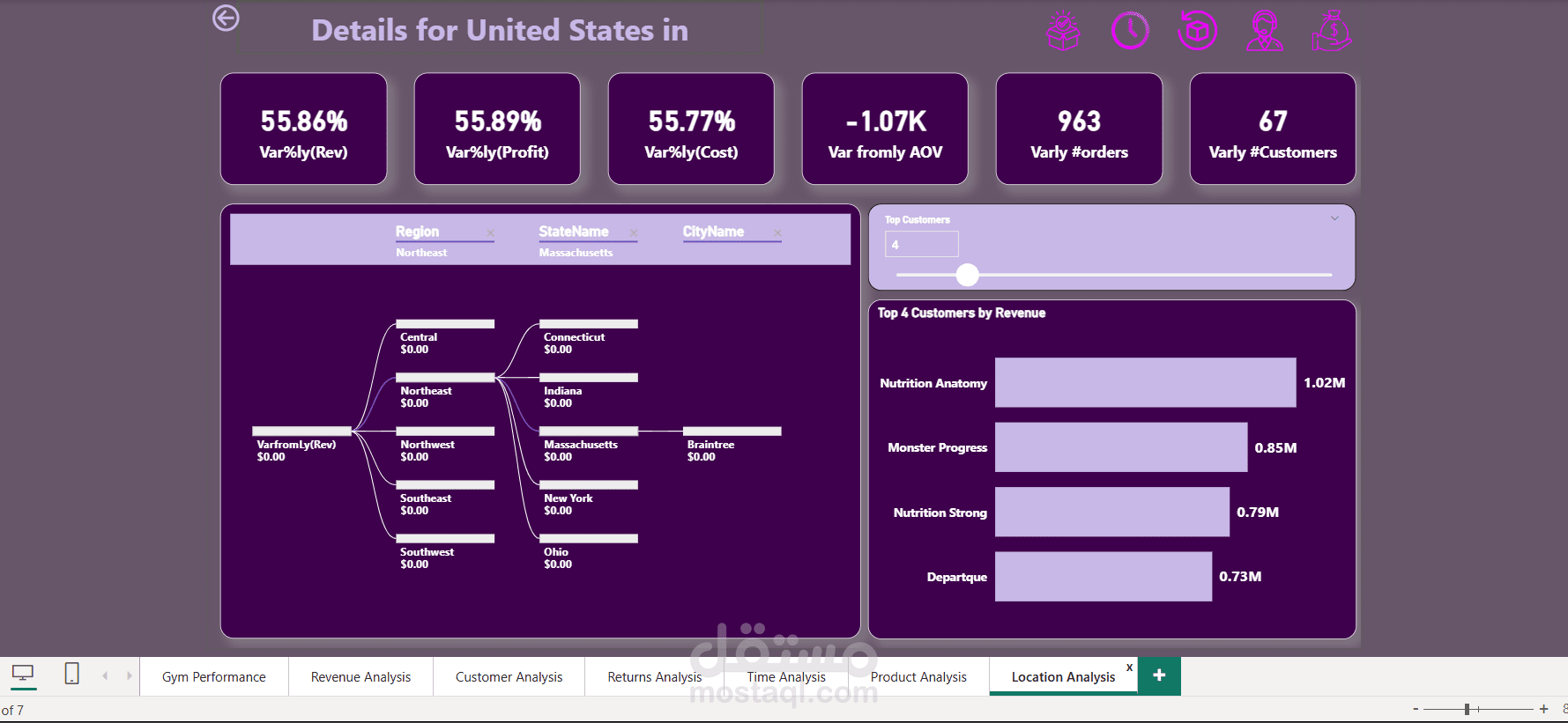 يتمثل المشروع في لوحة تحكم (Dashboard) مصممة لتحليل أداء أعمال تتعلق باللياقة البدنية والمكملات الغذائية، وتوفر نظرة شاملة على جوانب متعددة من العمل.