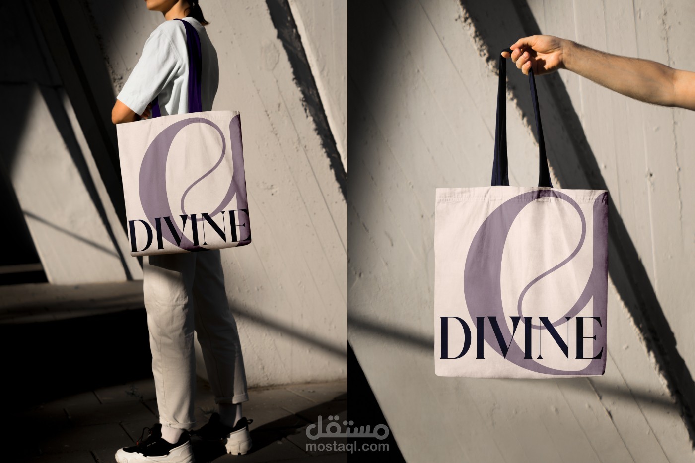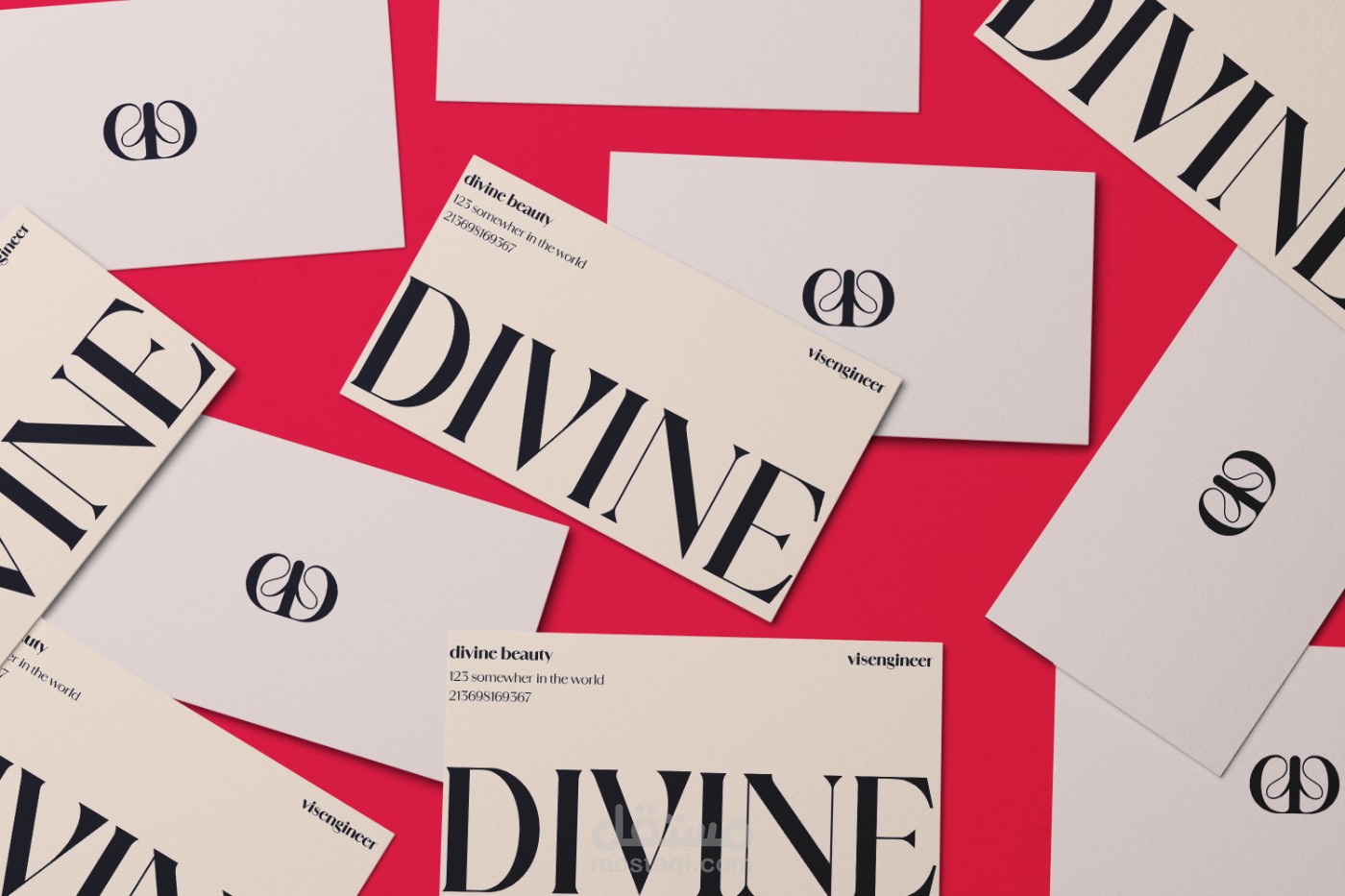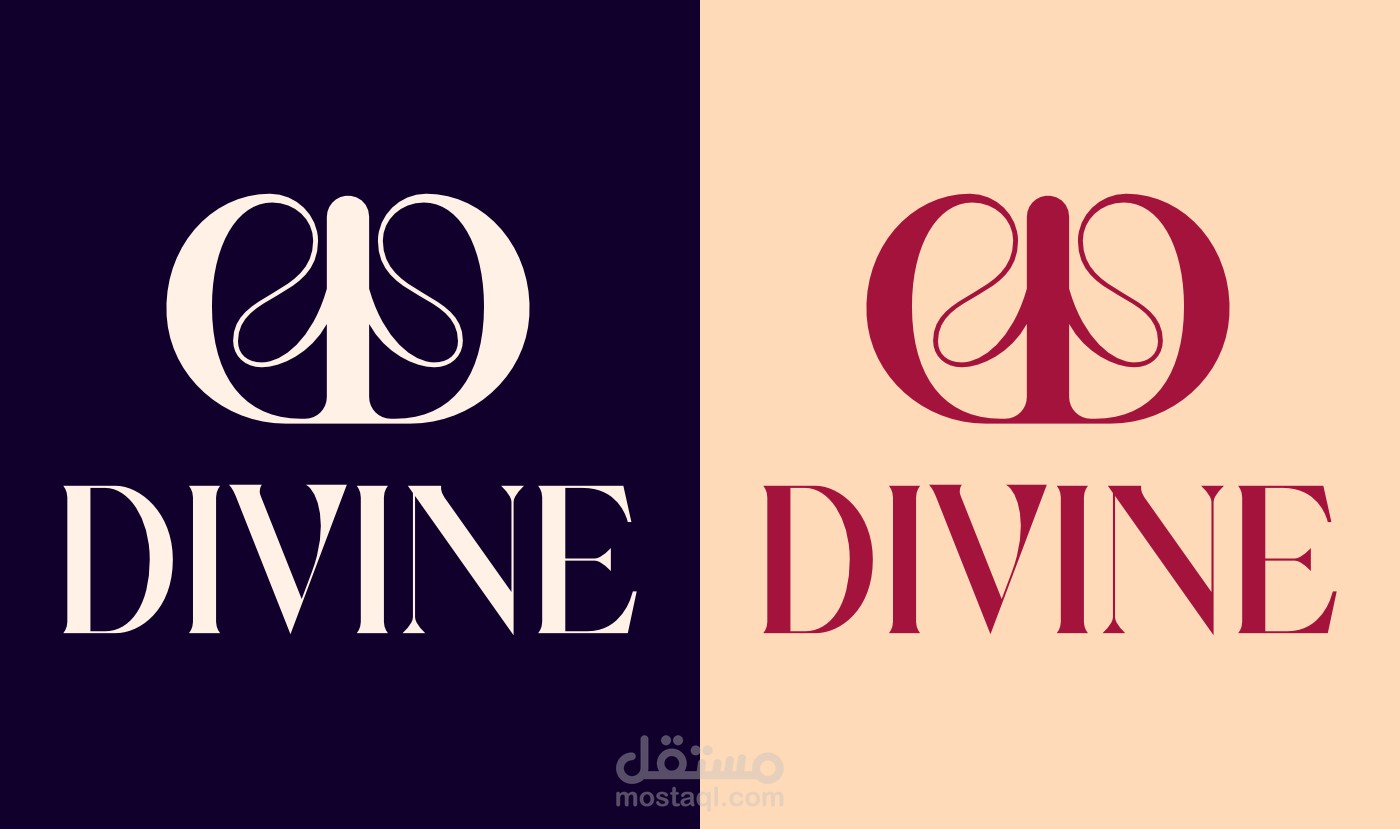 تم تصميم هوية "DIVINE" لمستحضرات التجميل والموضة لتعكس الفخامة، الأنوثة، والروحانية. الاسم يوحي بالجمال المقدّس، بينما يعبّر التصميم عن الأناقة المعاصرة والثقة.