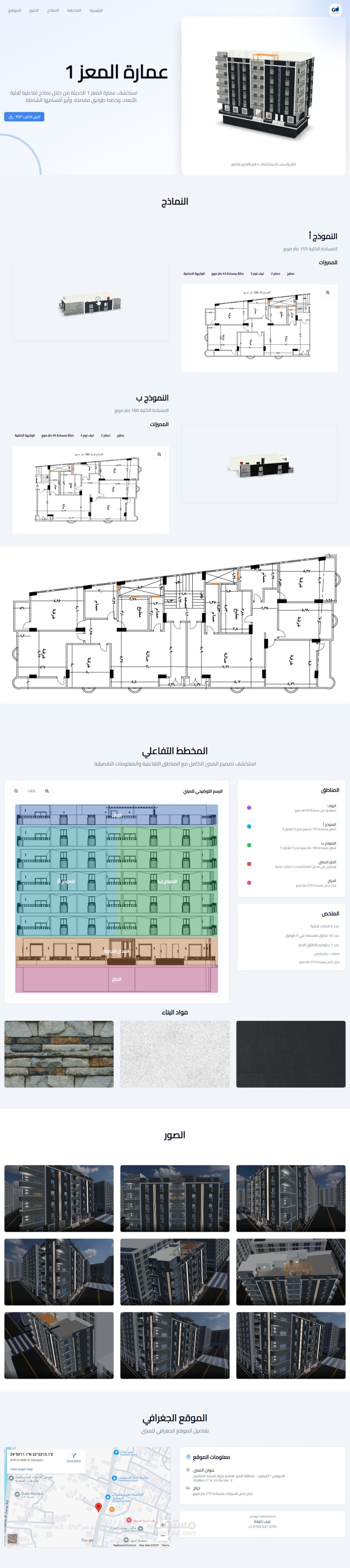 - تصميم موقع شخصي او صفحة هبوط لعرض المبني كمجسم 3D وتفاصيله والملحقات مع صور وخرائط تفاعلية