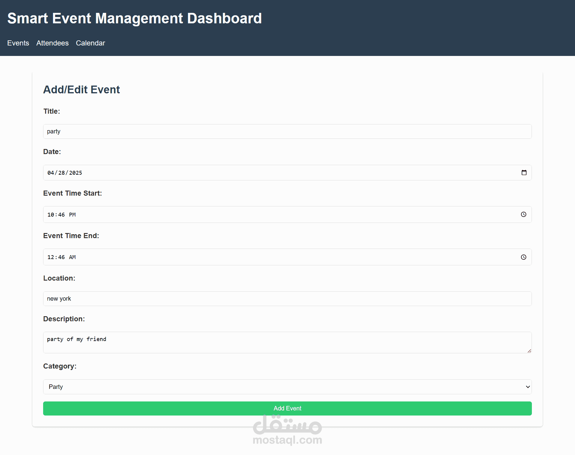 The application allows users to add and edit events, manage attendees, and view events by category or calendar.