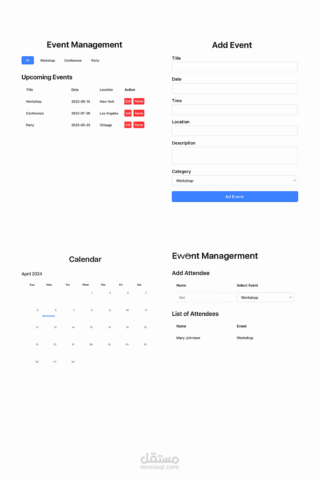يتيح التطبيق للمستخدمين إمكانية إضافة وتعديل الفعاليات، إدارة الحضور، وعرض الفعاليات حسب الفئة أو على شكل تقويم.