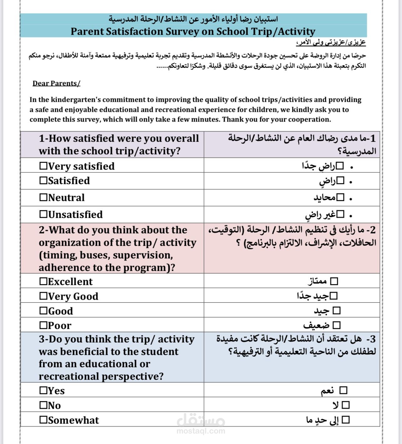 The Parents Satisfaction Survey aimed to evaluate the level of satisfaction among parents regarding various aspects of the educational environment, including communication, safety, teaching quality, and child development. The results were analyzed and presented in a clear report to help the institution identify strengths and areas for improvement, with the ultimate goal of enhancing the overall experience for children and their families.