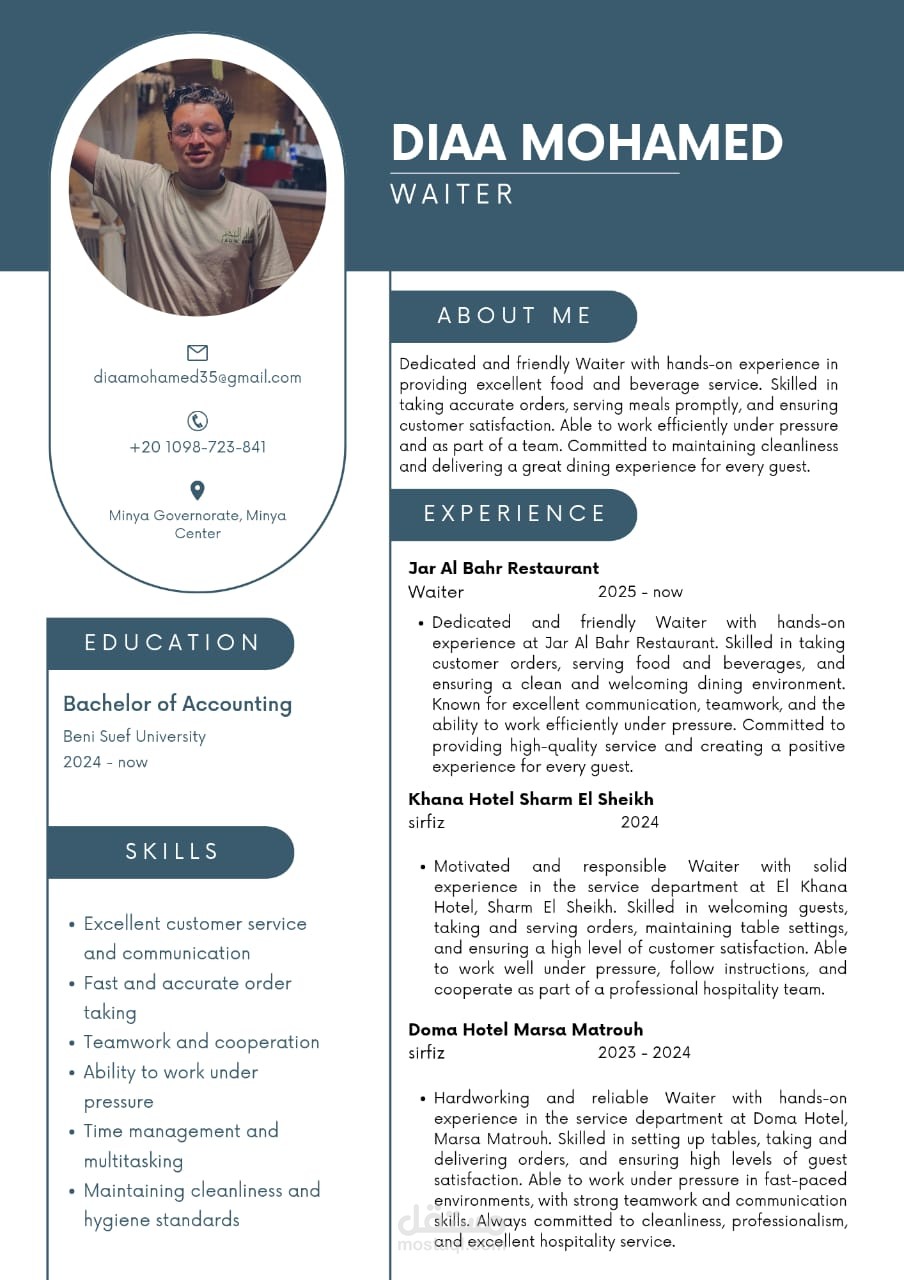 هذا العمل عبارة عن سيرة ذاتية لويتر لقد قمت ب إعدادها باستخدام برنامج canva و تحتاج السير الذاتية ل الوقت و الصيغة الصحيحه و المناسبة مع اختيار خط و صور مناسبة