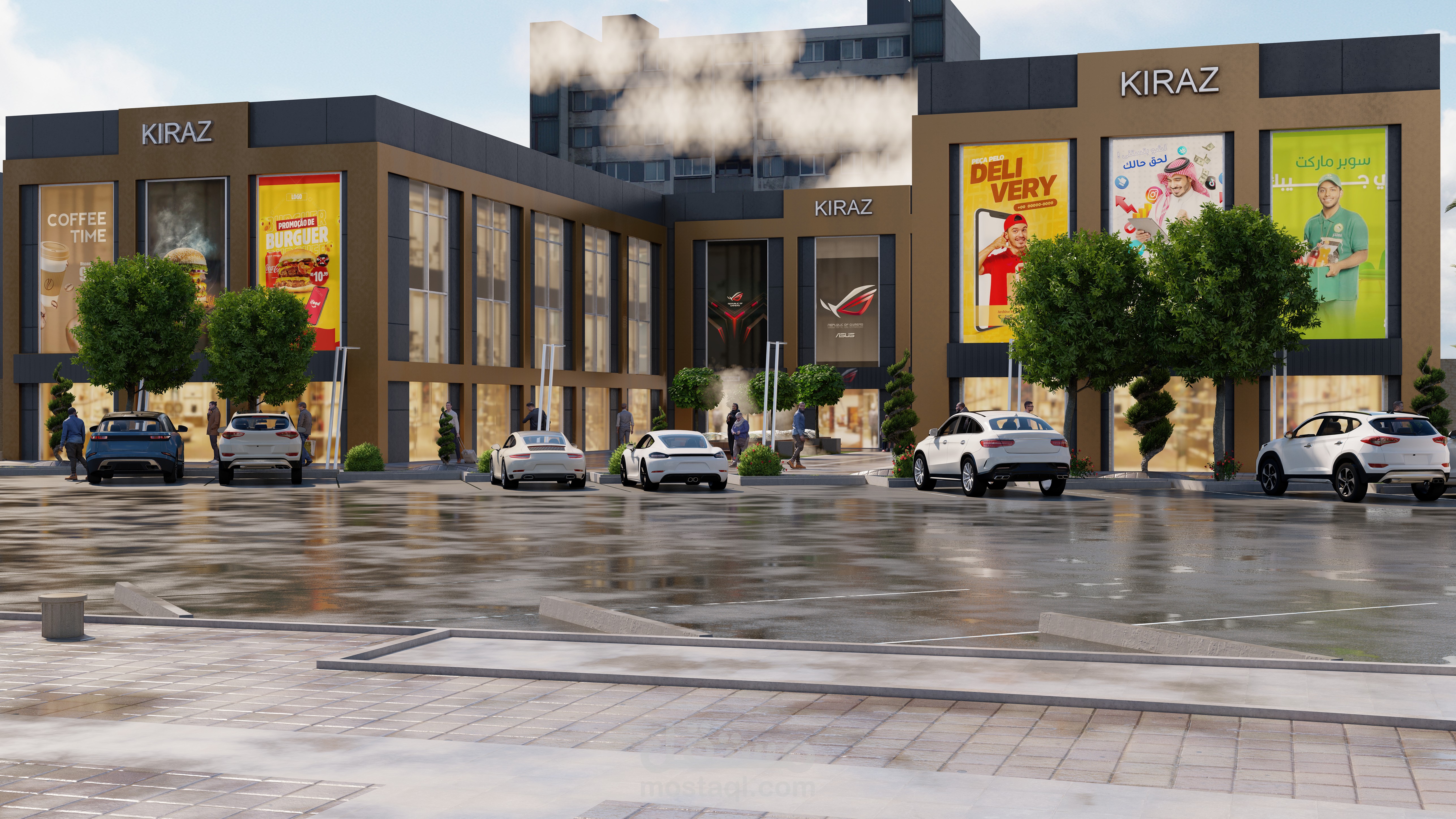 تصميم واجهات مركز تجاري في المملكة العربية السعودية بطراز حديث مع تنسيق لاند سكيب لمساحة البهو الخارجي