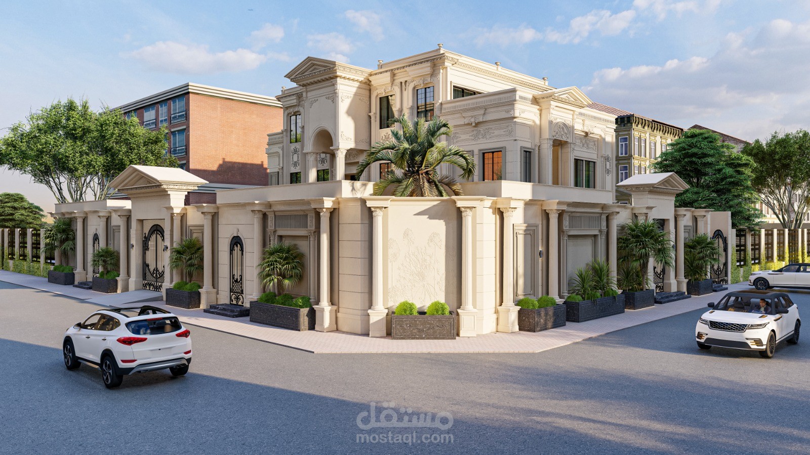 هذا التصميم له طابعًا كلاسيكيًا راقيًا يجمع بين الفخامة والتناسق المعماري. تتكون الواجهة من عناصر معمارية متكاملة أبرزها الأعمدة الكورنثية المزخرفة التي تضيف إحساسًا بالعراقة والفخامة، وتُبرز الإطار العام للواجهة بأسلوب متوازن.