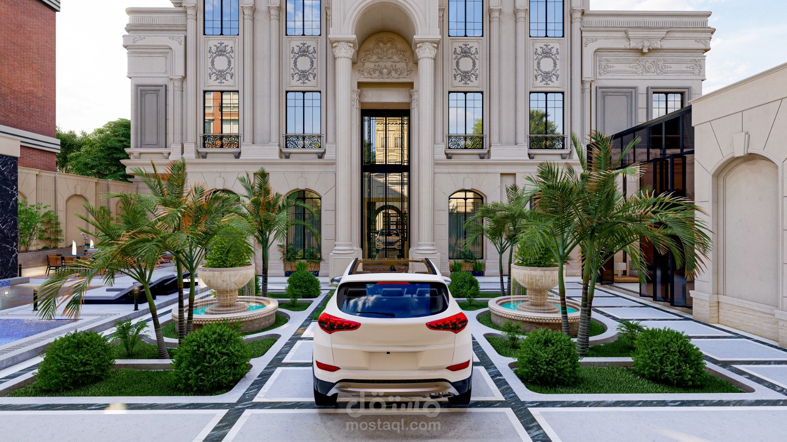 المدخل الرئيسي يتوسط الواجهة ويتسم بهيكل ضخم يعلوه مثلث كلاسيكي (Fronton) مدعوم بأعمدة مزدوجة، ما يعزز من هيبة وقوة الواجهة. البوابة الحديدية ذات النقوش الفاخرة تكمل الطابع الملكي للتصميم، مع تكرارها على بوابة السيارات الجانبية بأسلوب متناغم.