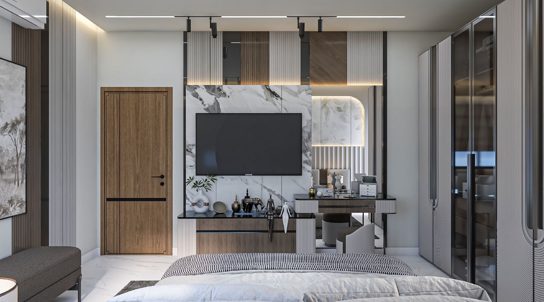 السقف مزود بنظام إضاءة مخفي وخطوط إضاءة سبوت لايت تعزز من أجواء الغرفة، بالإضافة إلى وحدات إنارة موجهة تُبرز عمق التصميم.