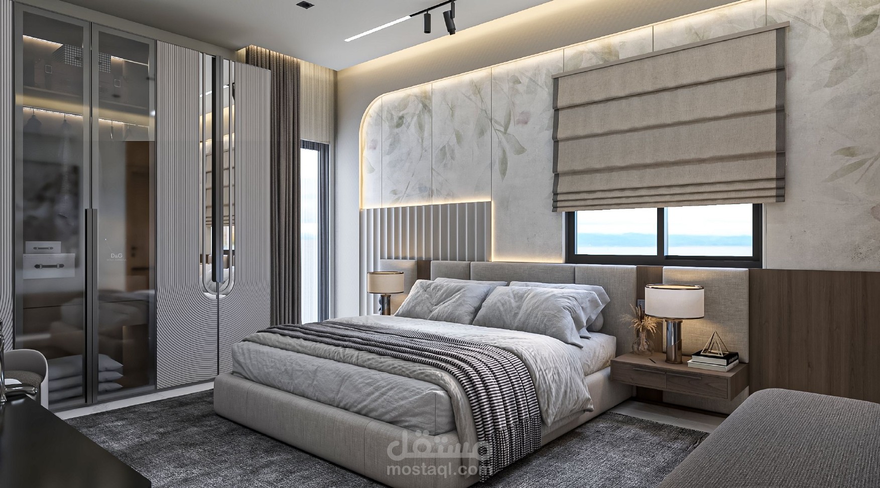 تُجسّد هذه الغرفة مفهوم الأناقة الهادئة، بتصميم عصري متوازن يمزج بين البساطة والدفء. يتوسط الغرفة سرير مبطن بخامات قماشية ناعمة باللون الرمادي الفاتح، يحيط به كومودان أنيقان مزودان بإضاءة جانبية دافئة ولمسات ديكورية بسيطة تضيف طابعًا شخصيًا.