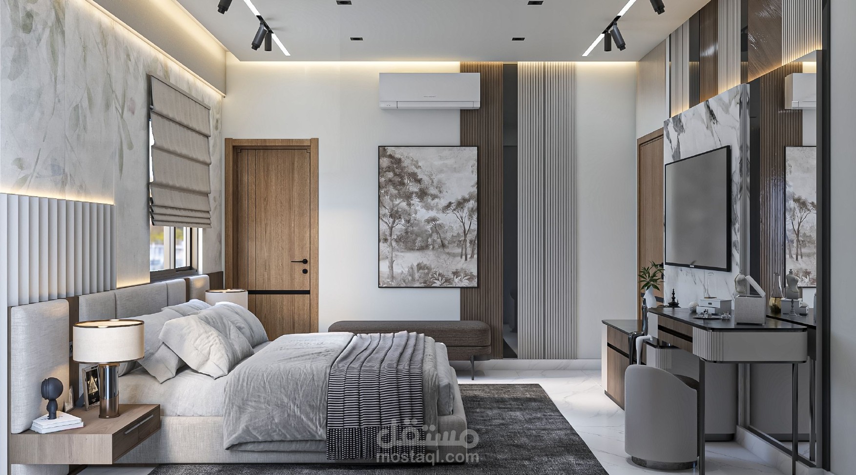 الأرضية مغطاة برخام أبيض بخطوط رمادية رقيقة، تضيف إحساسًا بالنظافة والاتساع، ويغطي جزءًا منها سجادة داكنة تعزز الدفء والتباين. تم استغلال الجدار المقابل للسرير بلوحة فنية كبيرة، تعكس روح الطبيعة وتكمل لوحة الألوان الهادئة بالغرفة، مع مقعد بسيط عملي بجانبها.