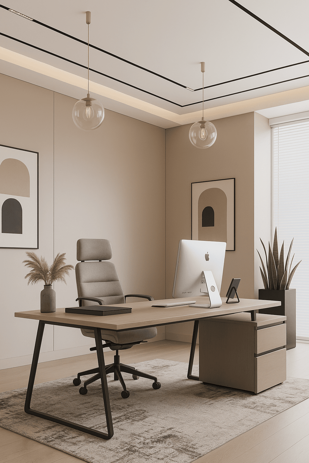 مكتب شركة ناشئة تم تصميمه بأسلوب مينيمالي يركز على الراحة البصرية والإنتاجية. تم اختيار ألوان هادئة مع لمسات خشبية.
