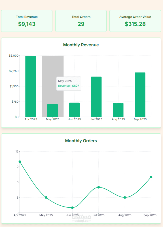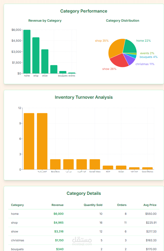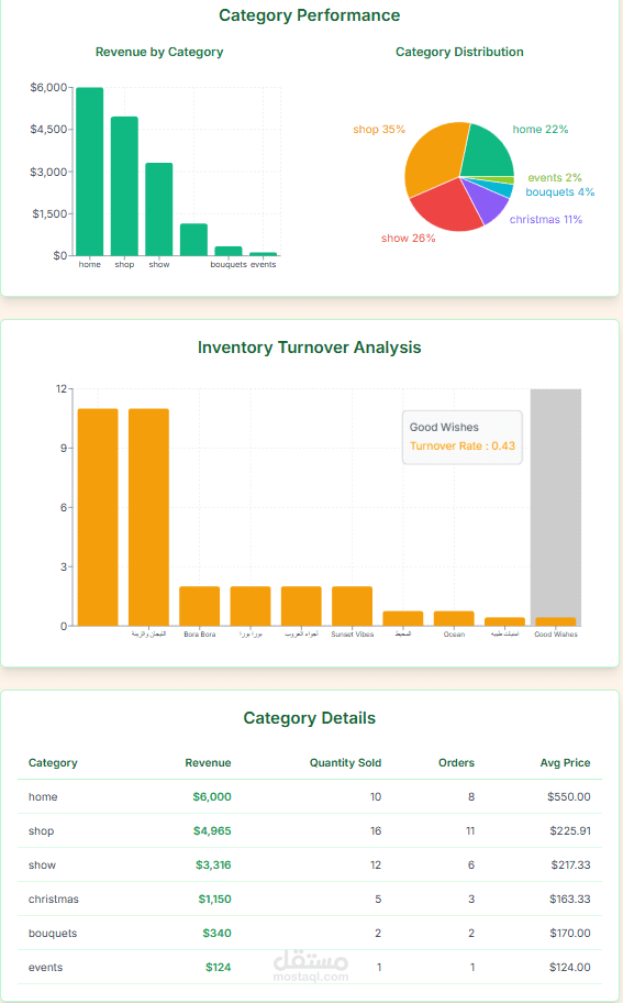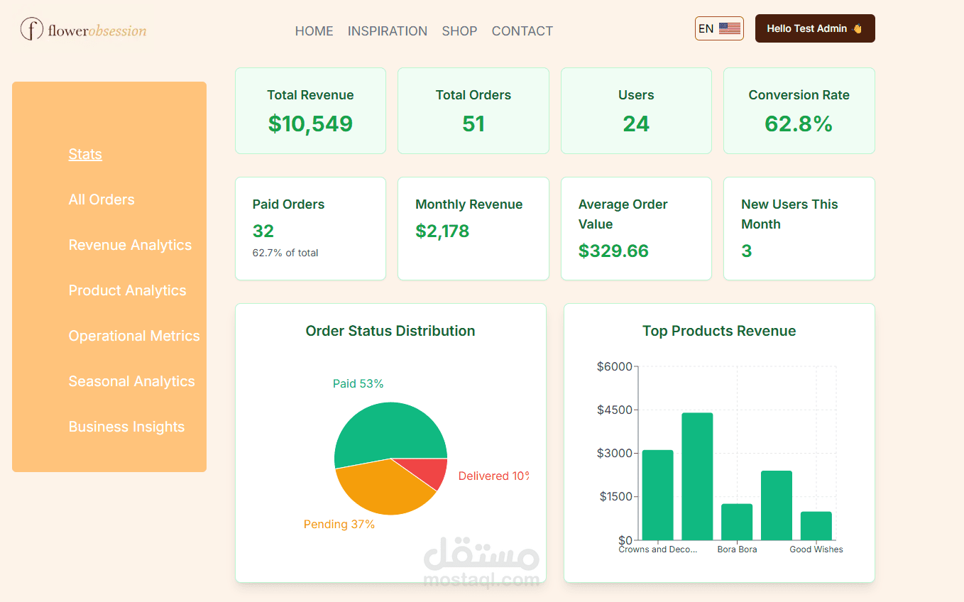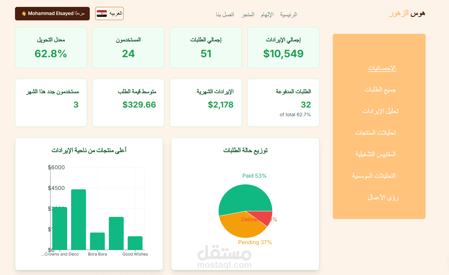 - لوحة تحكم إدارية تعرض تحليلات، مخططات، ومقاييس عملية