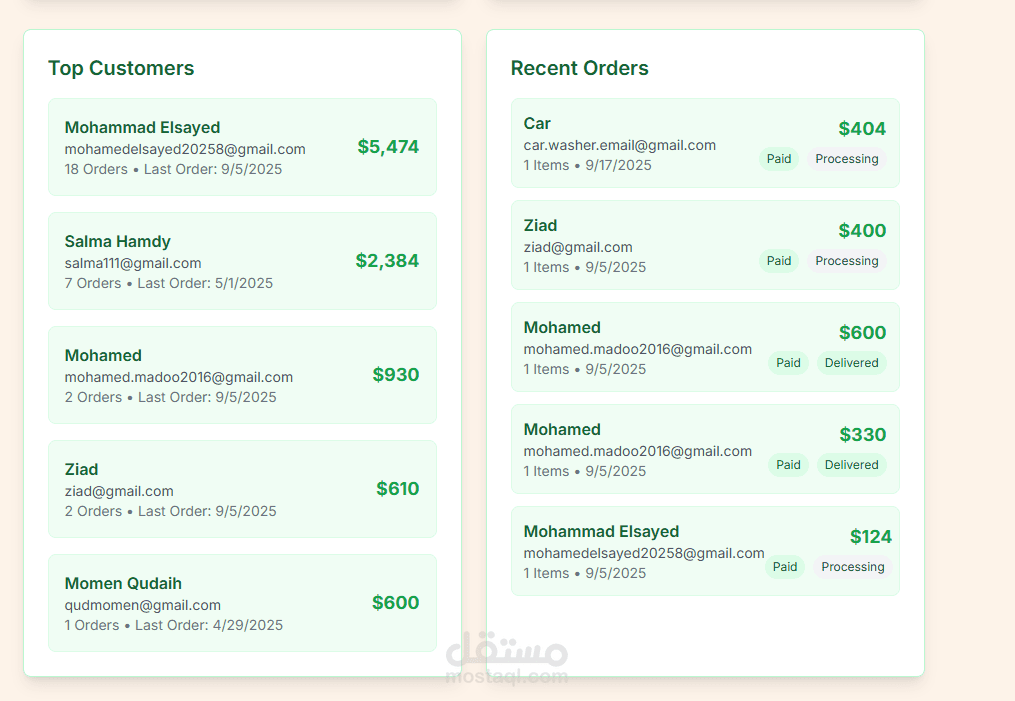 - تنفيذ دفع قوي — تدفق Stripe كامل مع checkout و webhooks، وتجريد يسمح بإضافة طرق دفع إضافية، ودعم الدفع النقدي عند التسليم