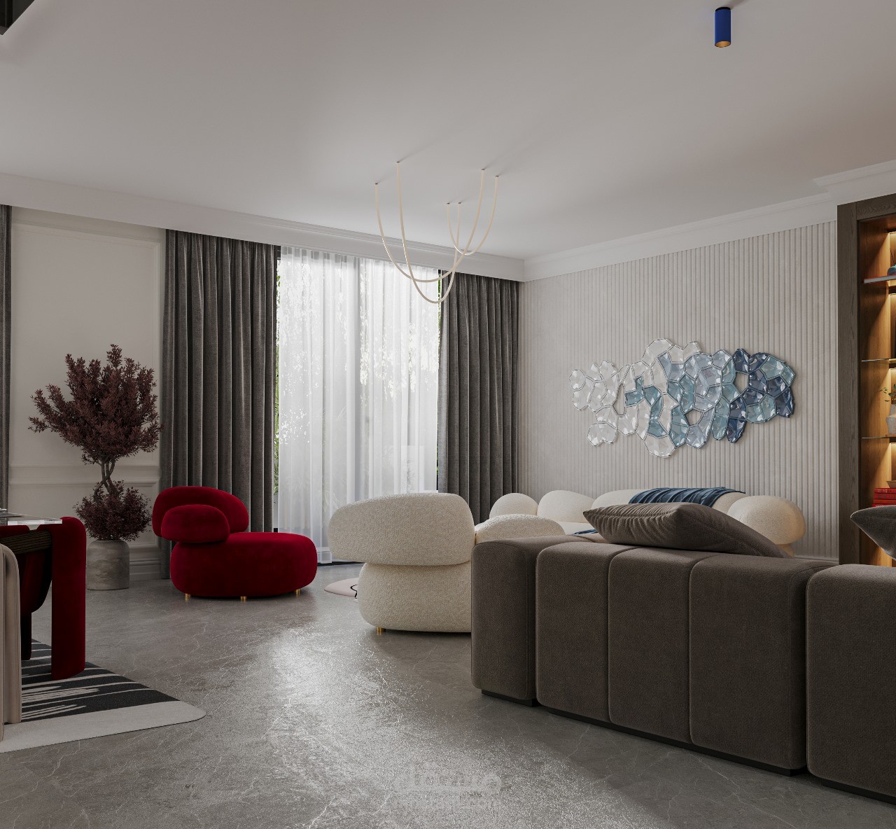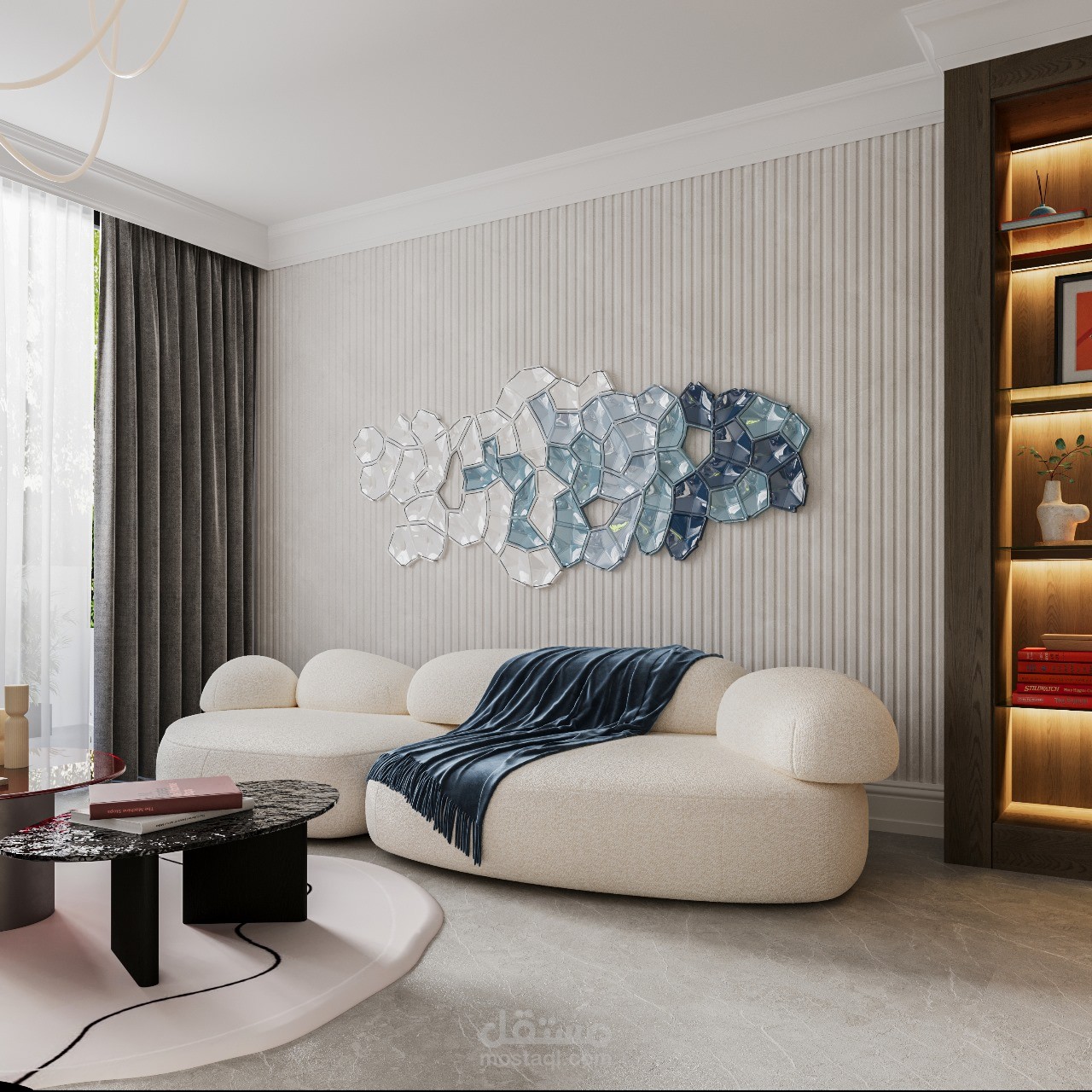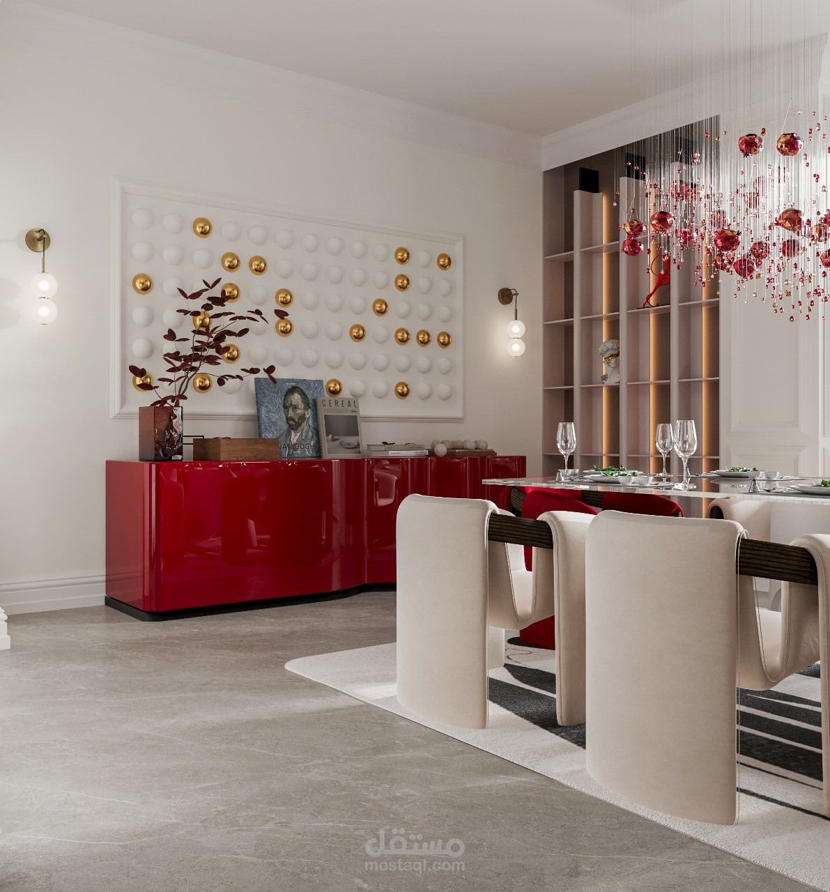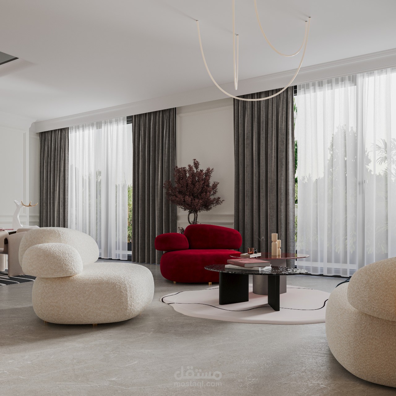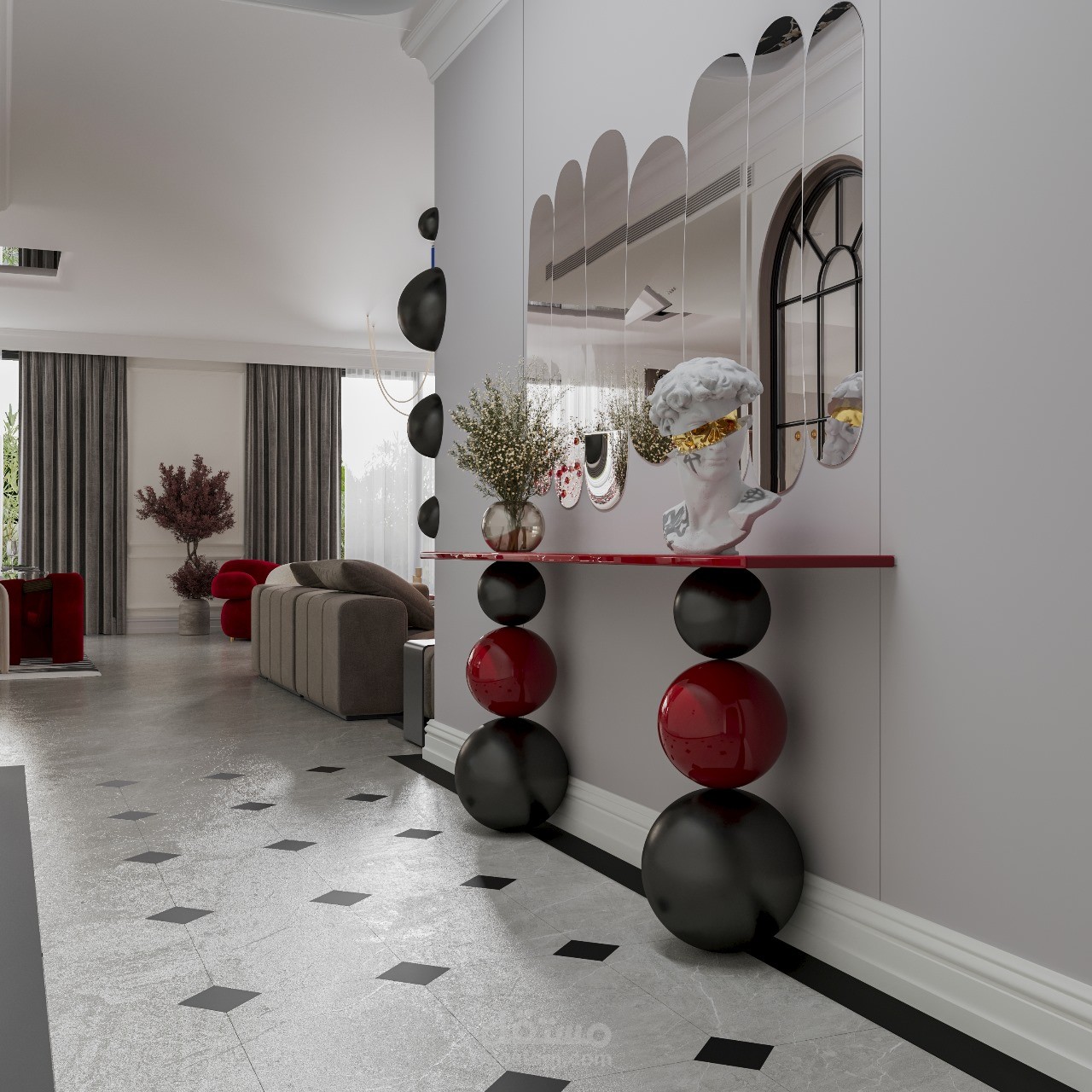 تصميم داخلي لرسيبشن في فيلا بالسعودية، بأسلوب عصري يجمع بين الأناقة والعملية.