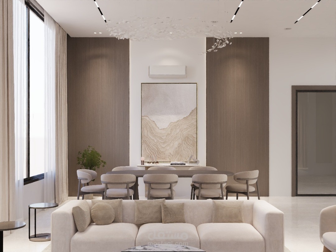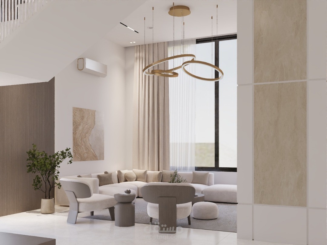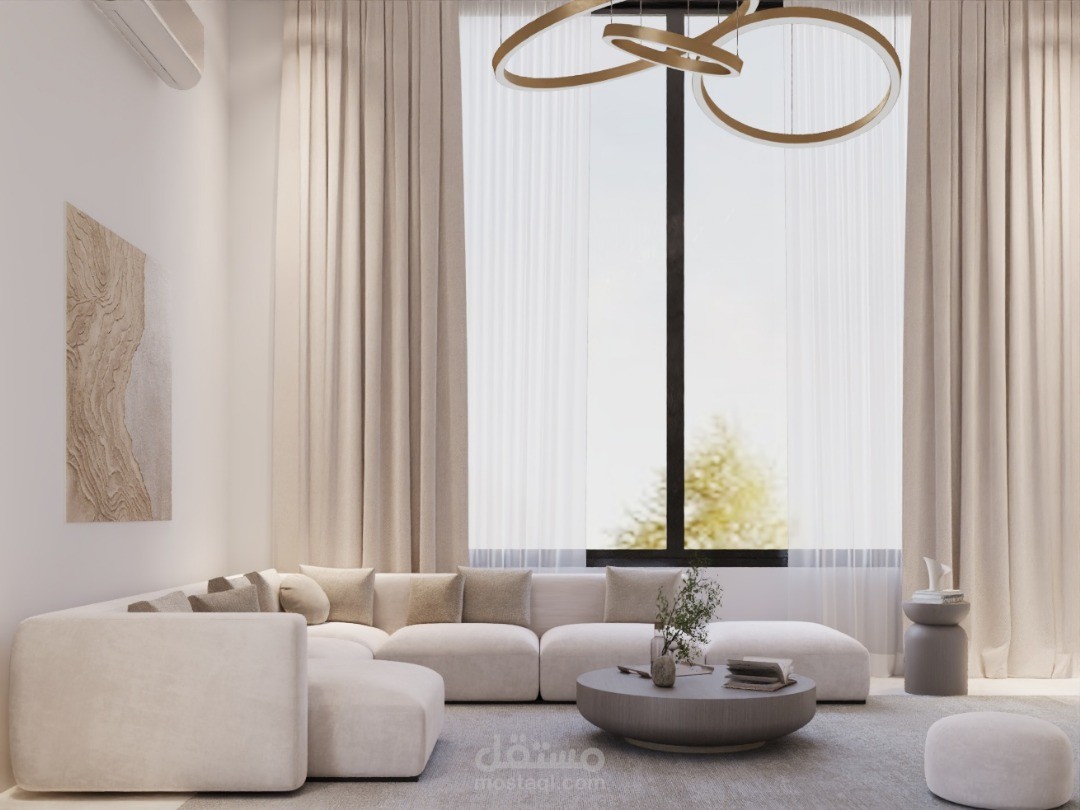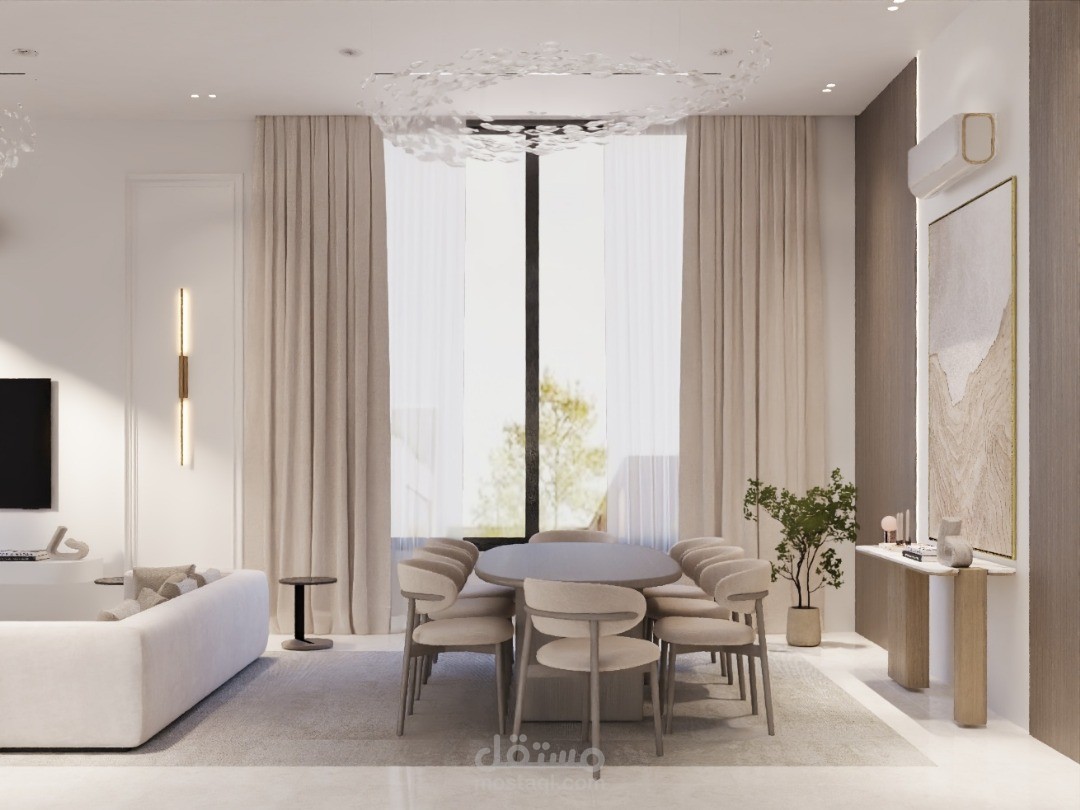 تصميم داخلي لفراغ معيشة (مكونة من فراغ معيشة وطعام بالإضافة الى المطبخ) على الطراز البسيط الاعتماد على ديكورات واكسسوارات بسيطة قطع الاثاث حديثة وعصرية الوان مريحة واضاءة بسيطة لفراغ مريح.