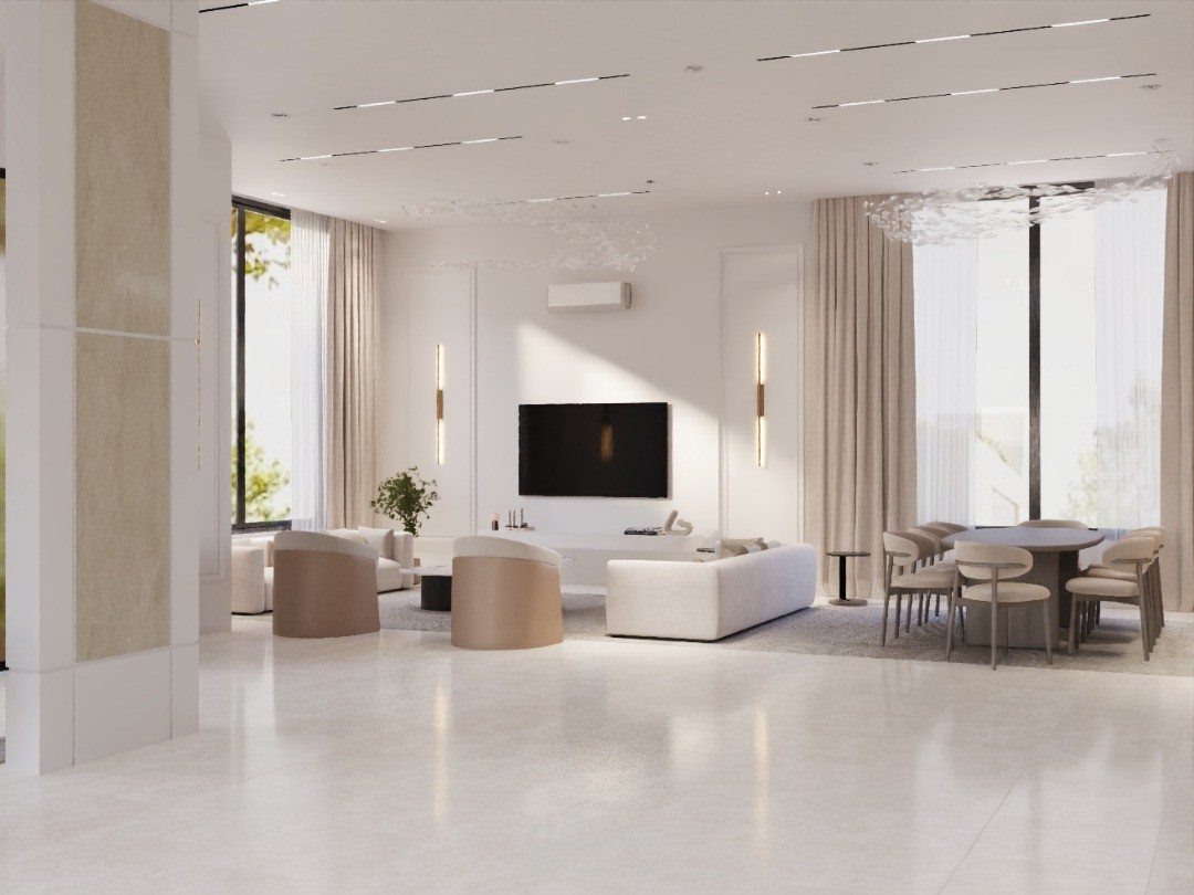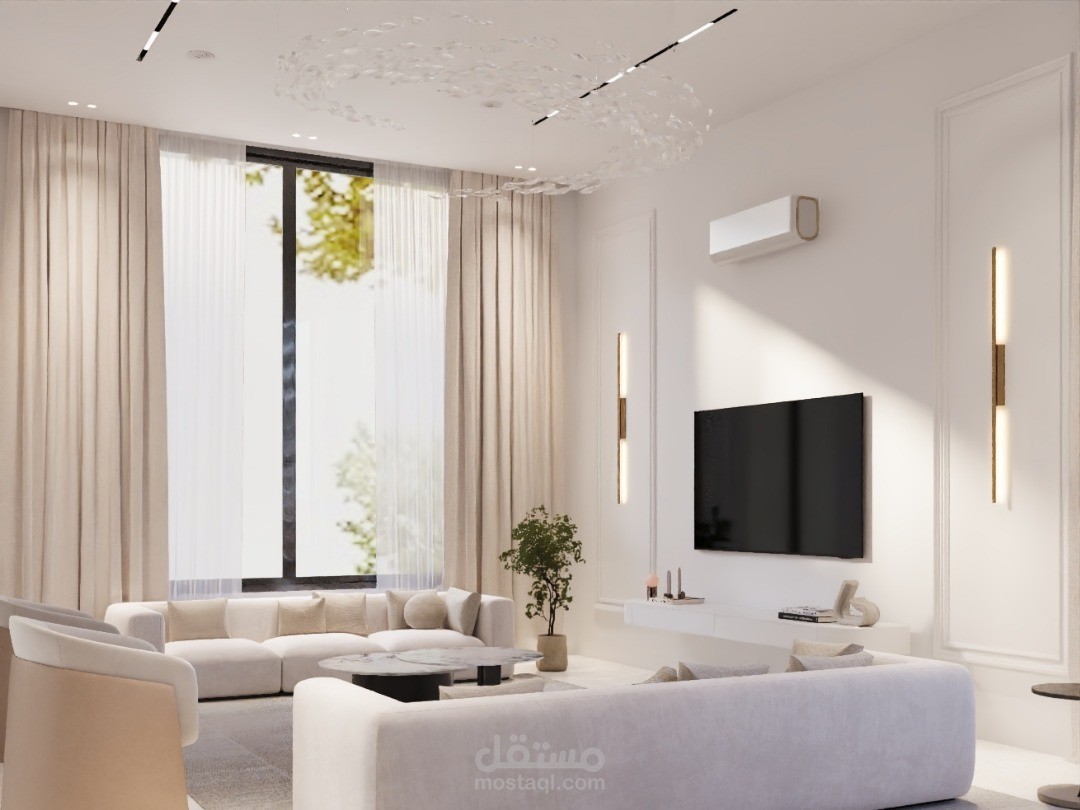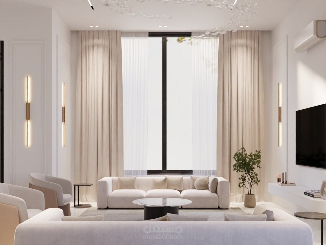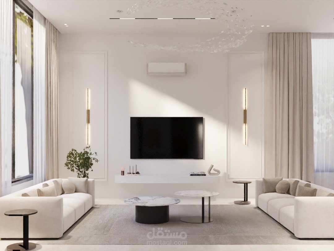 تصميم داخلي لفراغ معيشة (مكونة من فراغ معيشة وطعام بالإضافة الى المطبخ) على الطراز البسيط الاعتماد على ديكورات واكسسوارات بسيطة قطع الاثاث حديثة وعصرية الوان مريحة واضاءة بسيطة لفراغ مريح.
