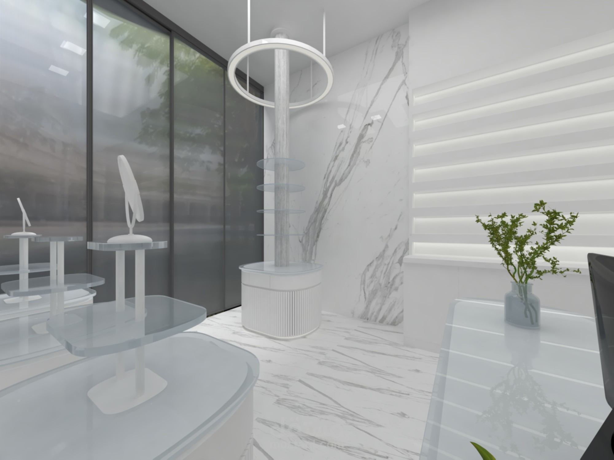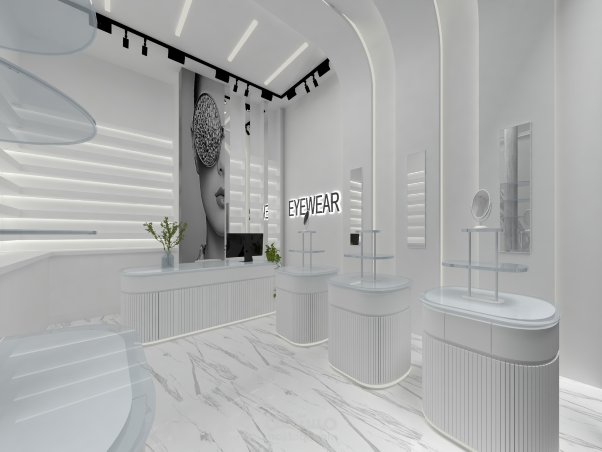 تصميم داخلي يعتمد على الأبيض كعنصر رئيسي لإبراز النظارات المعروضة، مع استخدام الرخام والإضاءة المخفية لإضفاء لمسة فاخرة. التصميم يجمع بين البساطة والهوية البصرية القوية من خلال العناصر الفنية والكاونتر المنحني والرفوف