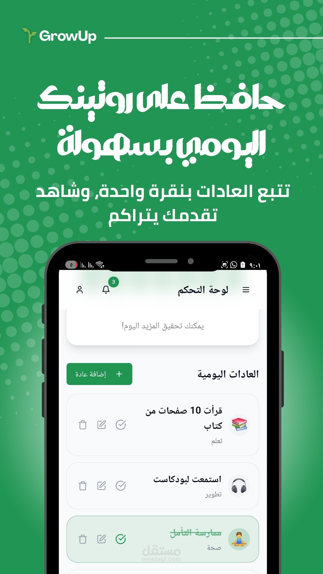 اجهزة الهاتف سواء Androind / IOS المشروع يتيح لك متابعة العادات اليومية وانشاء تذكيرات و وضع اهداف وخطط مستقبلية ومتابعتها.