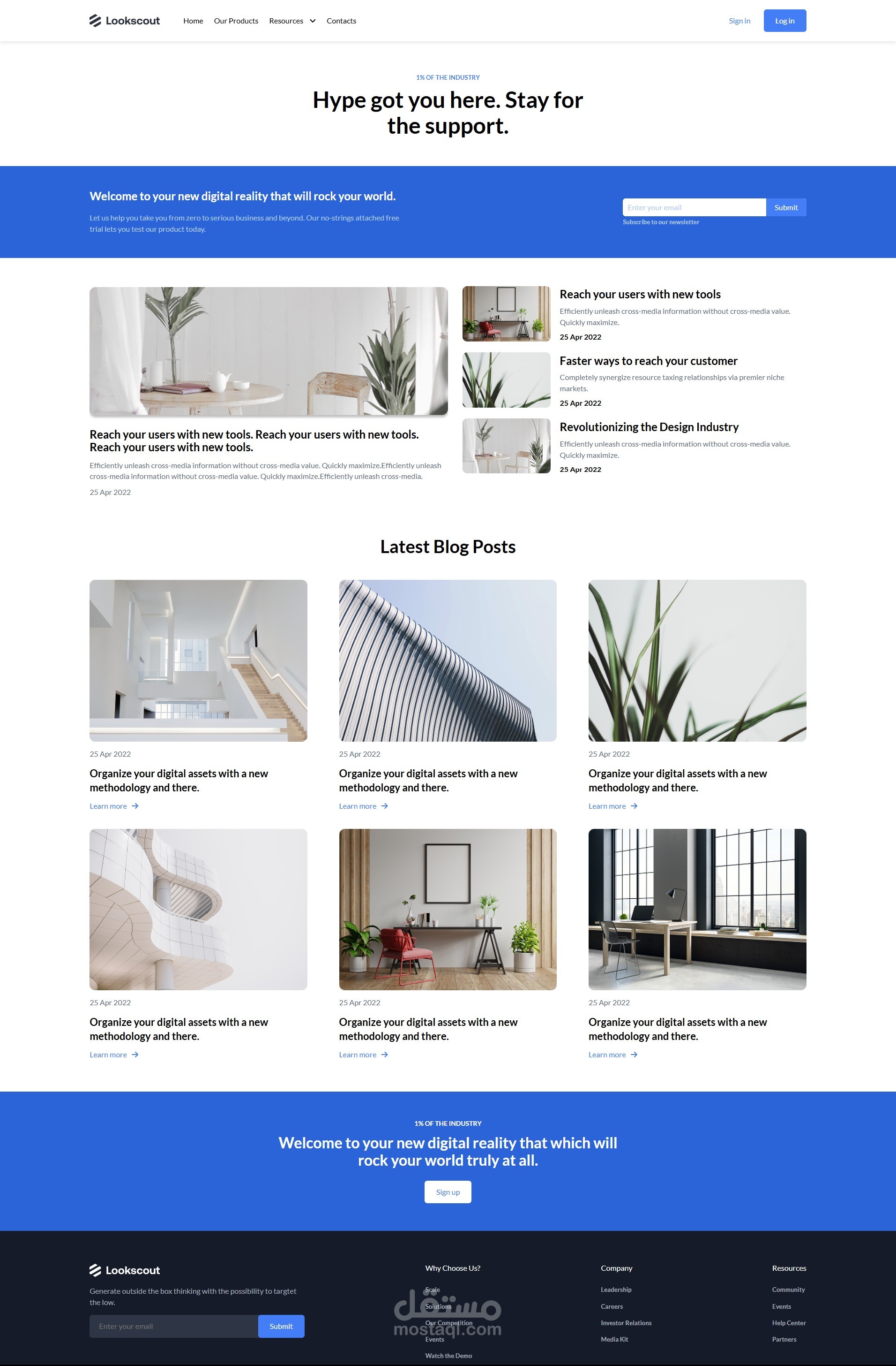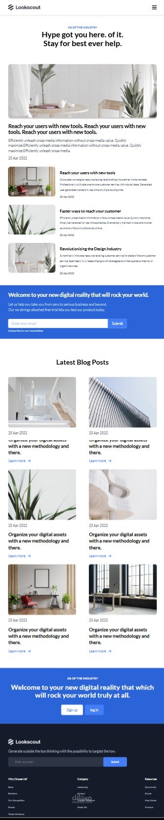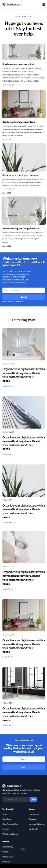 الموقع المعروض هو واجهة رئيسية لموقع إلكتروني لشركة تدعى "Lookscout"، ويتميز بتصميم حديث ونظيف يغلب عليه اللونان الأزرق والأبيض. يبدو أن الشركة تقدم حلولاً تتعلق بالواقع الرقمي، والتفاعل مع المستخدمين، وإدارة الأصول الرقمية.
