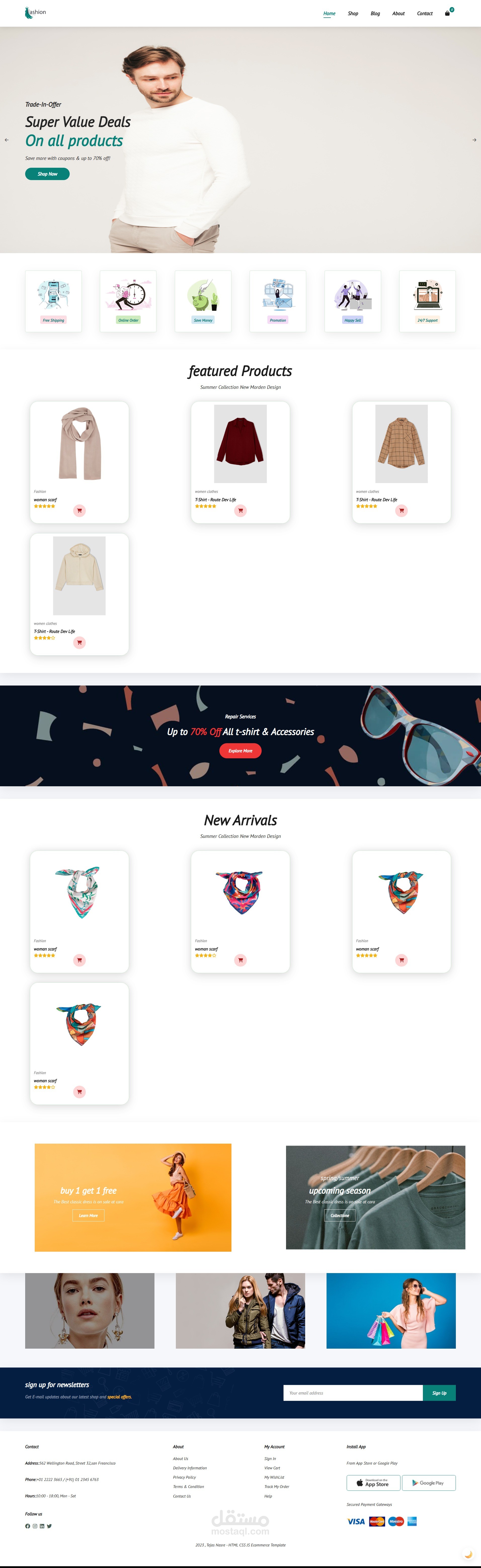 الموقع يضم أقسام متكاملة (العروض، المنتجات المميزة، المنتجات الجديدة، بانرات إعلانية، اشتراك النشرات البريدية، والفوتر).