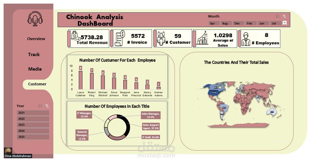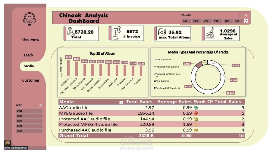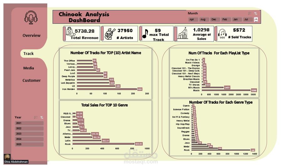 interactive Chinook Analysis DashBoard designed in Excel and using Power Query to write SQL queries ,Chinook data from 2021 and 2025. The dashboard provides insights itracks , customer , cemployee , media types and invoiceline,they help to take decisions.