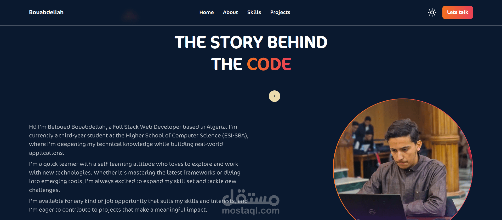 تم تطوير هذا الموقع الشخصي (Portfolio) ليكون أفضل تمثيل لصاحبه وشخصيته المهنية، حيث يقدّم لمحة شاملة عن مهاراته التقنية وأحدث المشاريع التي عمل عليها، من خلال تصميم نظيف، متجاوب مع جميع الأجهزة، ومحسّن بشكل ممتاز لمحركات البحث (SEO).