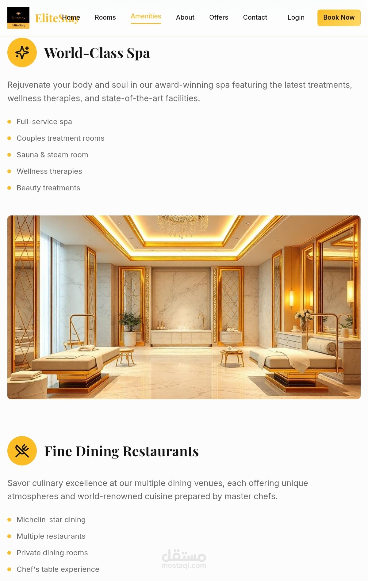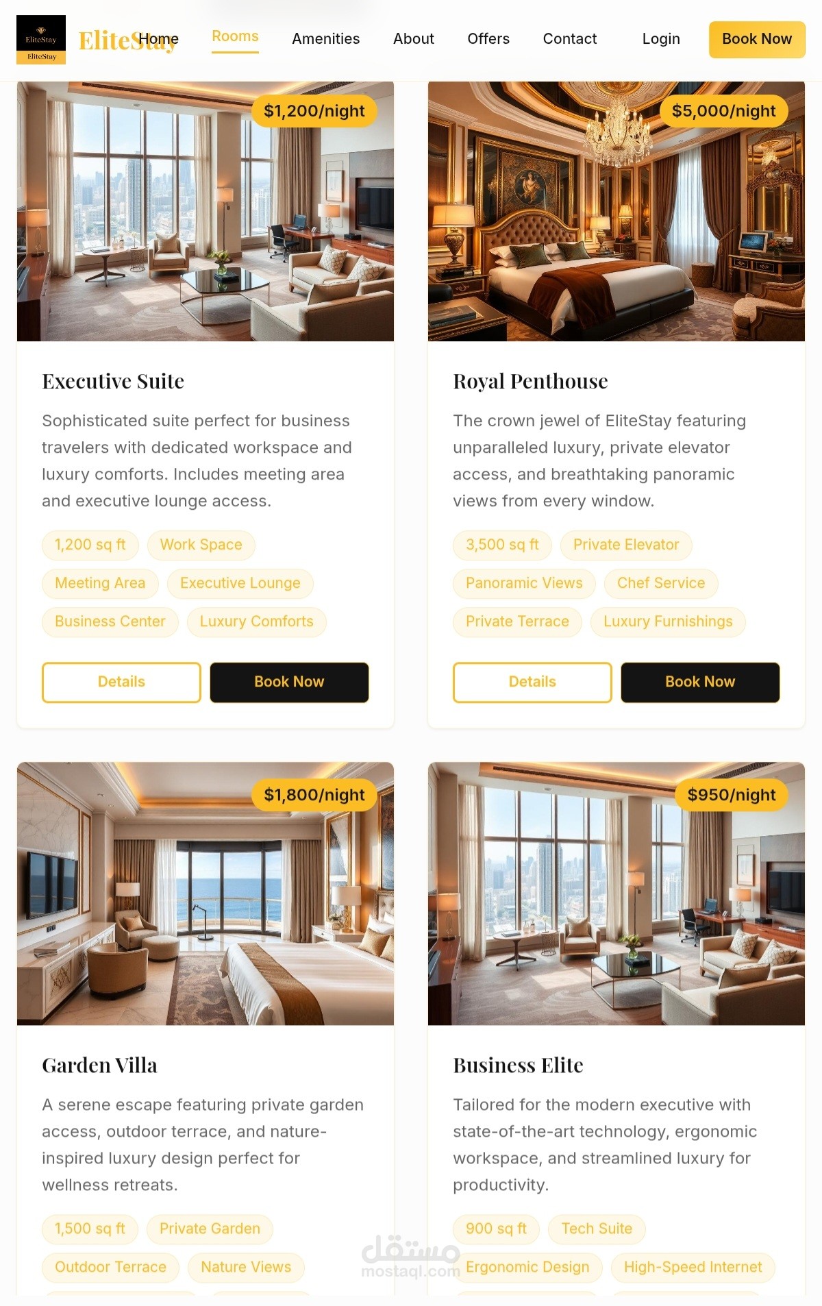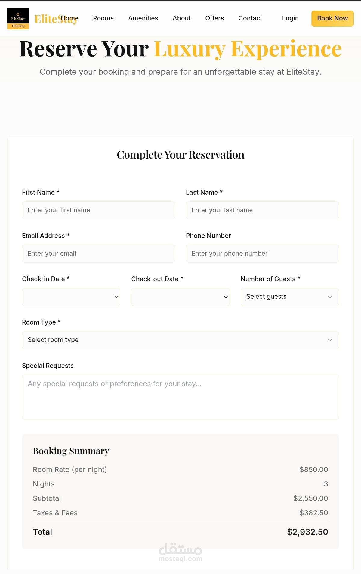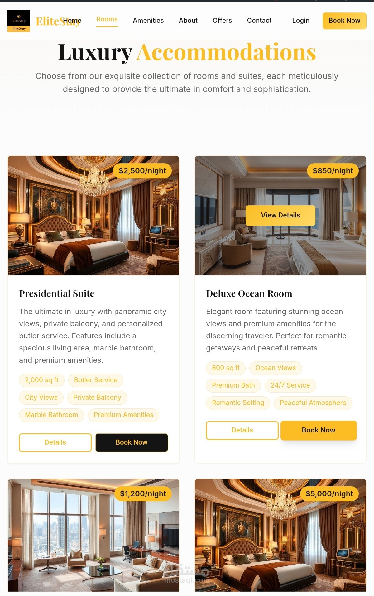 Elite Stay هو موقع حجز فنادق أنيق وعصري، مصمم لتسهيل عملية التخطيط للسفر بكل سلاسة. يتميز بواجهة سهلة الاستخدام، وتصميم متجاوب، وتجربة حجز سلسة، تتيح للمستخدمين استكشاف الغرف الفاخرة، ومشاهدة العروض الحصرية، وحجز إقامتهم بثقة. مثالي لعرض منصة فندقية احترافية وعالية الجودة.