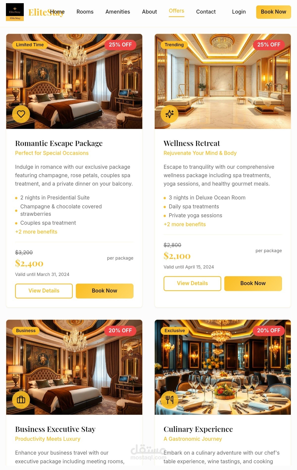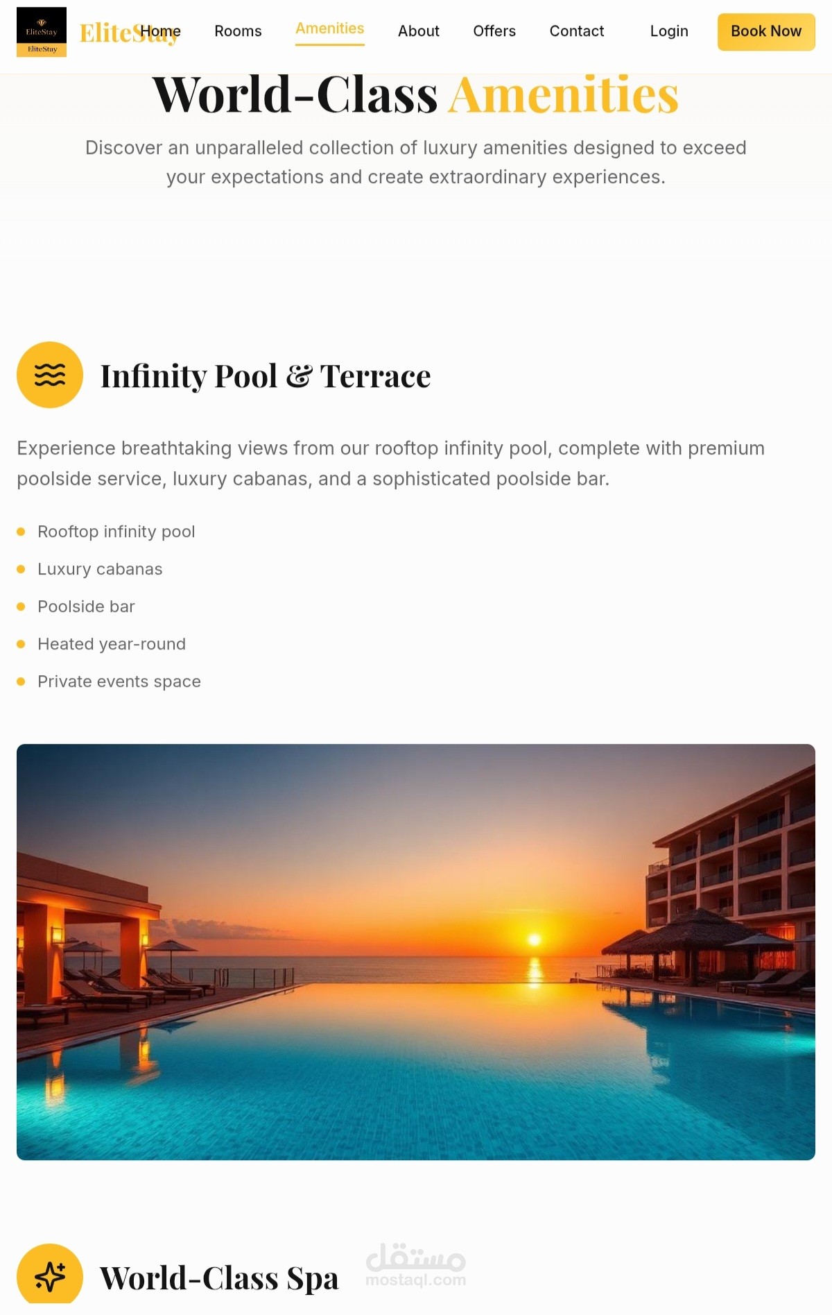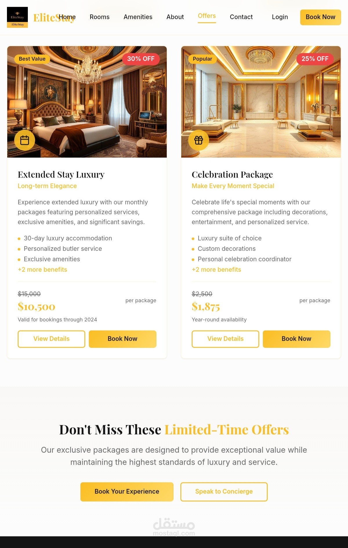 Elite Stay هو موقع حجز فنادق أنيق وعصري، مصمم لتسهيل عملية التخطيط للسفر بكل سلاسة. يتميز بواجهة سهلة الاستخدام، وتصميم متجاوب، وتجربة حجز سلسة، تتيح للمستخدمين استكشاف الغرف الفاخرة، ومشاهدة العروض الحصرية، وحجز إقامتهم بثقة. مثالي لعرض منصة فندقية احترافية وعالية الجودة.