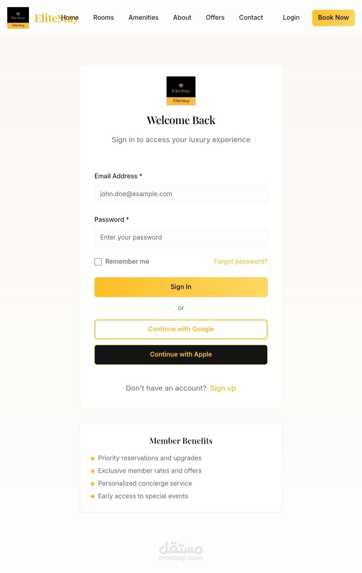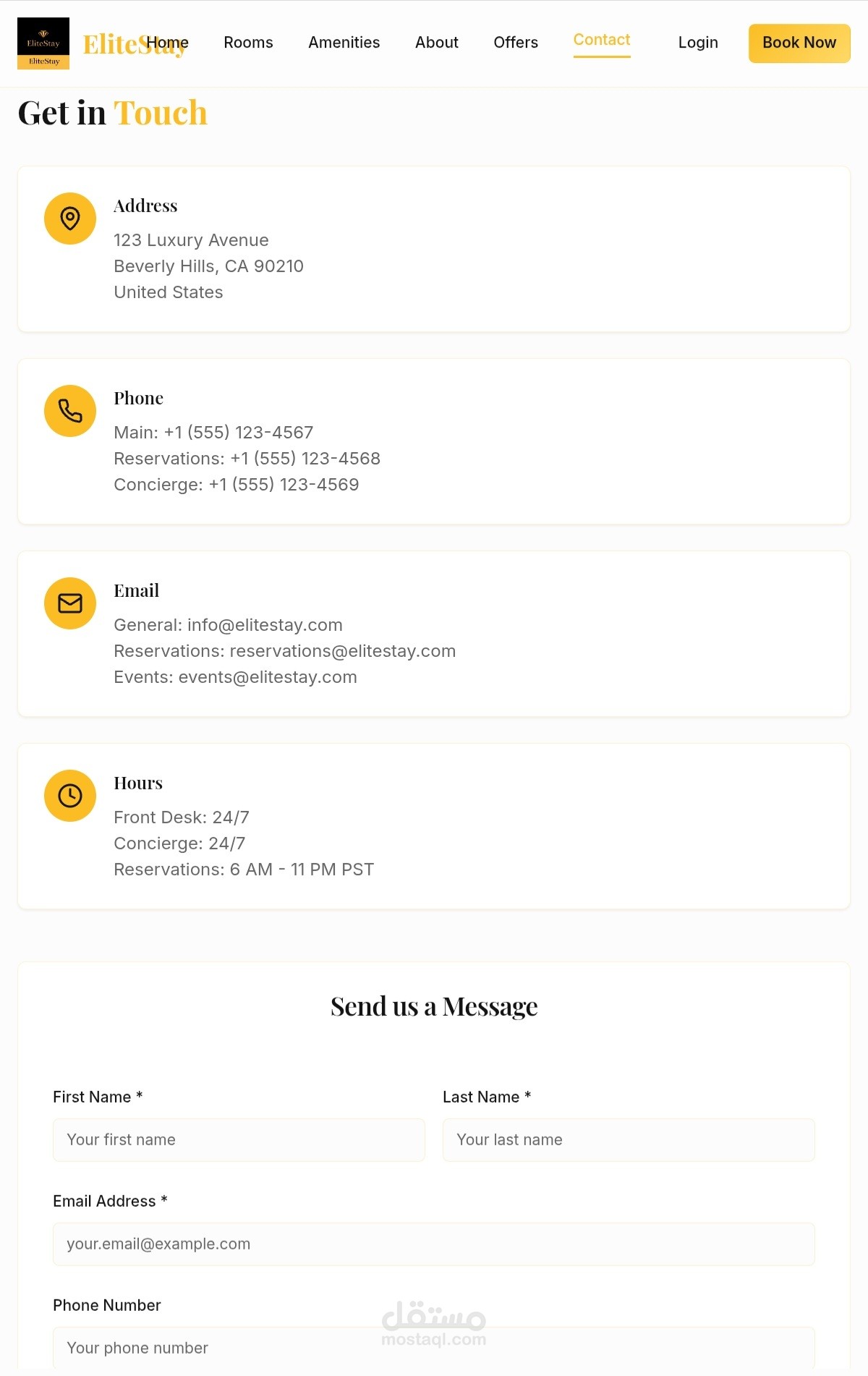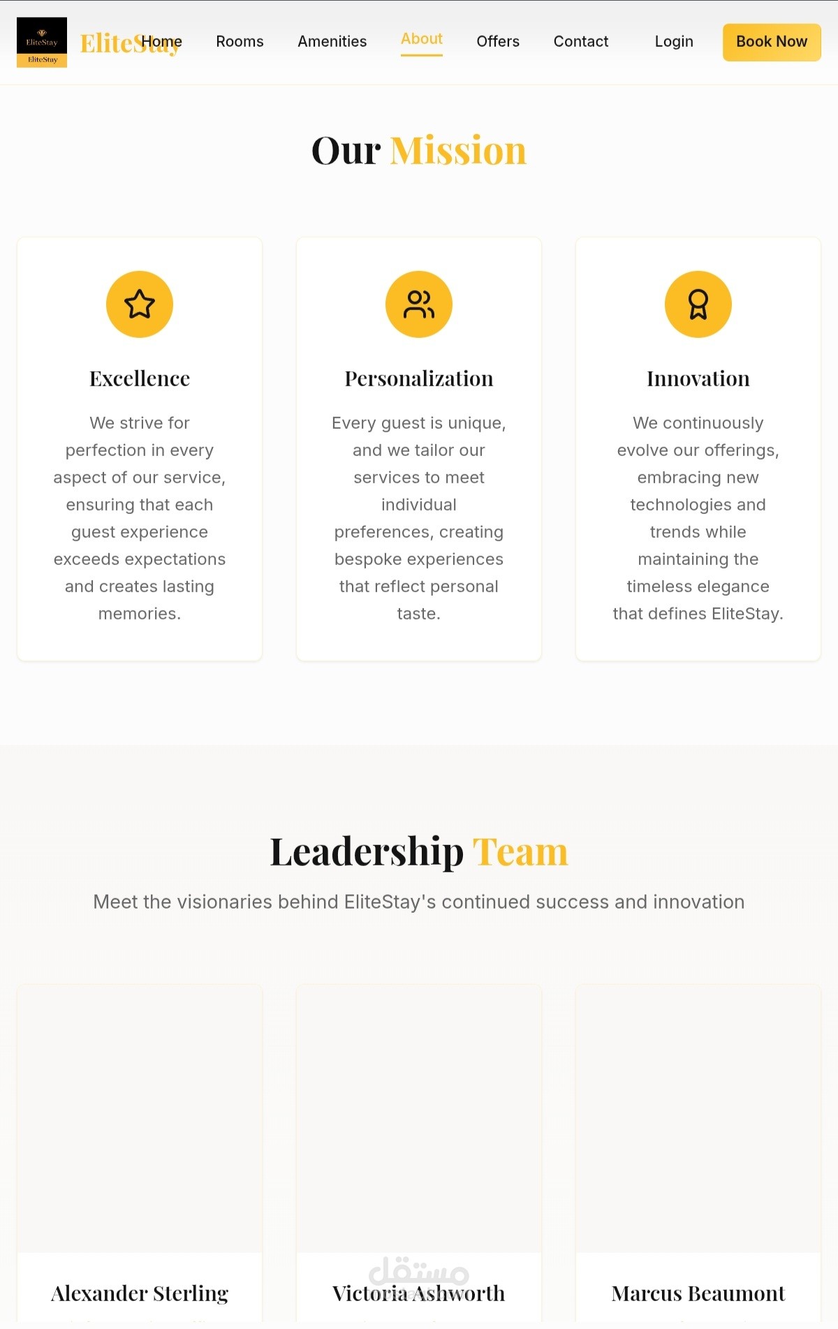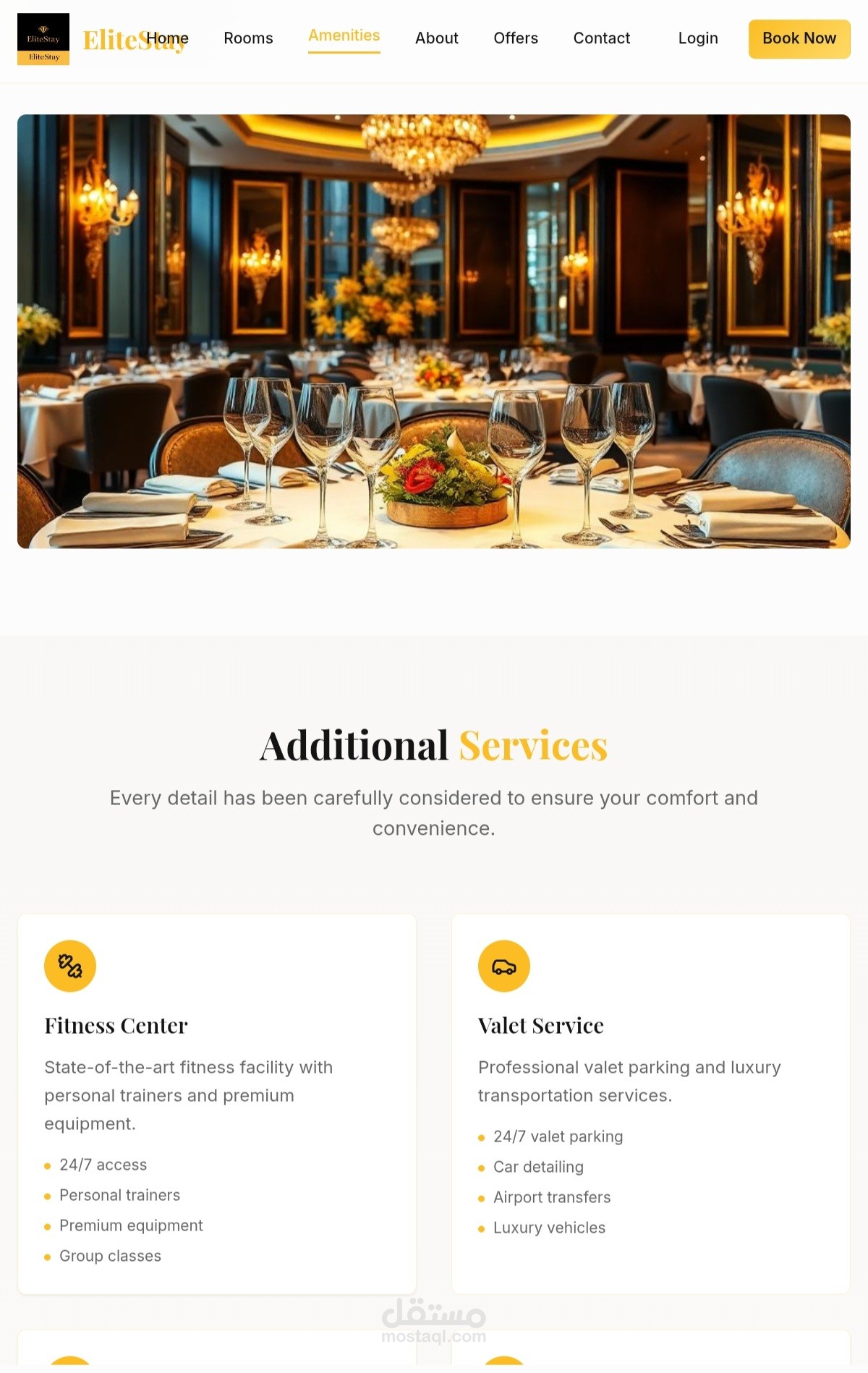 Elite Stay هو موقع حجز فنادق أنيق وعصري، مصمم لتسهيل عملية التخطيط للسفر بكل سلاسة. يتميز بواجهة سهلة الاستخدام، وتصميم متجاوب، وتجربة حجز سلسة، تتيح للمستخدمين استكشاف الغرف الفاخرة، ومشاهدة العروض الحصرية، وحجز إقامتهم بثقة. مثالي لعرض منصة فندقية احترافية وعالية الجودة.