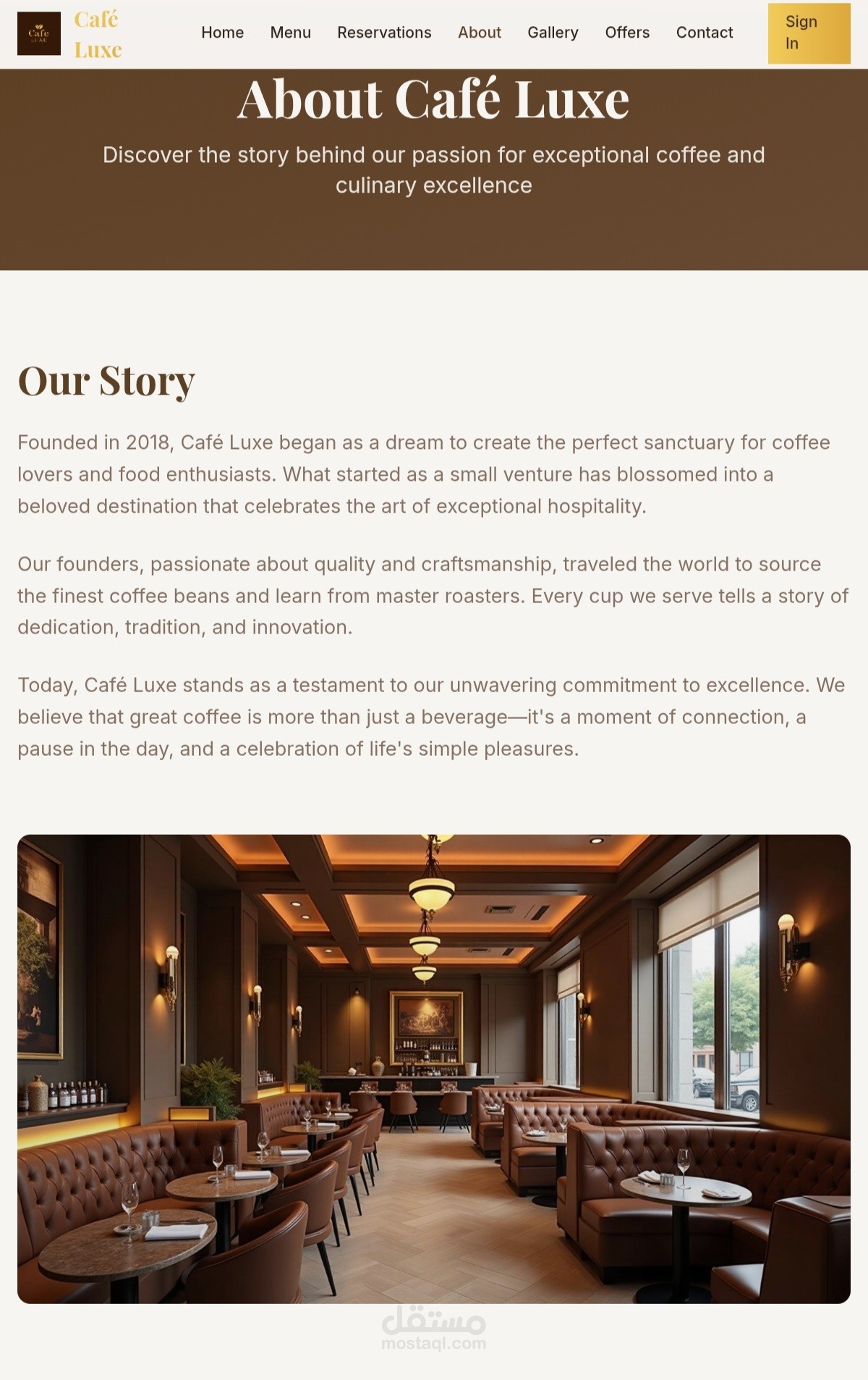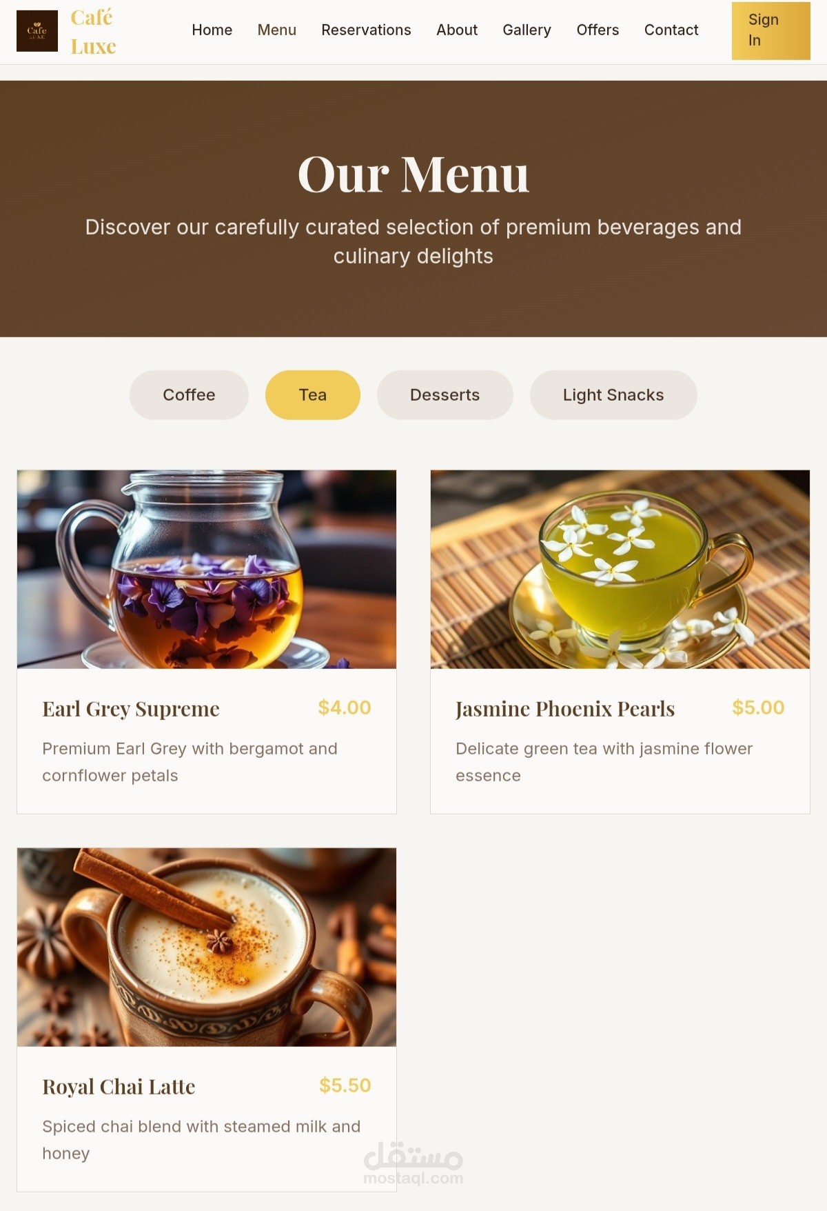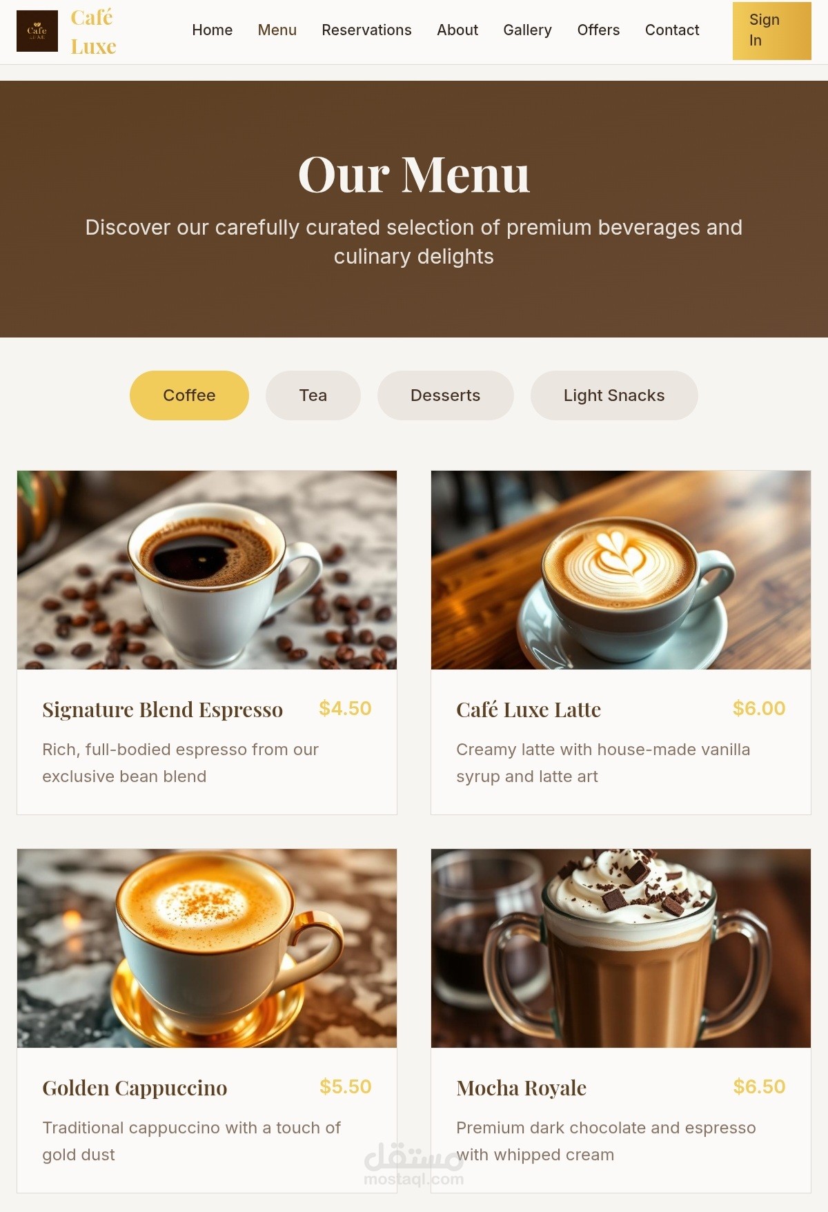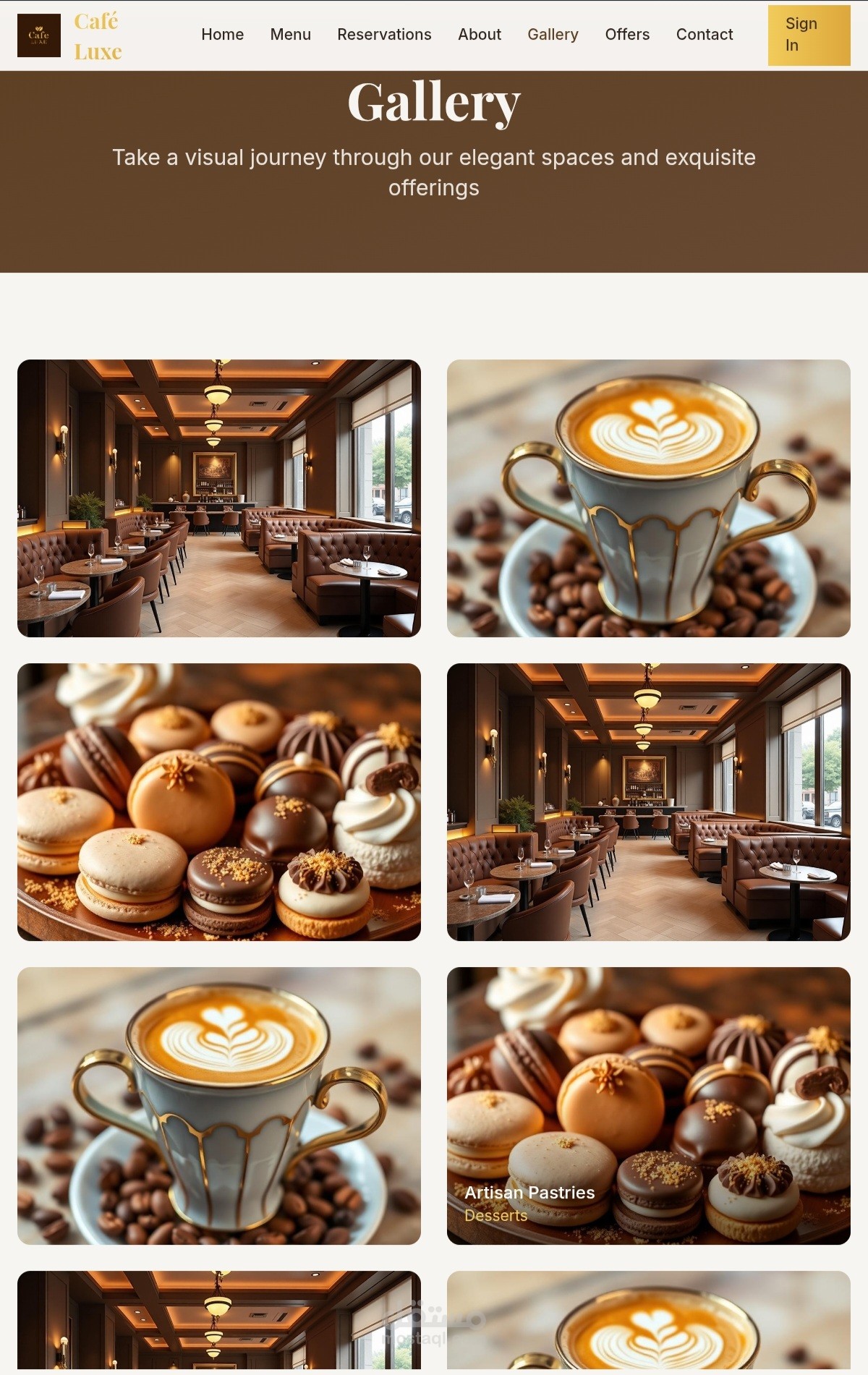 Designed to offer a smooth browsing experience, the website blends simplicity with luxury, making it ideal for high-end café branding.