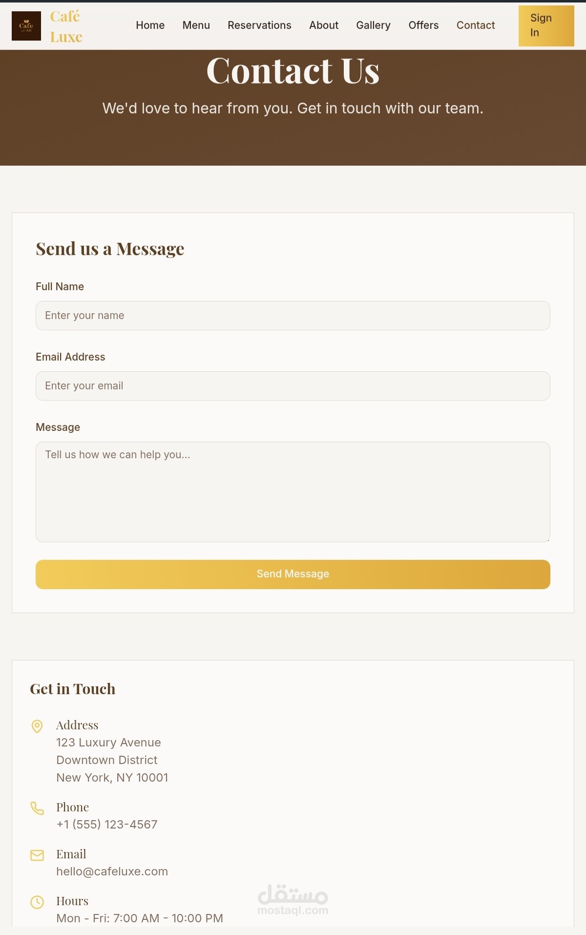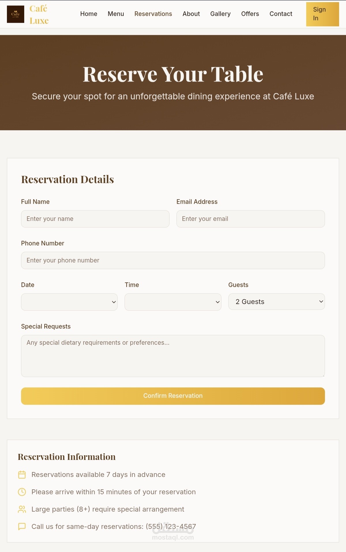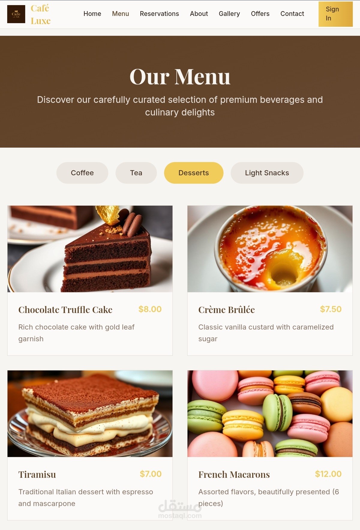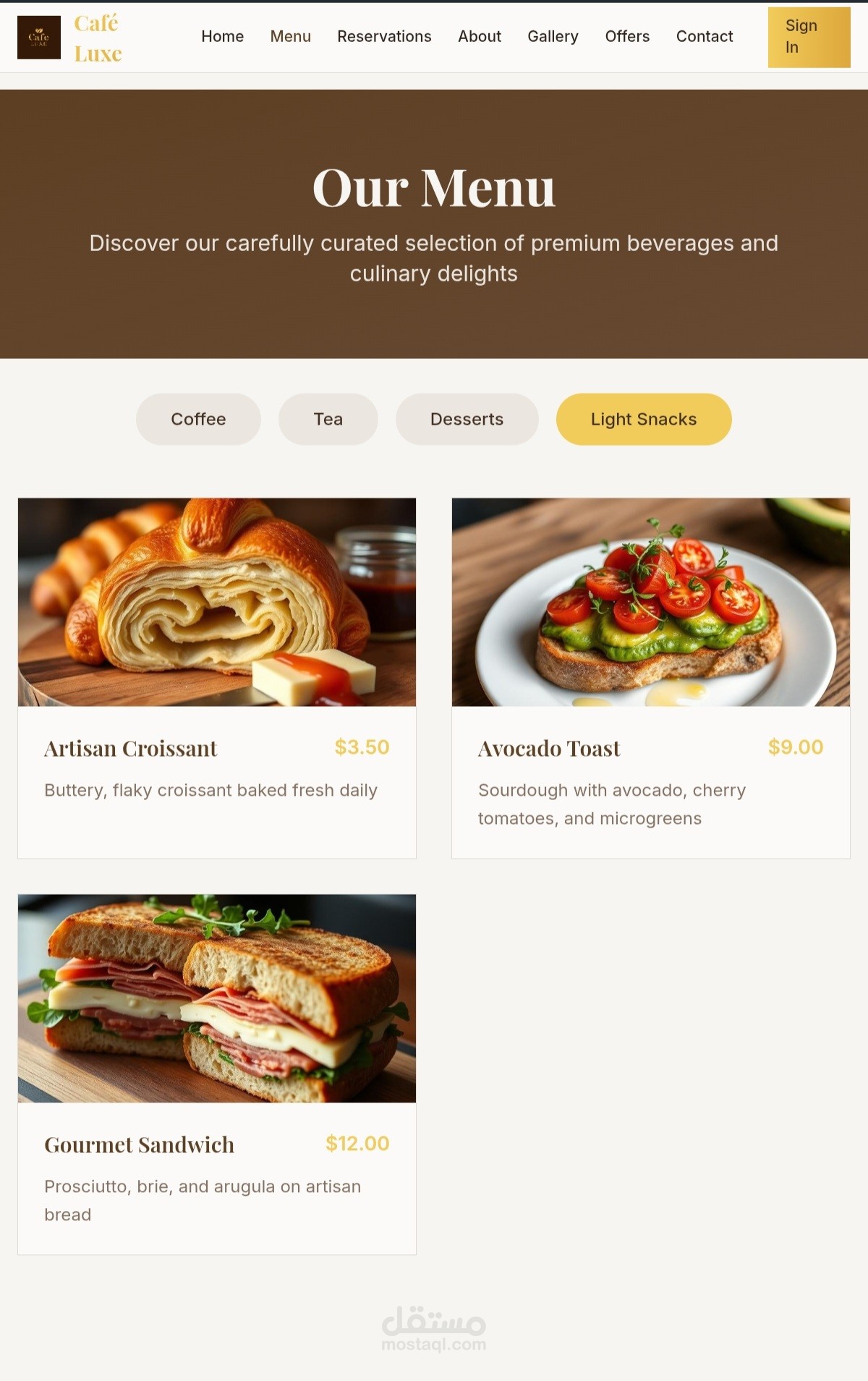 Designed to offer a smooth browsing experience, the website blends simplicity with luxury, making it ideal for high-end café branding.