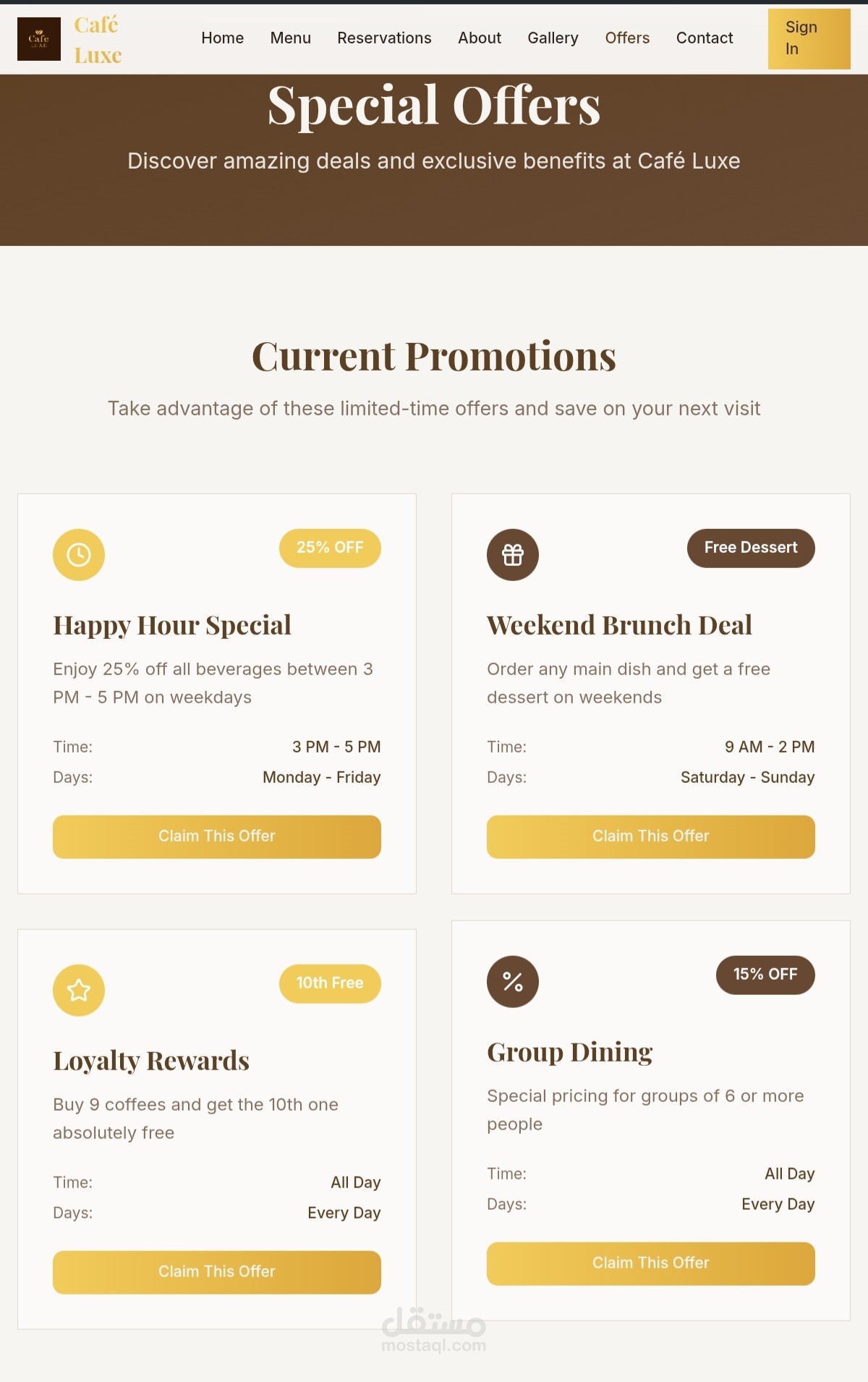 صُمم الموقع ليقدم تجربة تصفح سلسة تجمع بين البساطة والفخامة، مما يجعله مناسبًا لهوية العلامة التجارية لمقهى راقٍ.