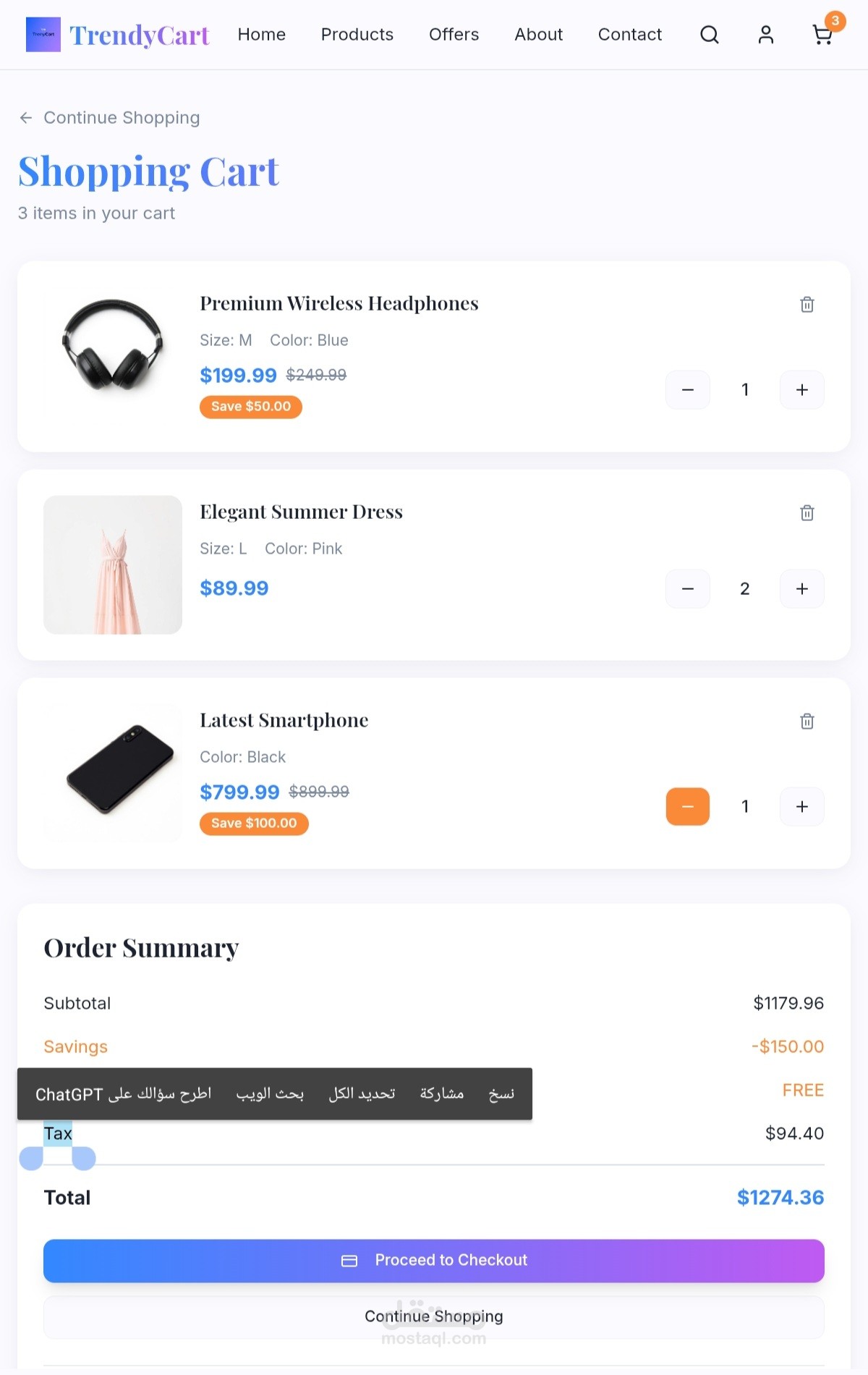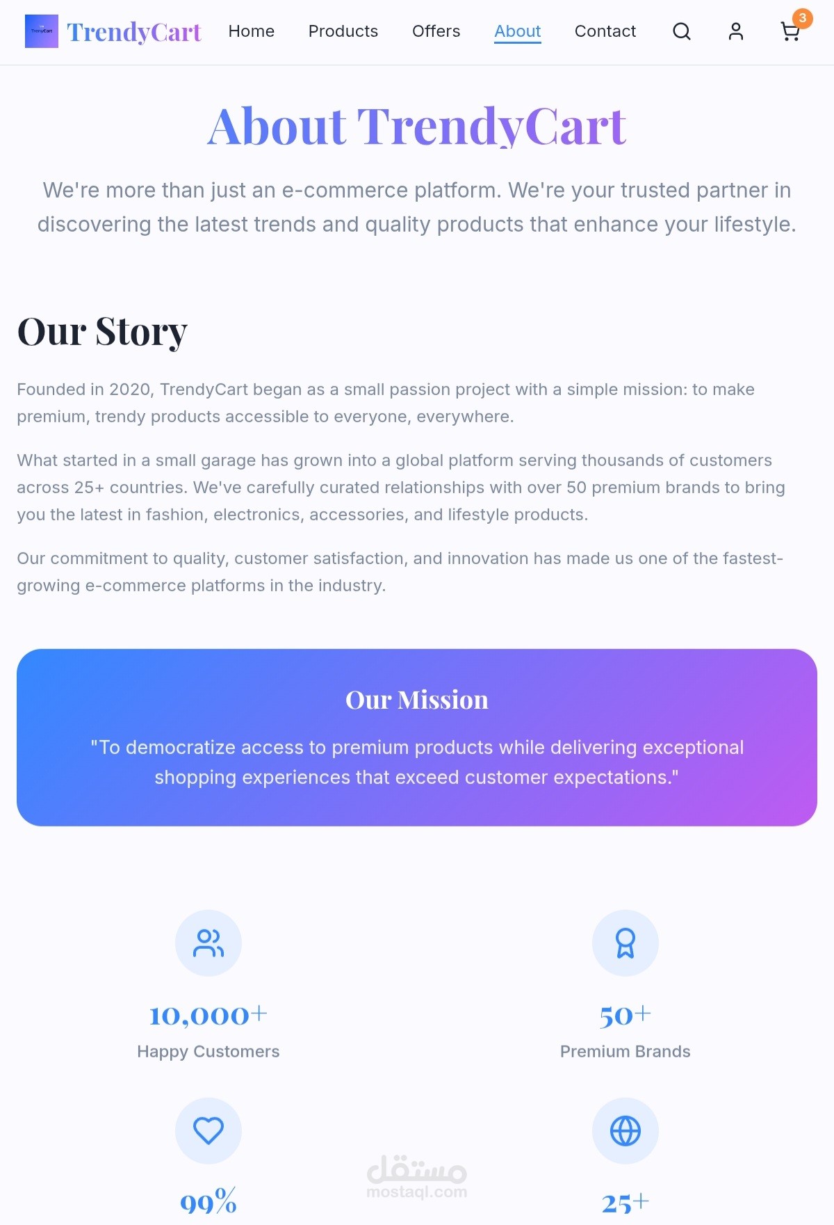 Trendy Cart هو متجر إلكتروني عصري وسهل الاستخدام، مصمم لتوفير تجربة تسوق سلسة وممتعة. يتميز بواجهة أنيقة، وتصفح سلس، وطرق دفع آمنة، مع مجموعة واسعة من المنتجات وصور جذابة ووصف دقيق لكل منتج لتجعل التسوق عبر الإنترنت ممتعًا وسهلًا.