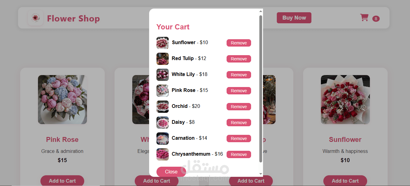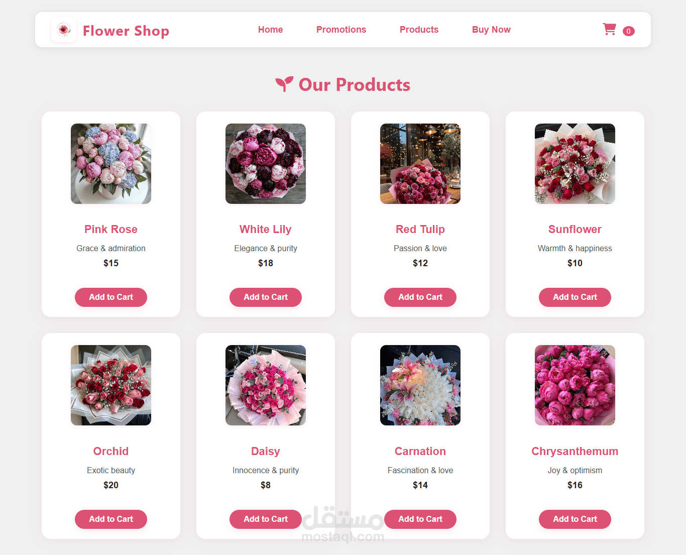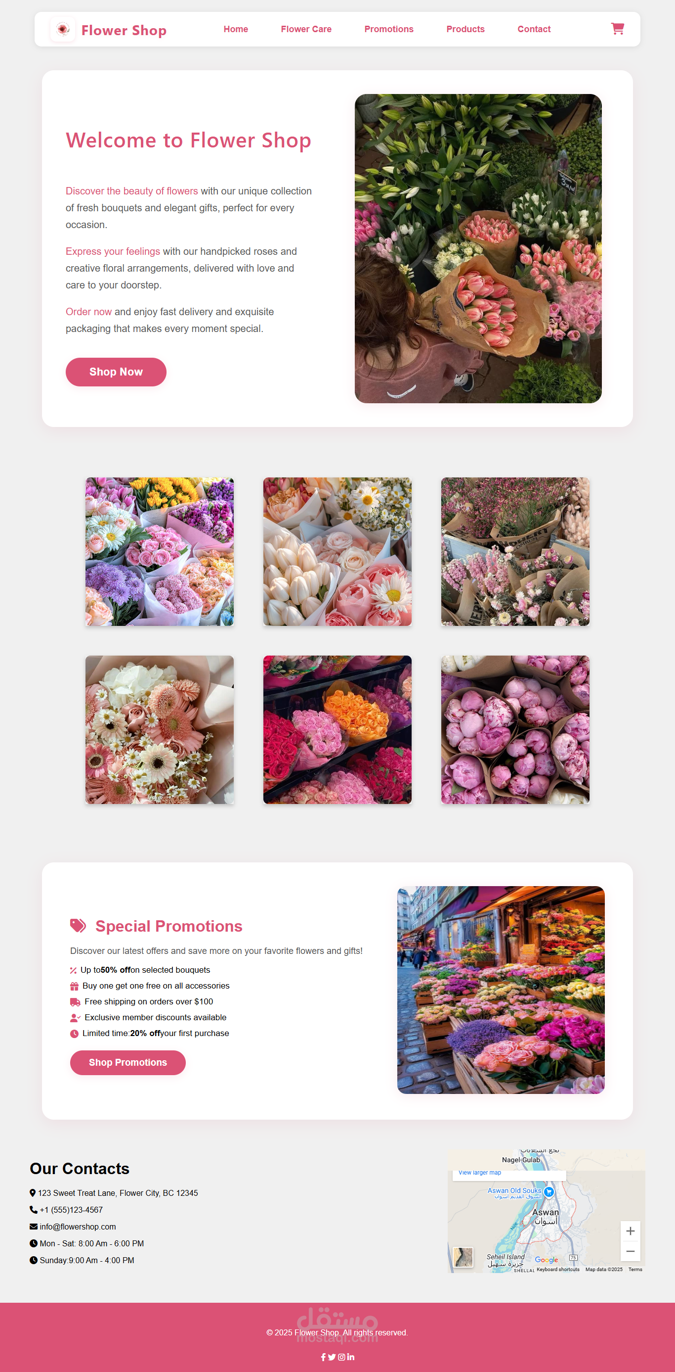 تم تصميم وتطوير واجهة متجر زهور إلكتروني بتقنيات HTML5 وCSS3 وJavaScript، بواجهة عصرية ومتجاوبة تعكس جمال المنتجات وتوفر تجربة تصفح سلسة على مختلف الأجهزة.
