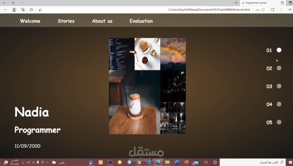صفحة ويب تفاعلية صممت باستخدام HTML وCSS، تعرض ملف شخصي بأسلوب الشرائح (stories)، تشمل معلومات مثل الاسم، الوظيفة، تاريخ الميلاد، وصور تعكس الاهتمامات أو نمط الحياة، مع شريط جانبي للتنقل بين قصص مبرمجين آخرين.