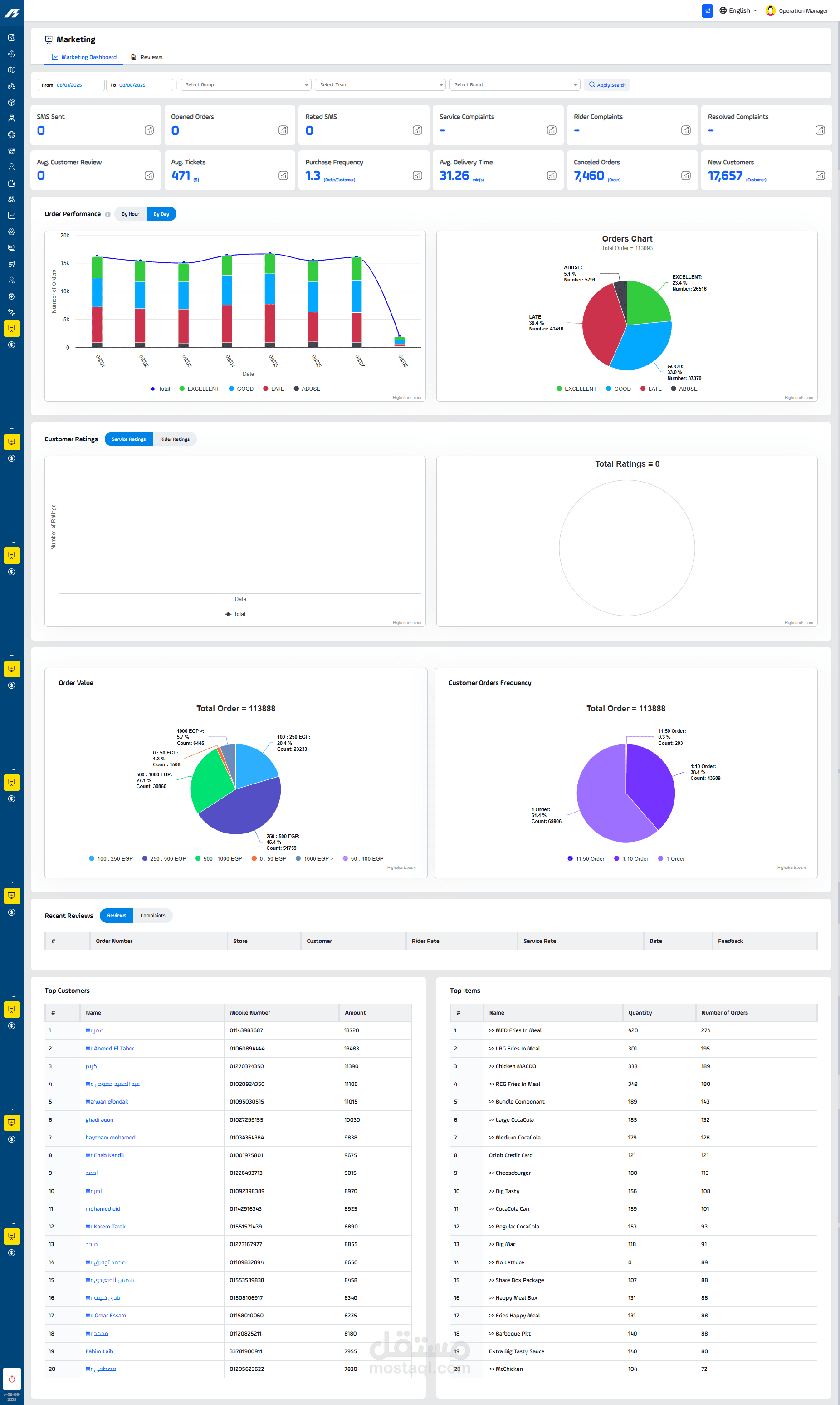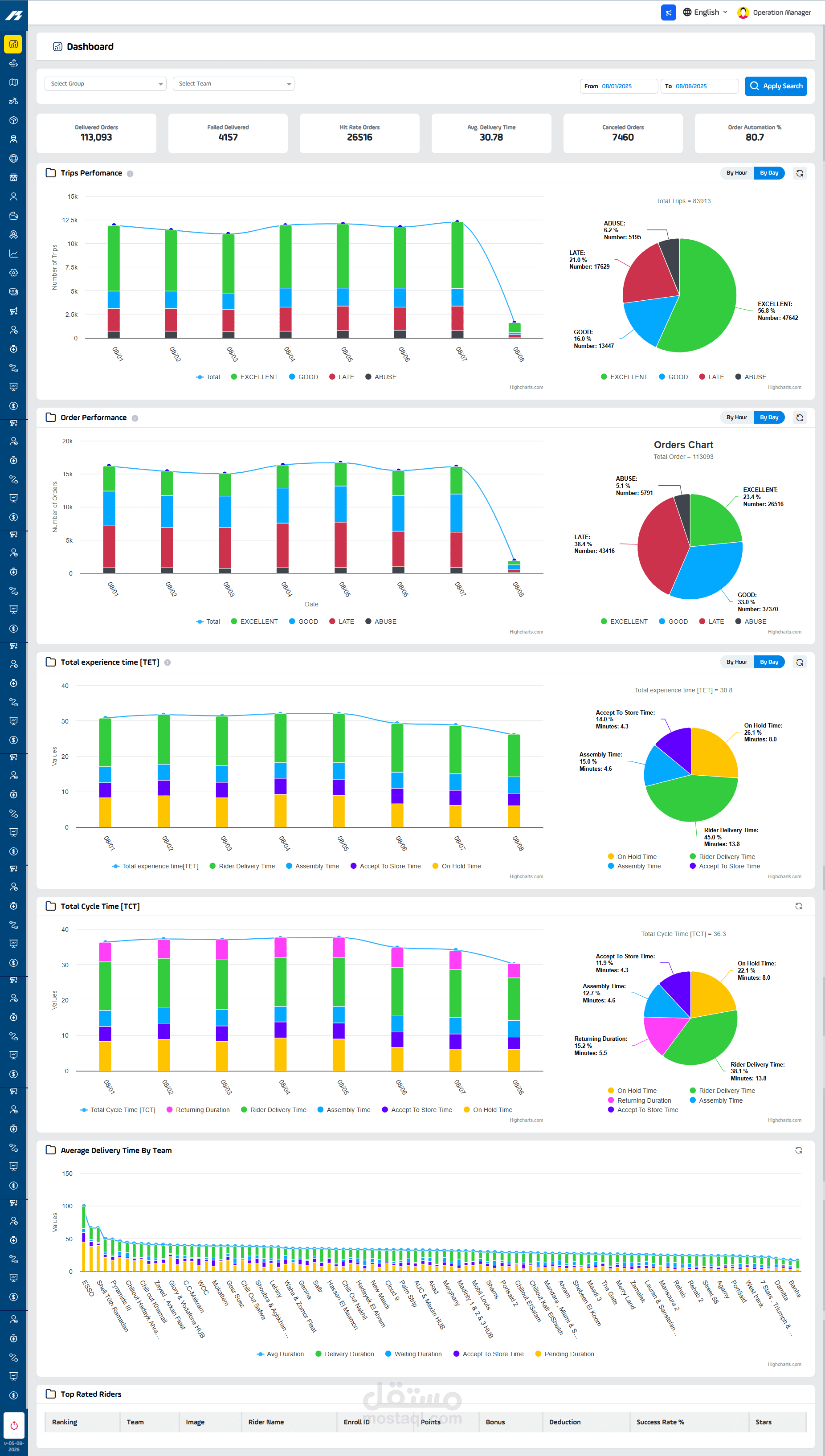 - لوحات تحكم متقدمة لمتابعة مؤشرات الأداء الرئيسية مثل أداء الطلبات، تقييمات العملاء، زمن التوصيل، وكفاءة السائقين