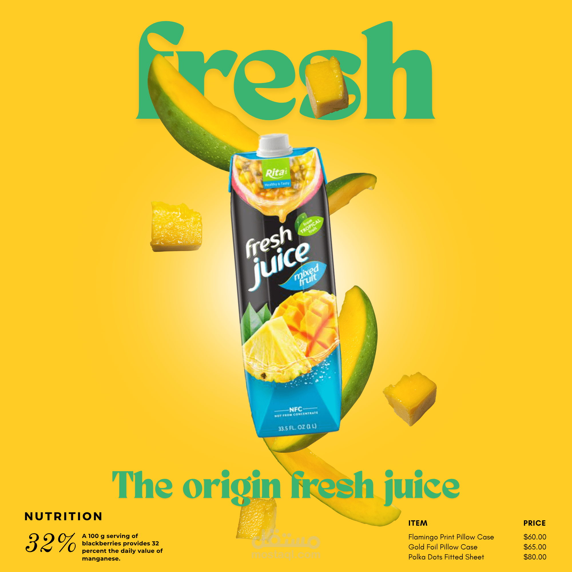 تصميم إعلاني عصري لعصير فواكه مشكل، يعتمد على ألوان مبهجة وخلفية لافتة، مع إبراز المنتج بشكل احترافي ودمج عناصر الفاكهة لزيادة الإحساس بالانتعاش والطبيعة. التصميم مناسب للإعلانات الرقمية ومنصات التواصل الاجتماعي.