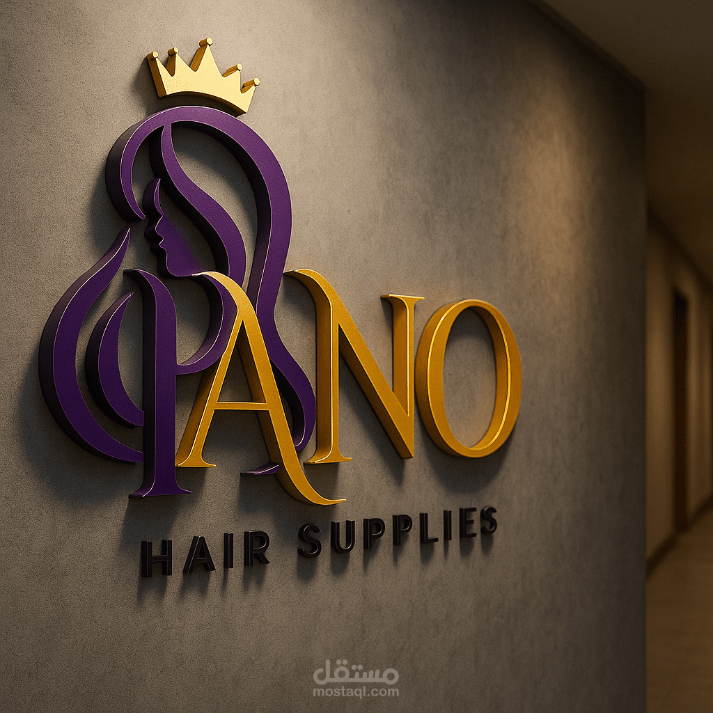 الشعار يجسد صورة جانبية أنيقة لامرأة ذات شعر طويل متموج باللون البنفسجي الداكن مع تاج ذهبي يرمز للفخامة والرفاهية.