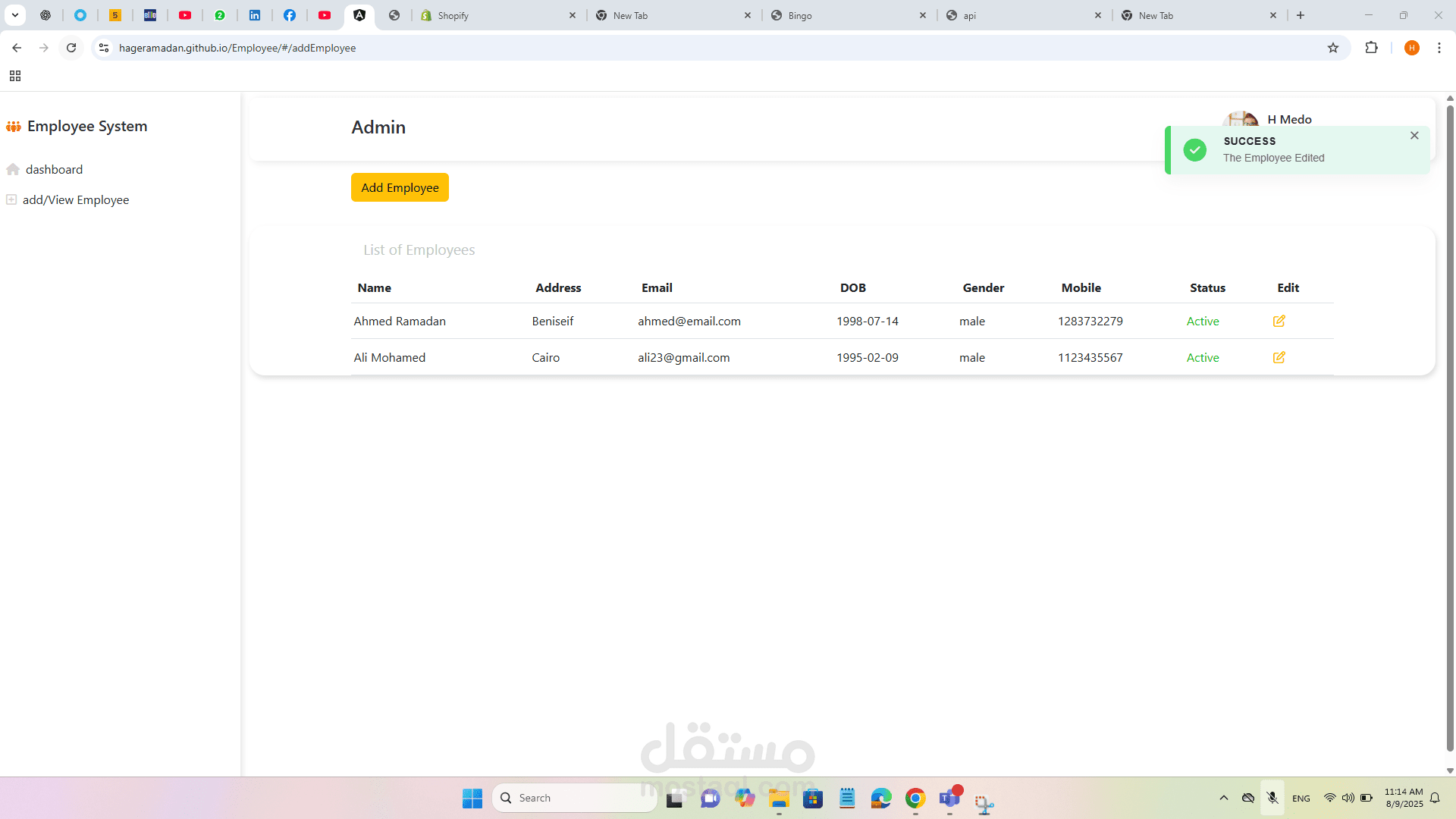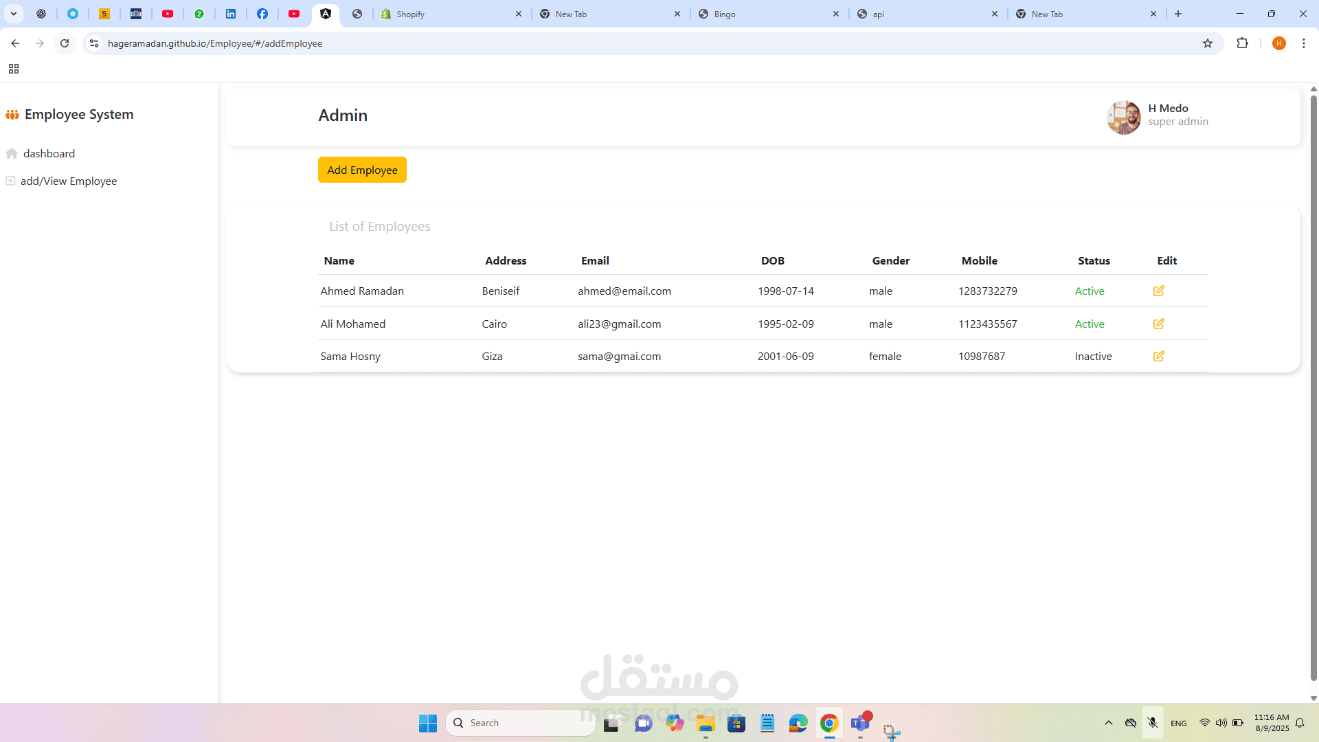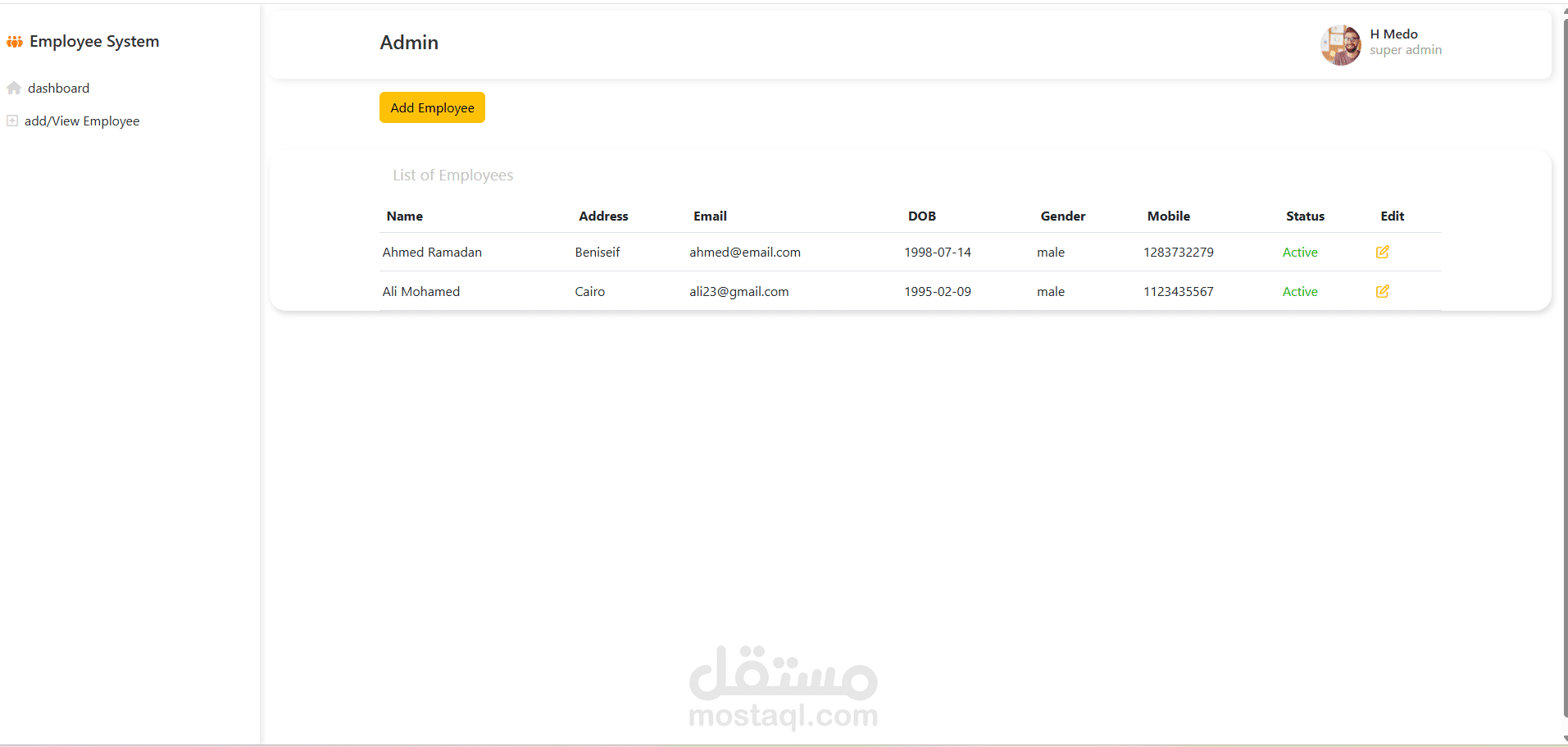 نظام اضافه الموظفين و التعديل عليهم و مناسبه لجميع الشاشات ويمكن اضافه وحذف و تعديل علي اي موظف و عرض عدد الموظفيف الرجال و النساء و النشط و الغير نشط