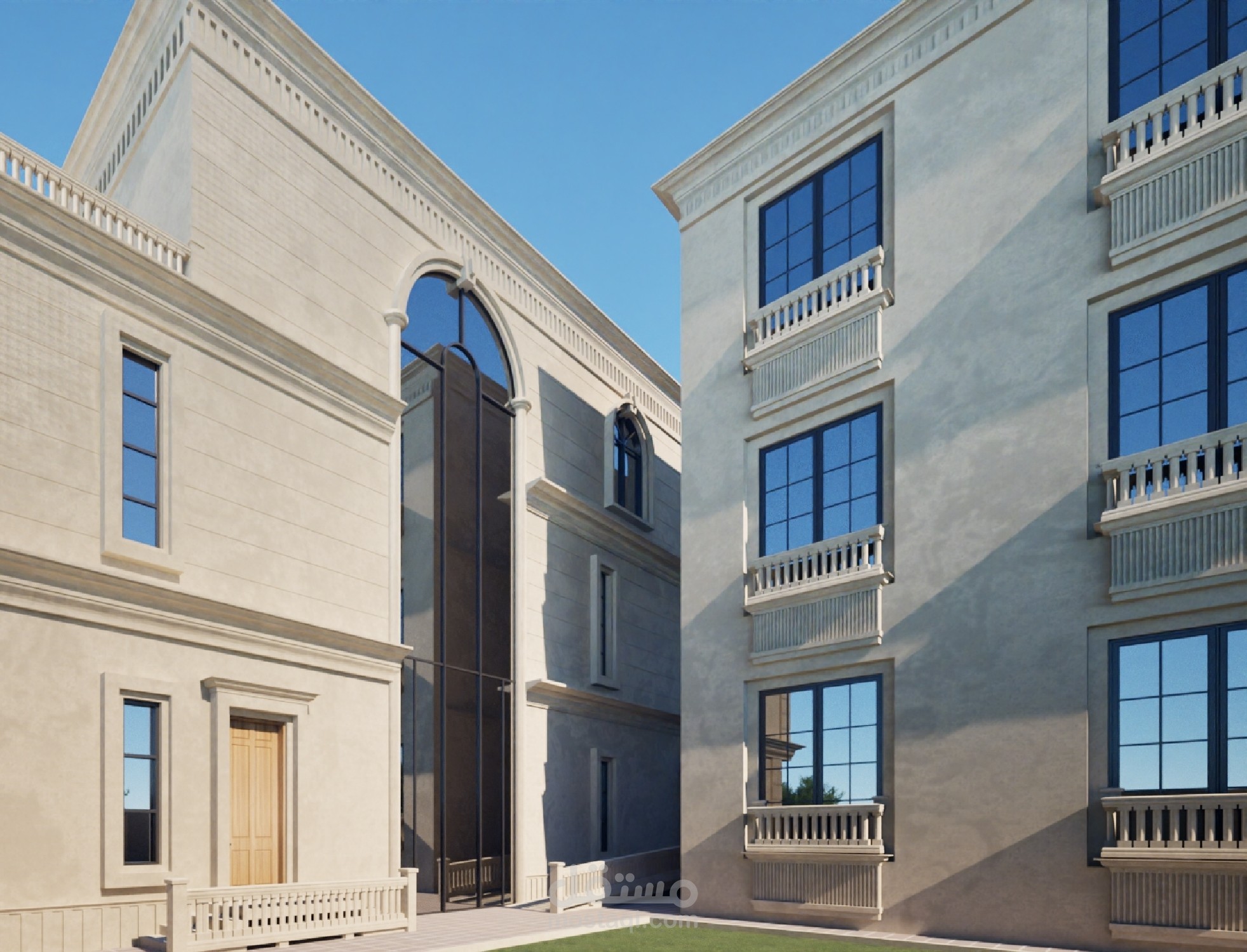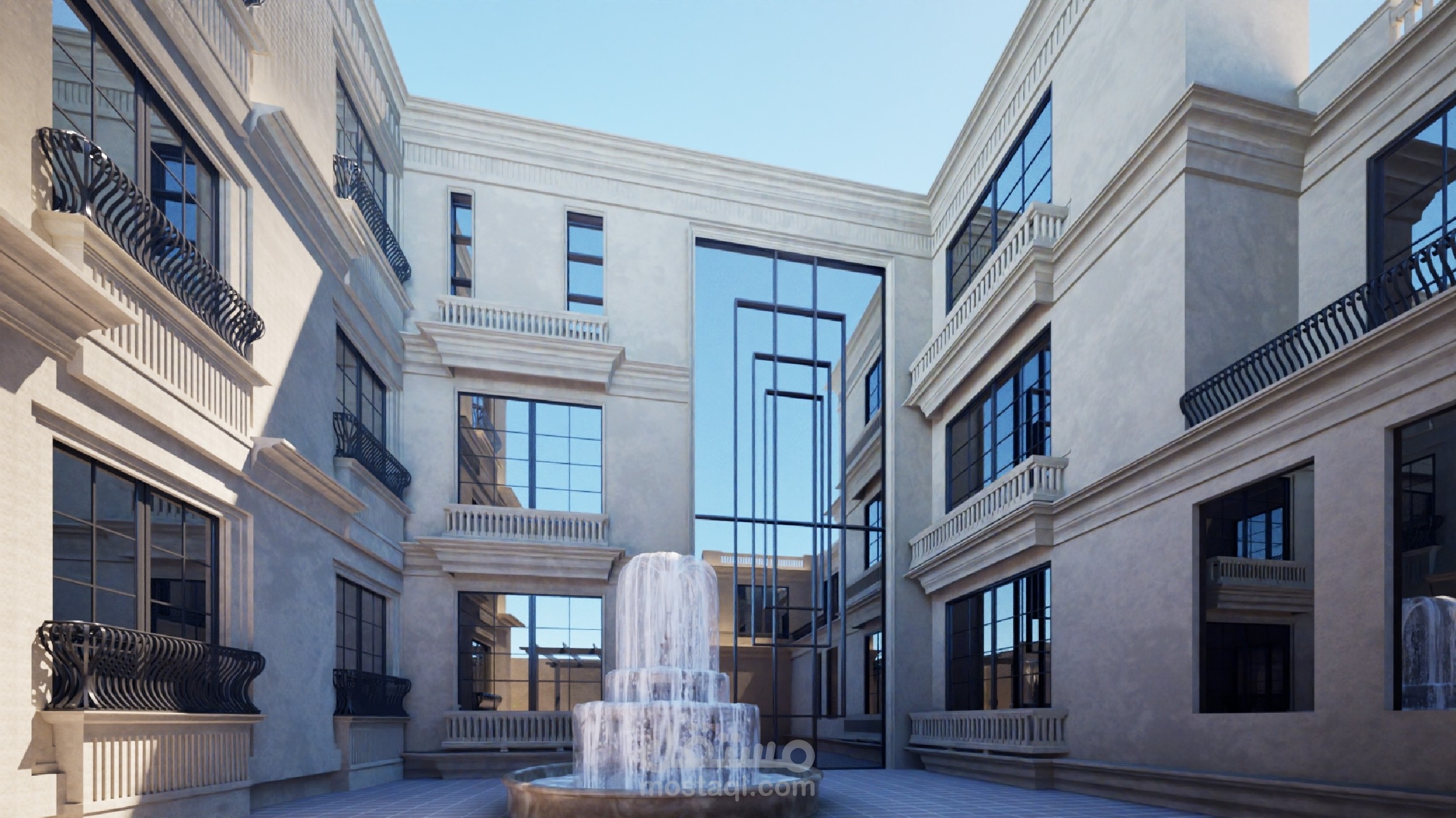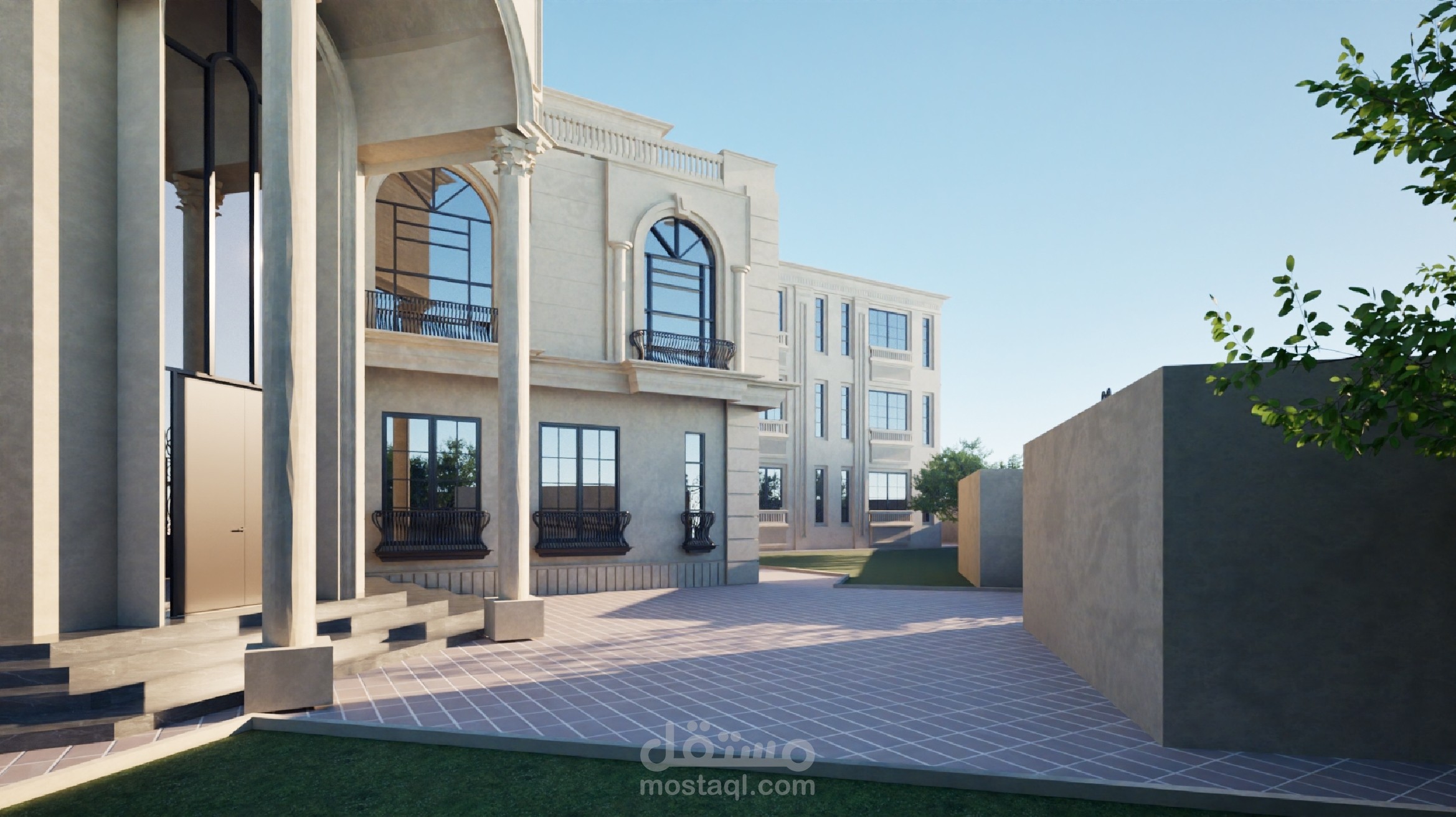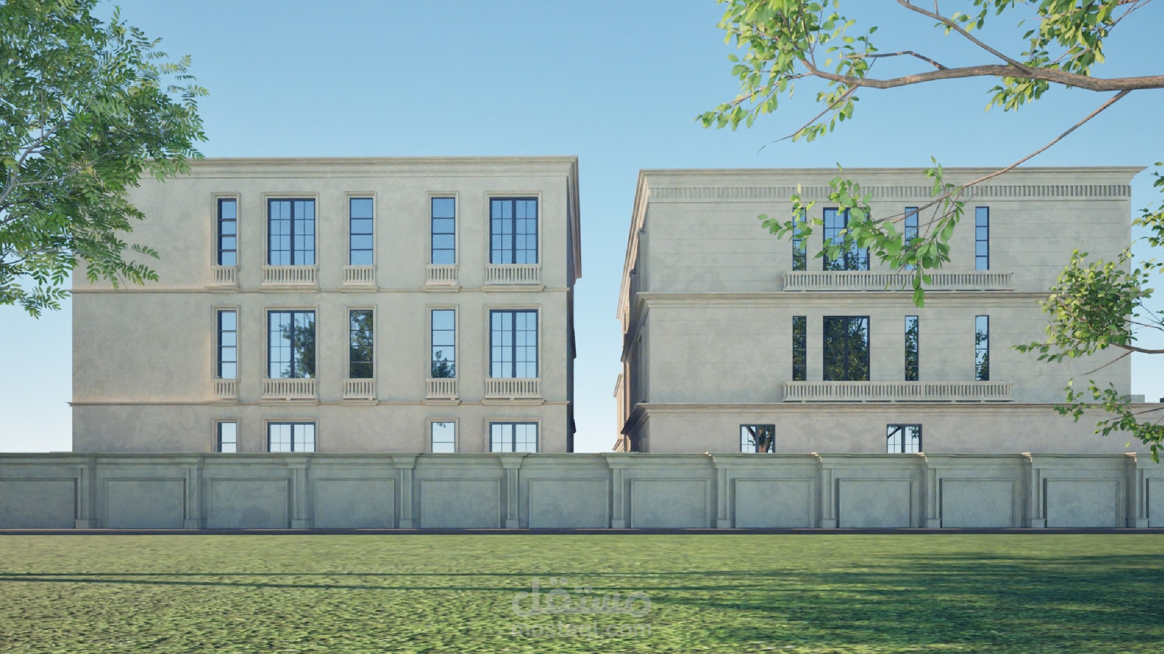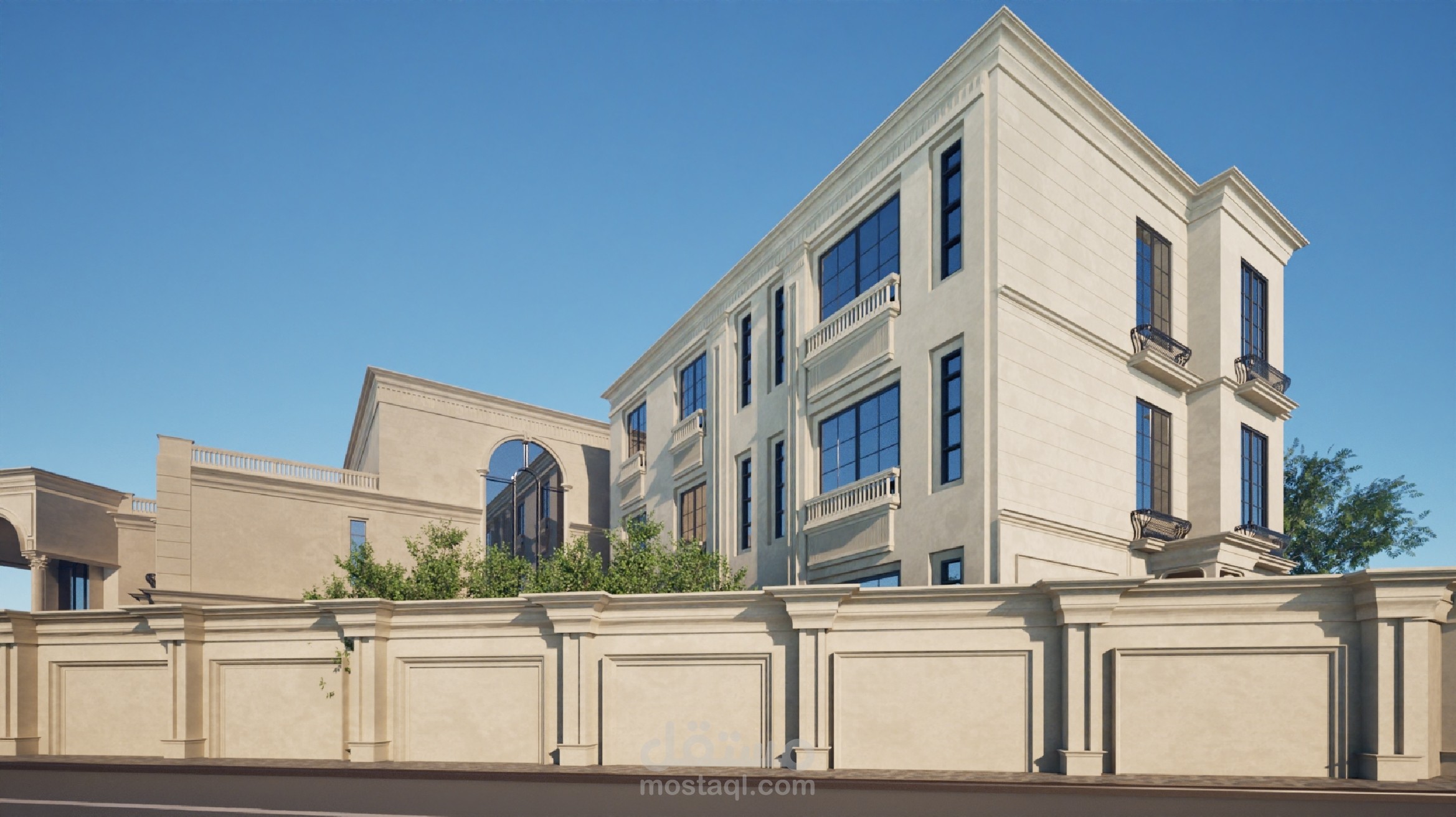 تصميم راقٍ يجمع بين الفخامة الكلاسيكية والحداثة المعمارية، يتكوّن المشروع من مبنيين متصلين بتناغم بصري ووظيفي يعكسان روح النمط النيو كلاسيك. تم التركيز على التناسب بين الكتل والفراغات مع واجهات أنيقة تعتمد على الأعمدة والزخارف الكلاسيكية المبسطة، مع توزيع إنارة يبرز التفاصيل المعمارية والملمس الحجري. التصميم الداخلي يجمع بين الهدوء والفخامة بخطوط ناعمة وألوان متوازنة، ليمنح إحساسًا بالفخامة العصرية والراحة السكنية في آنٍ واحد.