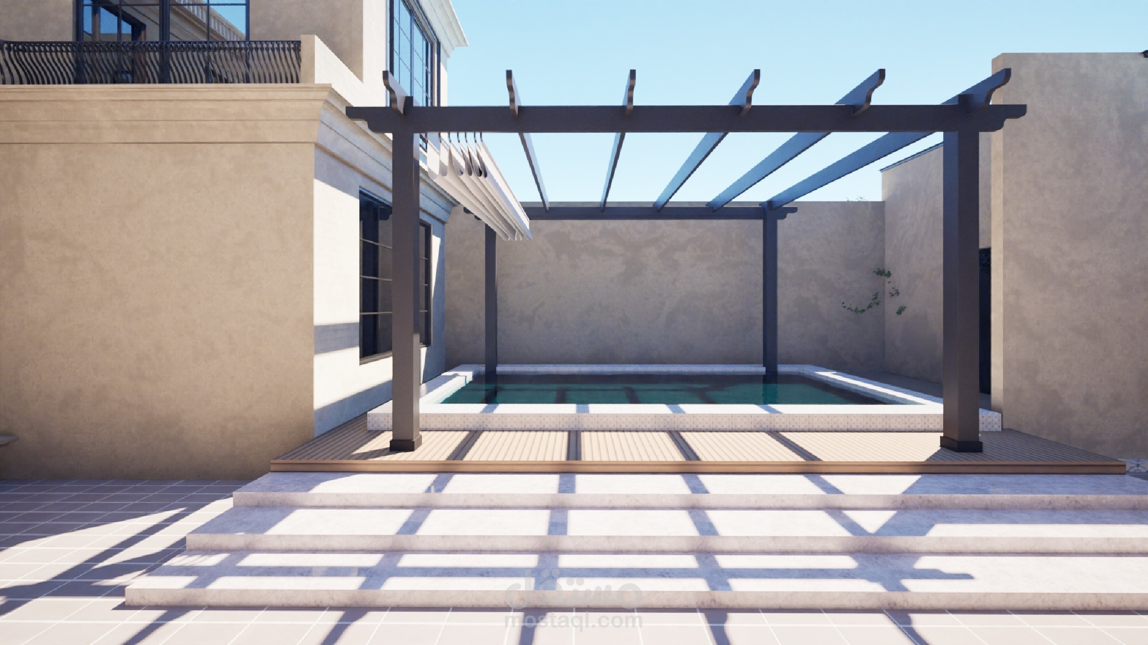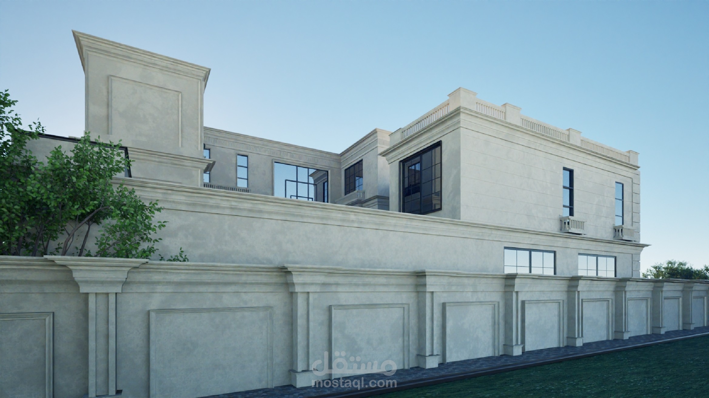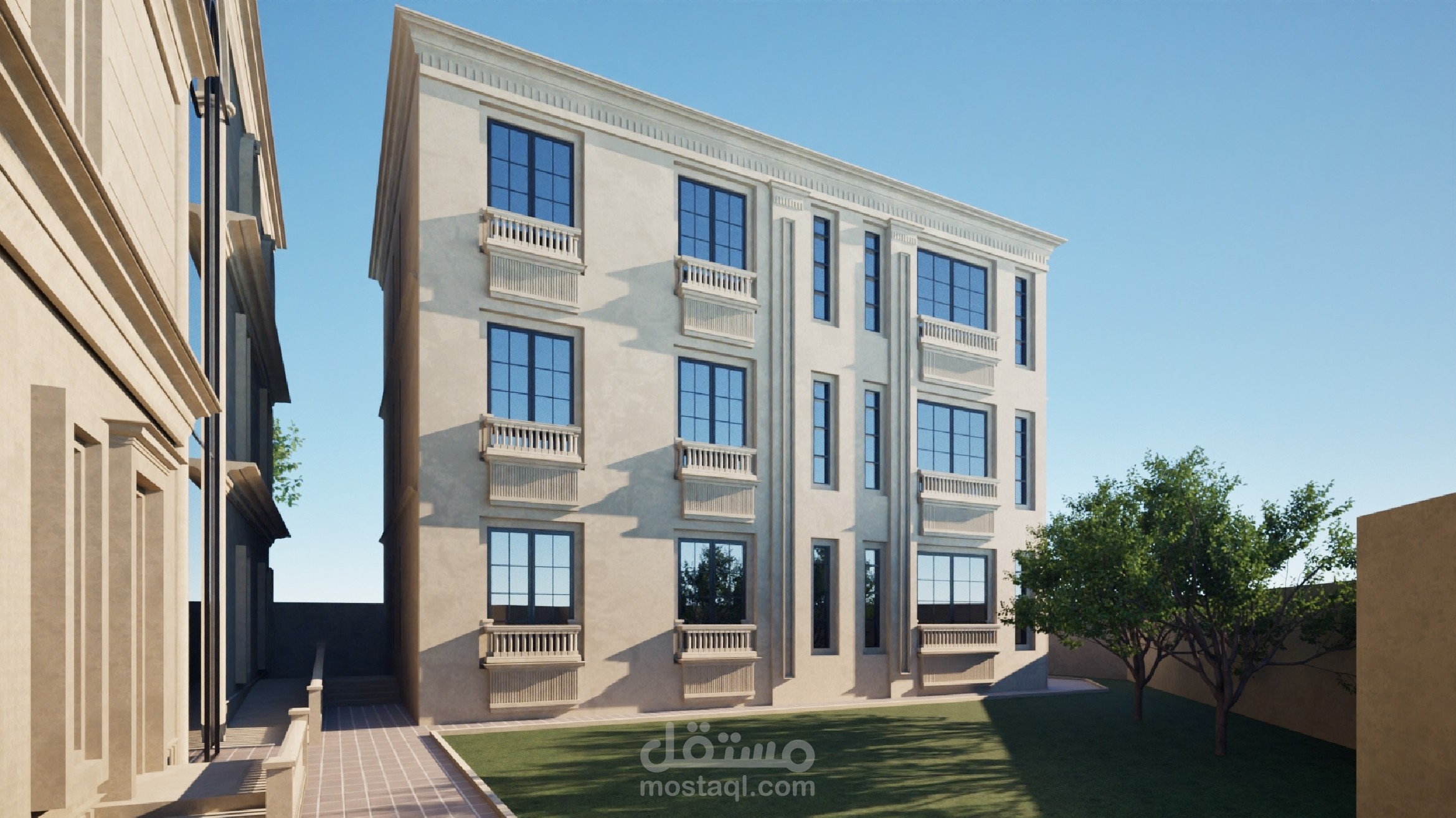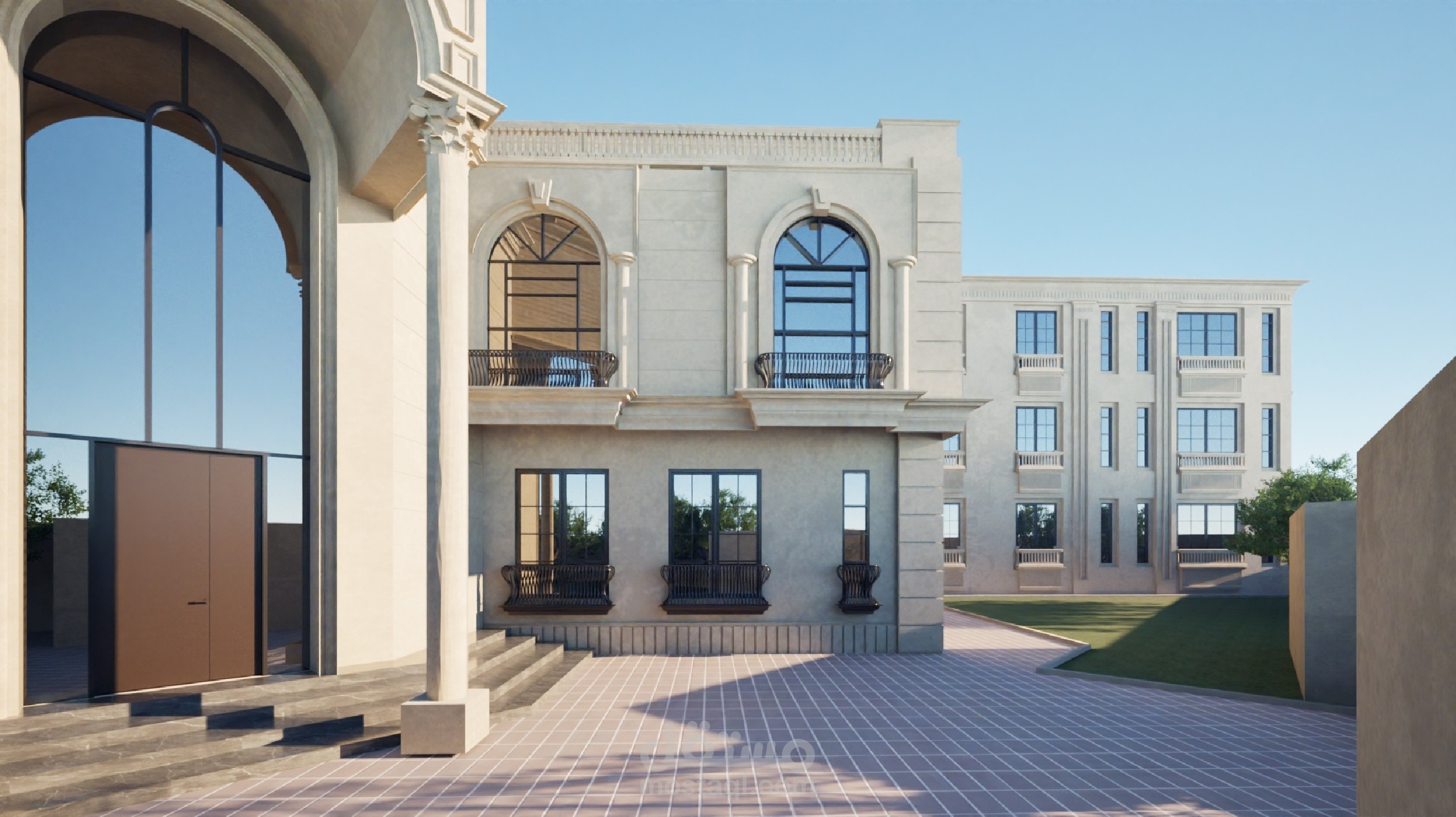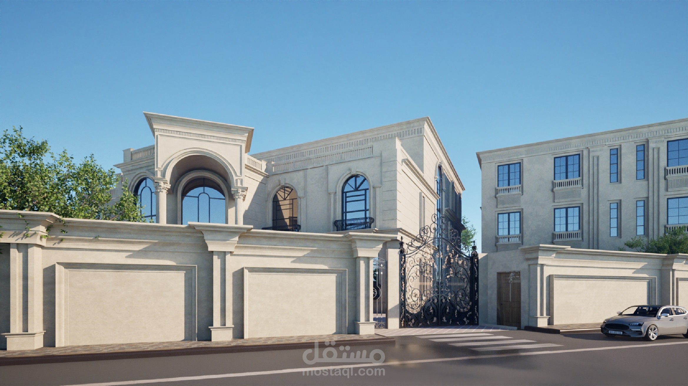 تصميم راقٍ يجمع بين الفخامة الكلاسيكية والحداثة المعمارية، يتكوّن المشروع من مبنيين متصلين بتناغم بصري ووظيفي يعكسان روح النمط النيو كلاسيك. تم التركيز على التناسب بين الكتل والفراغات مع واجهات أنيقة تعتمد على الأعمدة والزخارف الكلاسيكية المبسطة، مع توزيع إنارة يبرز التفاصيل المعمارية والملمس الحجري. التصميم الداخلي يجمع بين الهدوء والفخامة بخطوط ناعمة وألوان متوازنة، ليمنح إحساسًا بالفخامة العصرية والراحة السكنية في آنٍ واحد.