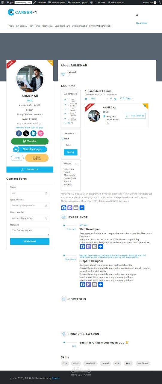تصميم صفحة شخصية تعرض معلومات الموظف بشكل منظم وواضح، تشمل الصورة الشخصية، النبذة التعريفية، الخبرات، المهارات، ووسائل التواصل. الصفحة متجاوبة مع جميع الأجهزة وسهلة التصفح، لتقديم صورة مهنية وجذابة للزوار.