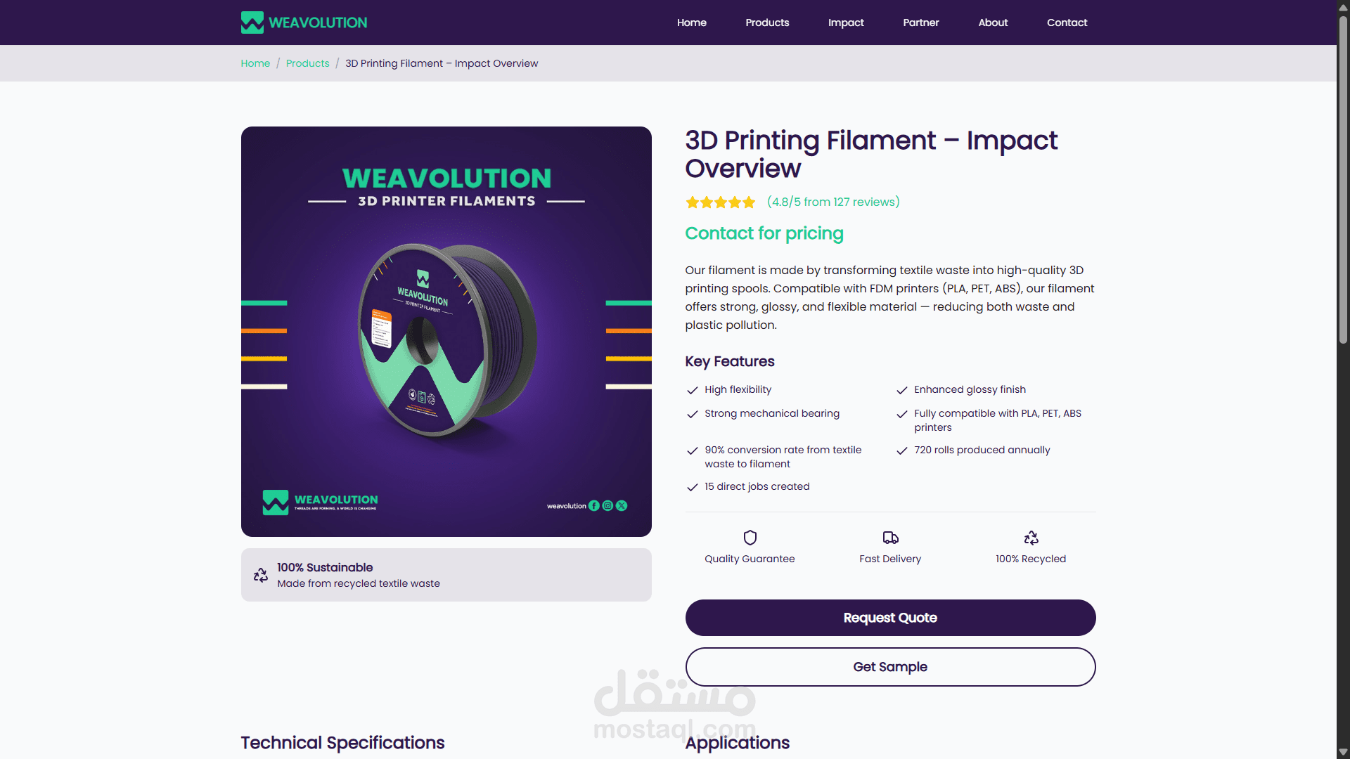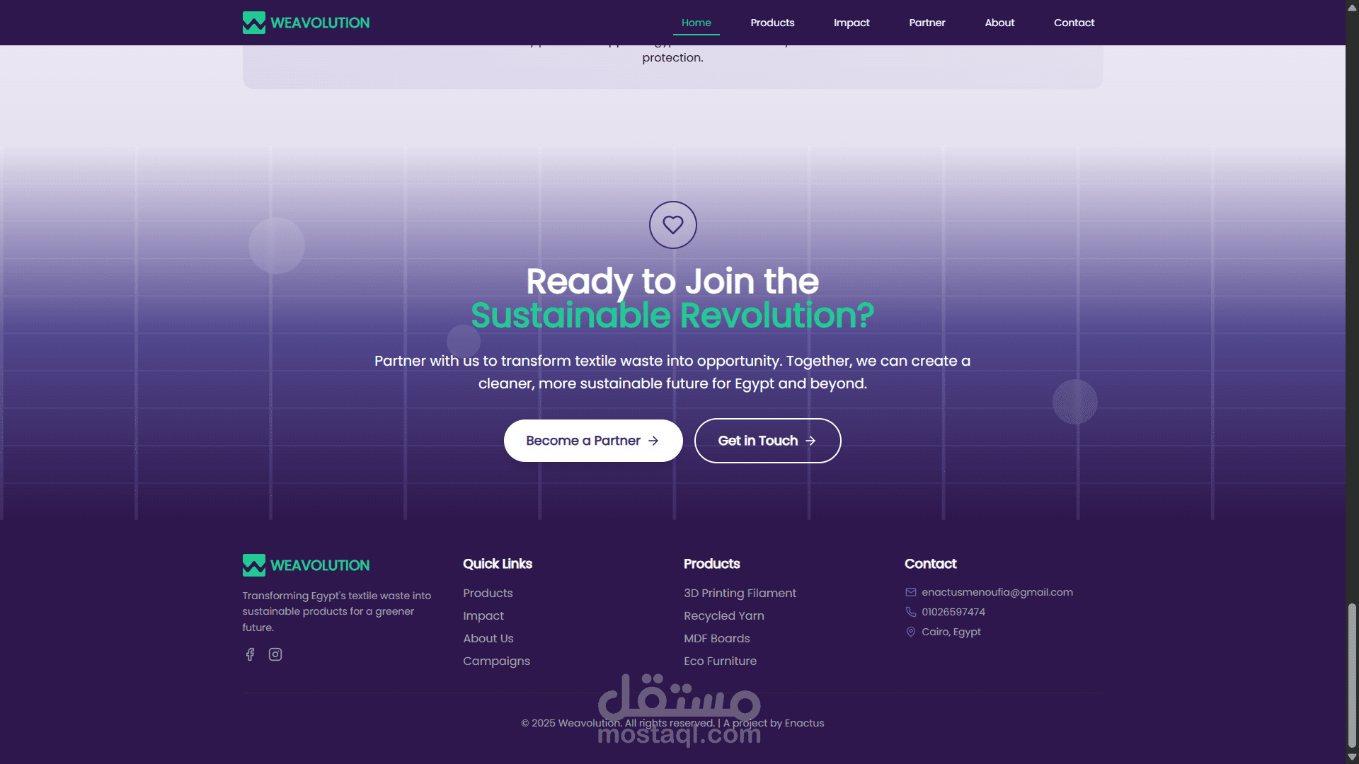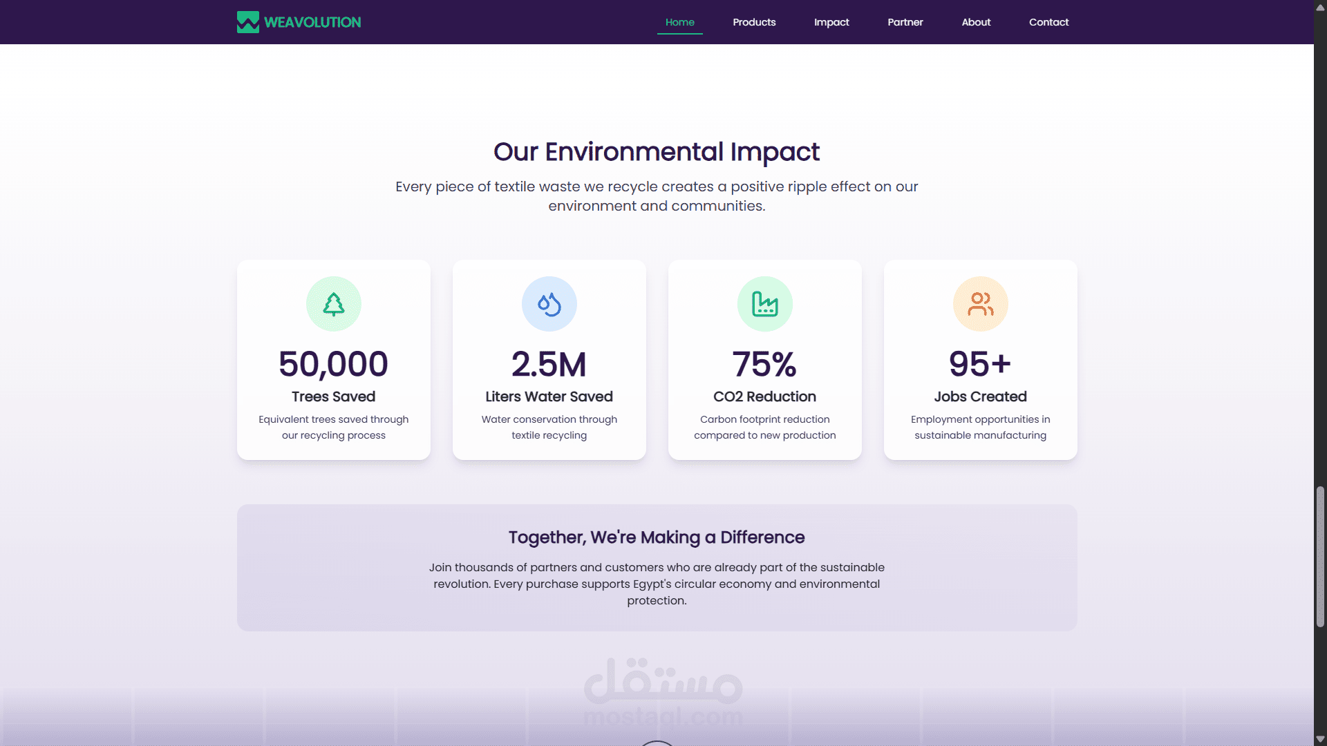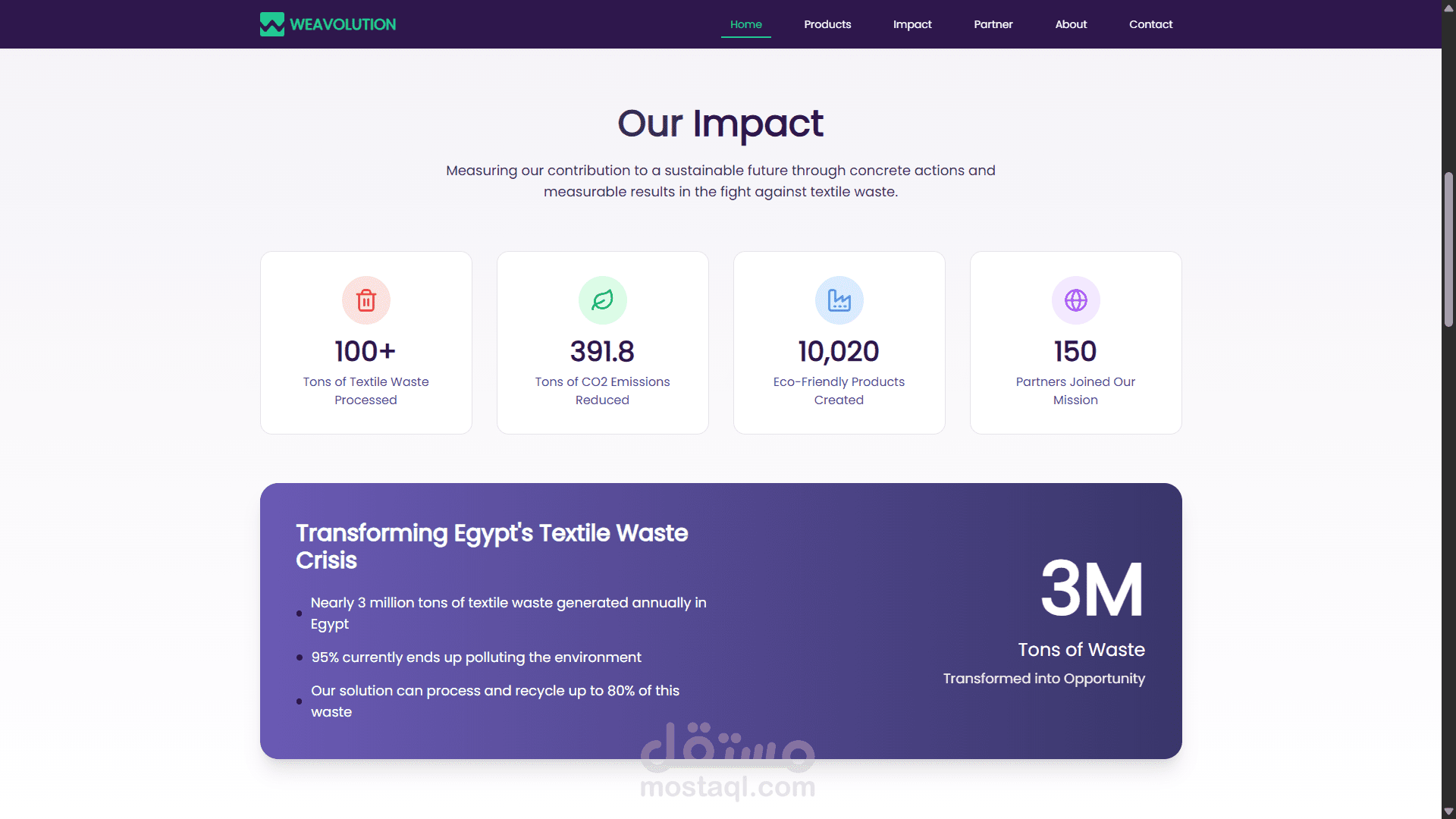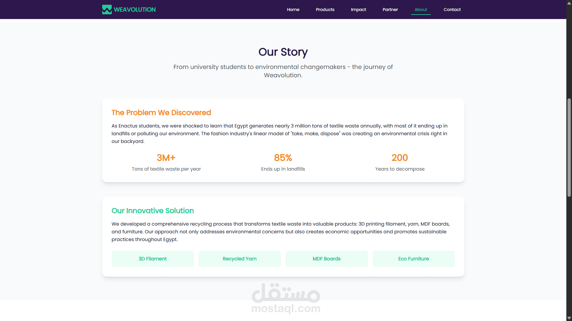 منصة ويب مستدامة تركز على إعادة تدوير نفايات المنسوجات وتحويلها إلى منتجات قيّمة مثل ألواح MDF، والخيوط، وخيوط الطباعة ثلاثية الأبعاد. تم تطويرها بتصميم أنيق وداكن، وتعرض إحصائيات الأثر البيئي، ونماذج للمنتجات الصديقة للبيئة، وتهدف إلى تعزيز الوعي البيئي.