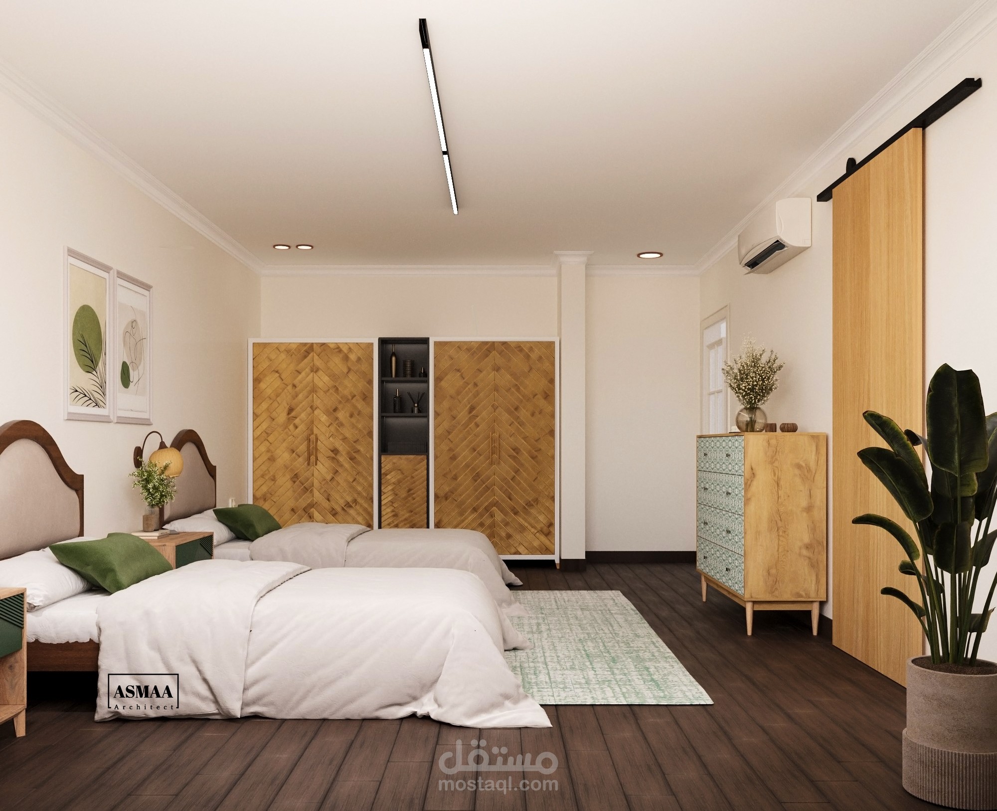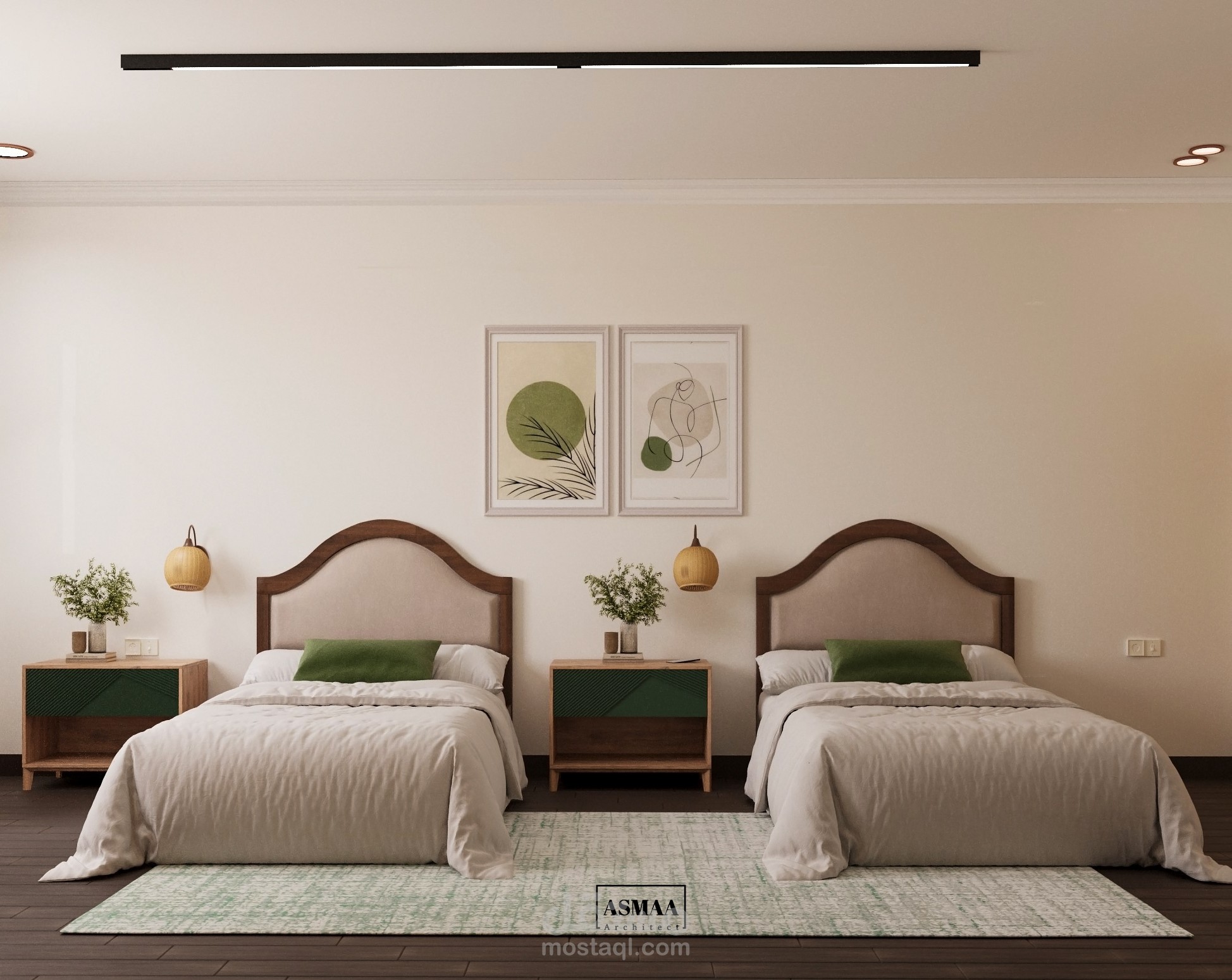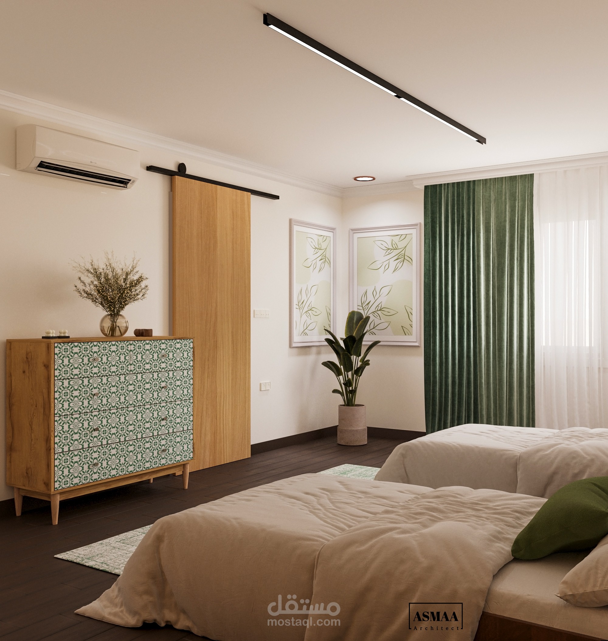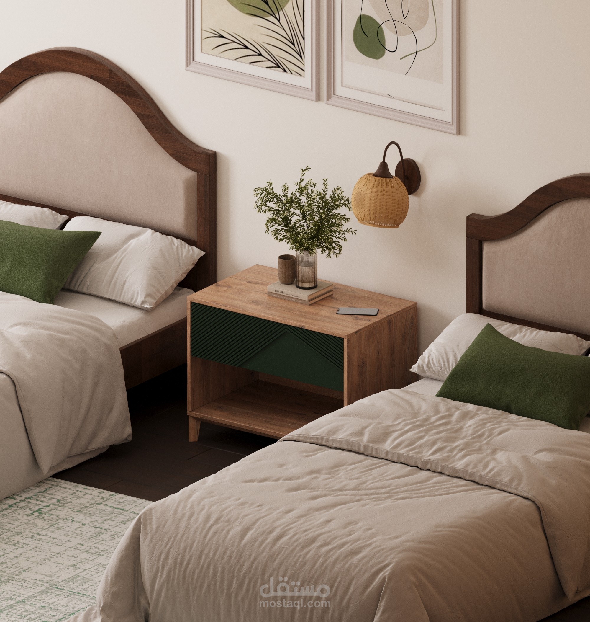 تصميم وتنفيذ موديل ثلاثي الأبعاد لغرفة نوم بسريرين يتميز بالبساطة والأناقة، مع اختيار ألوان هادئة تمزج بين الأخضر الزيتي والبيج لتمنح إحساسًا بالراحة والانسجام.