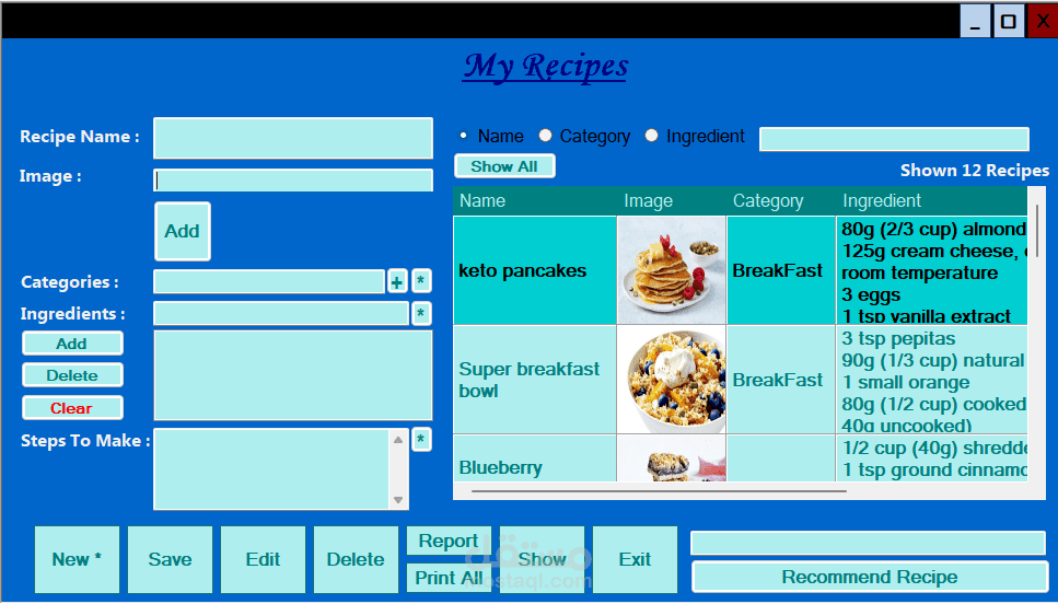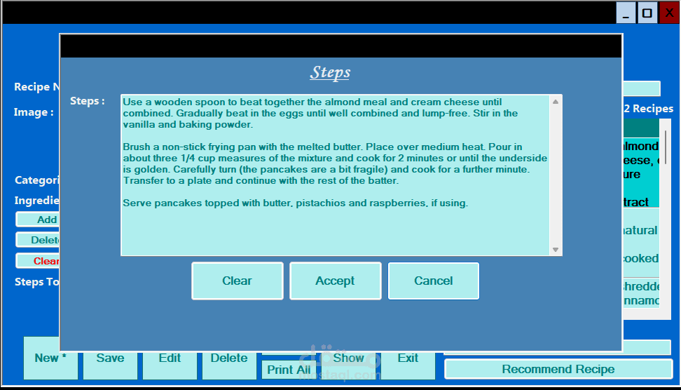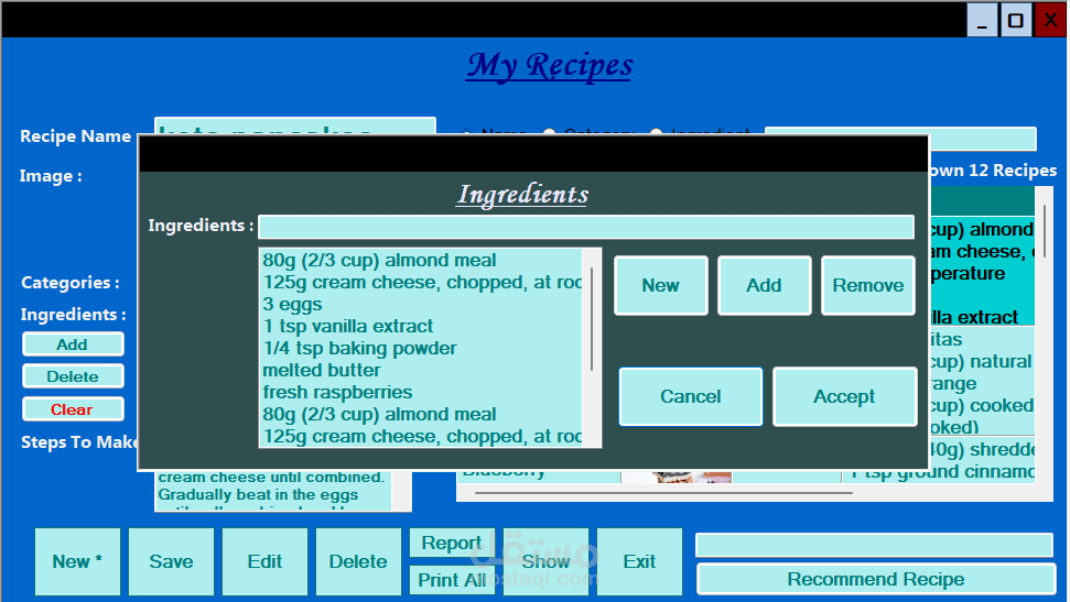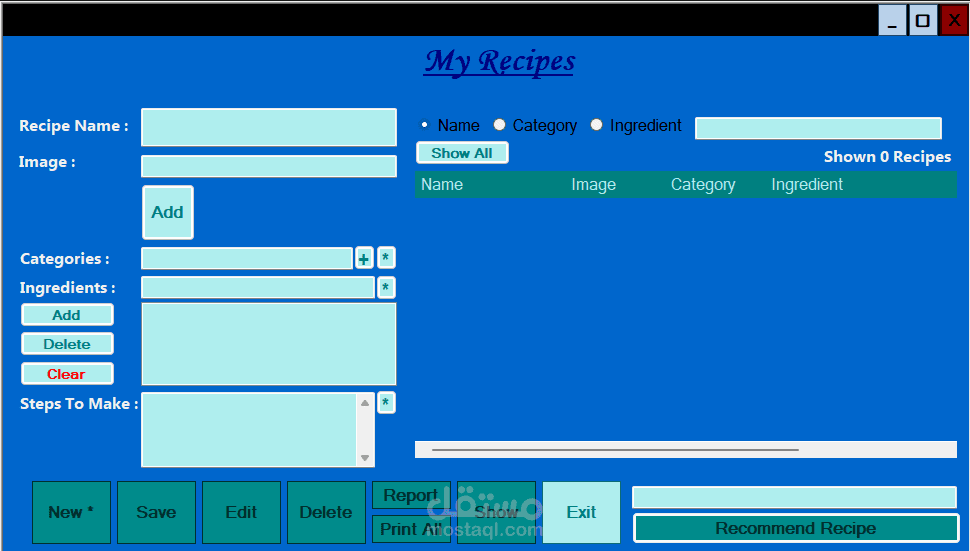 طورت تطبيق مكتبي عملي وسهل الاستخدام يهدف إلى تسهيل إدارة وصفات الطعام، سواء كنت طاه محترف، مدون في مجال الطهي، أو حتى هاوي يحب تجربة وصفات جديدة. التطبيق يساعدك على تنظيم وصفاتك، استعراضها، والبحث بينها بكل سهولة.