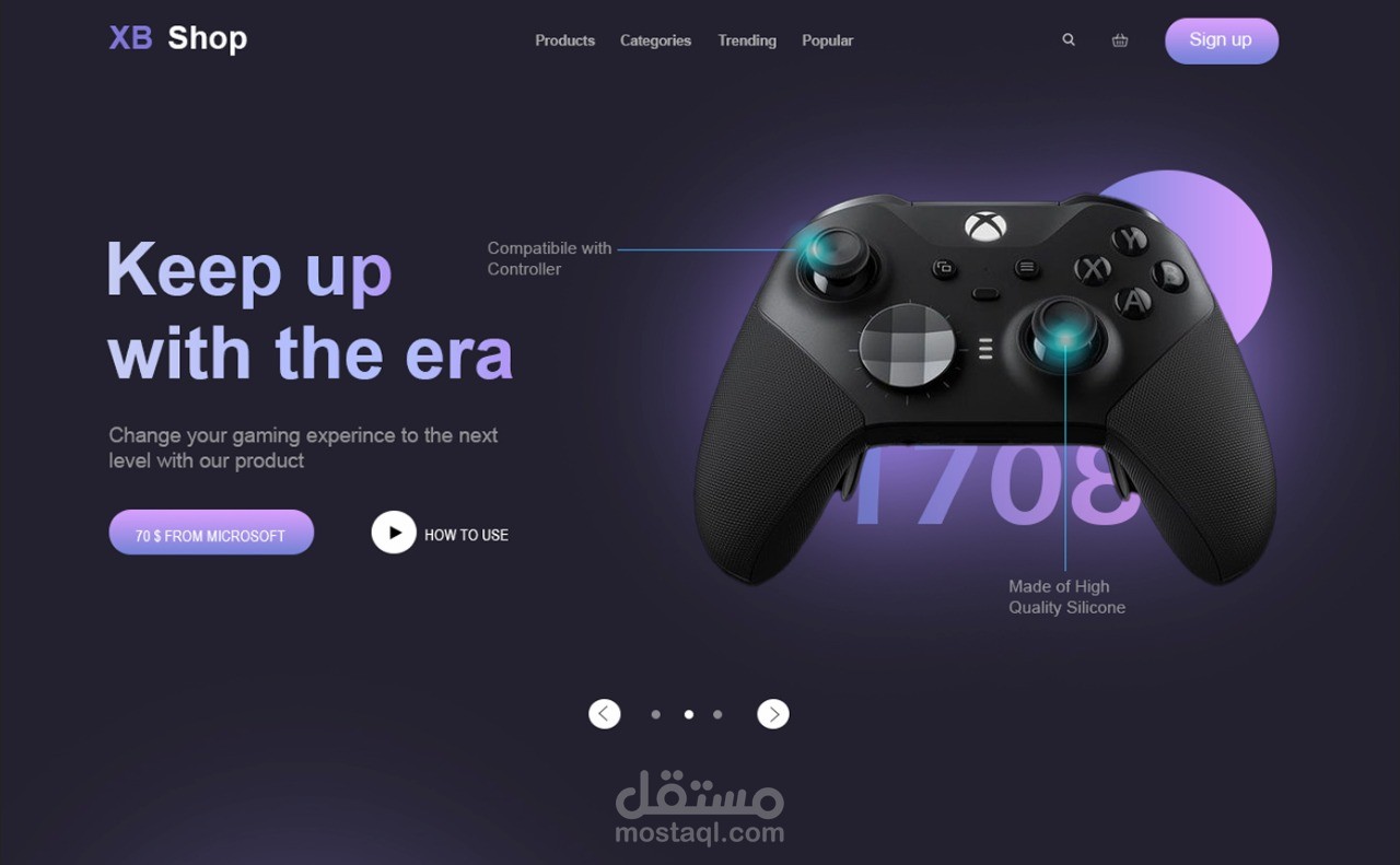 A main promotional section showcasing the Xbox controller, highlighting key features such as compatibility with multiple devices and being made of high-quality silicone.